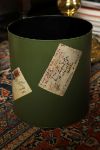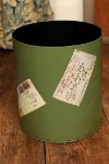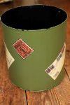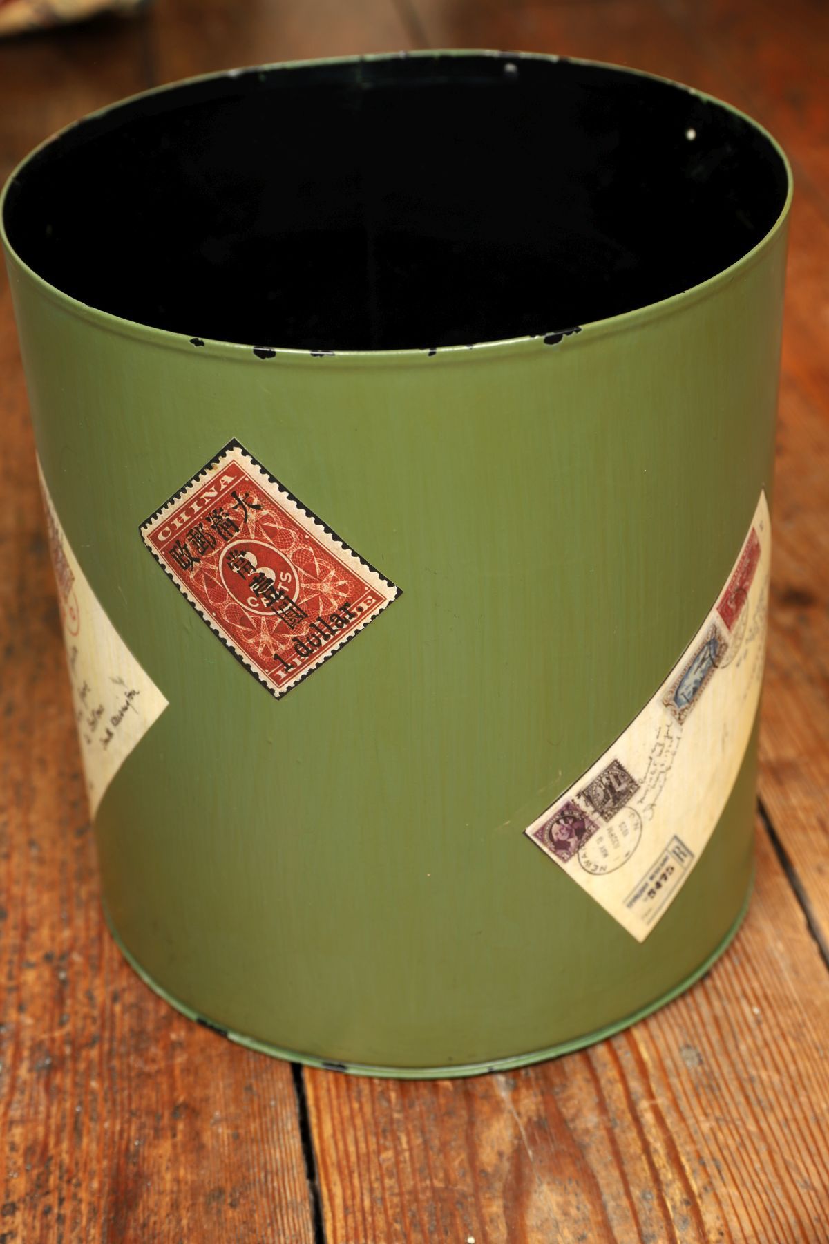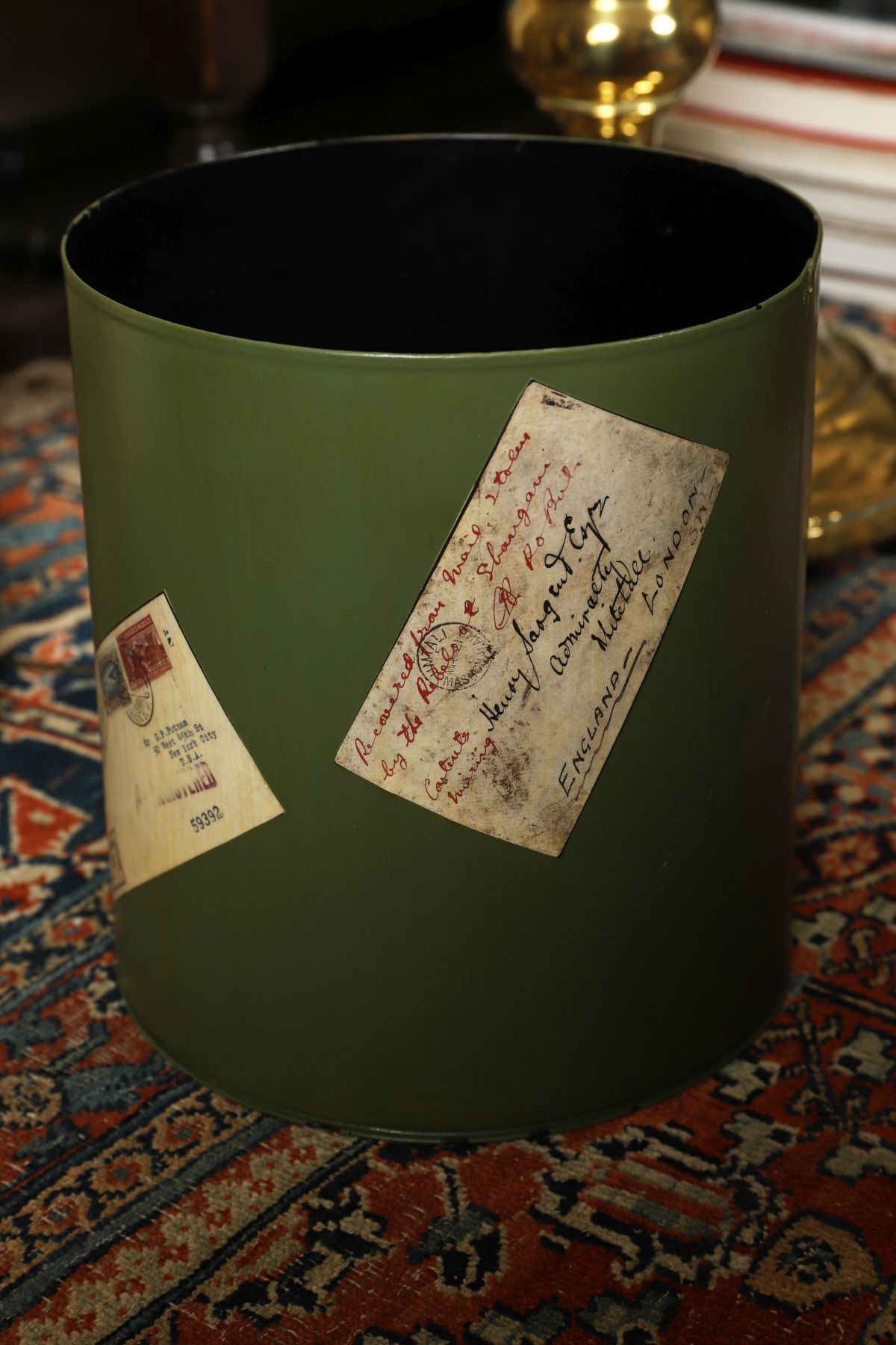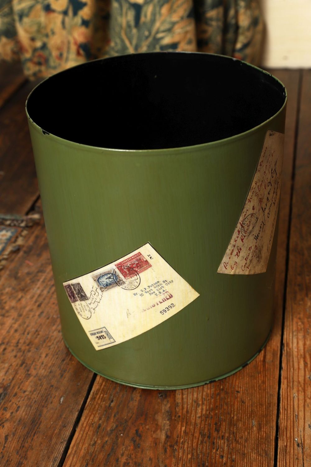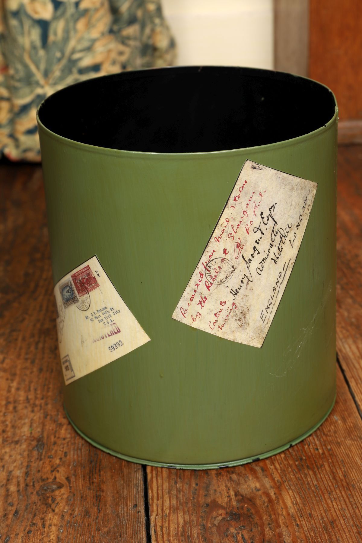 A toleware wastepaper basket of cylindrical form, painted green, the exterior applied with period labels and inscriptions. 20th century.