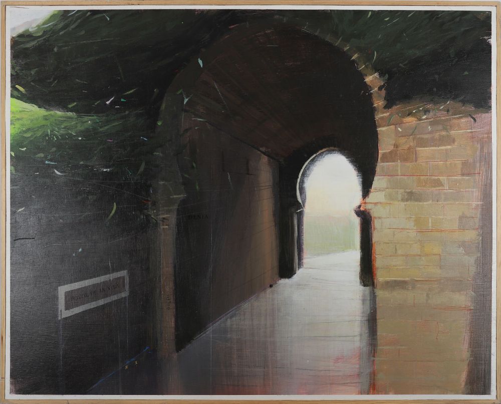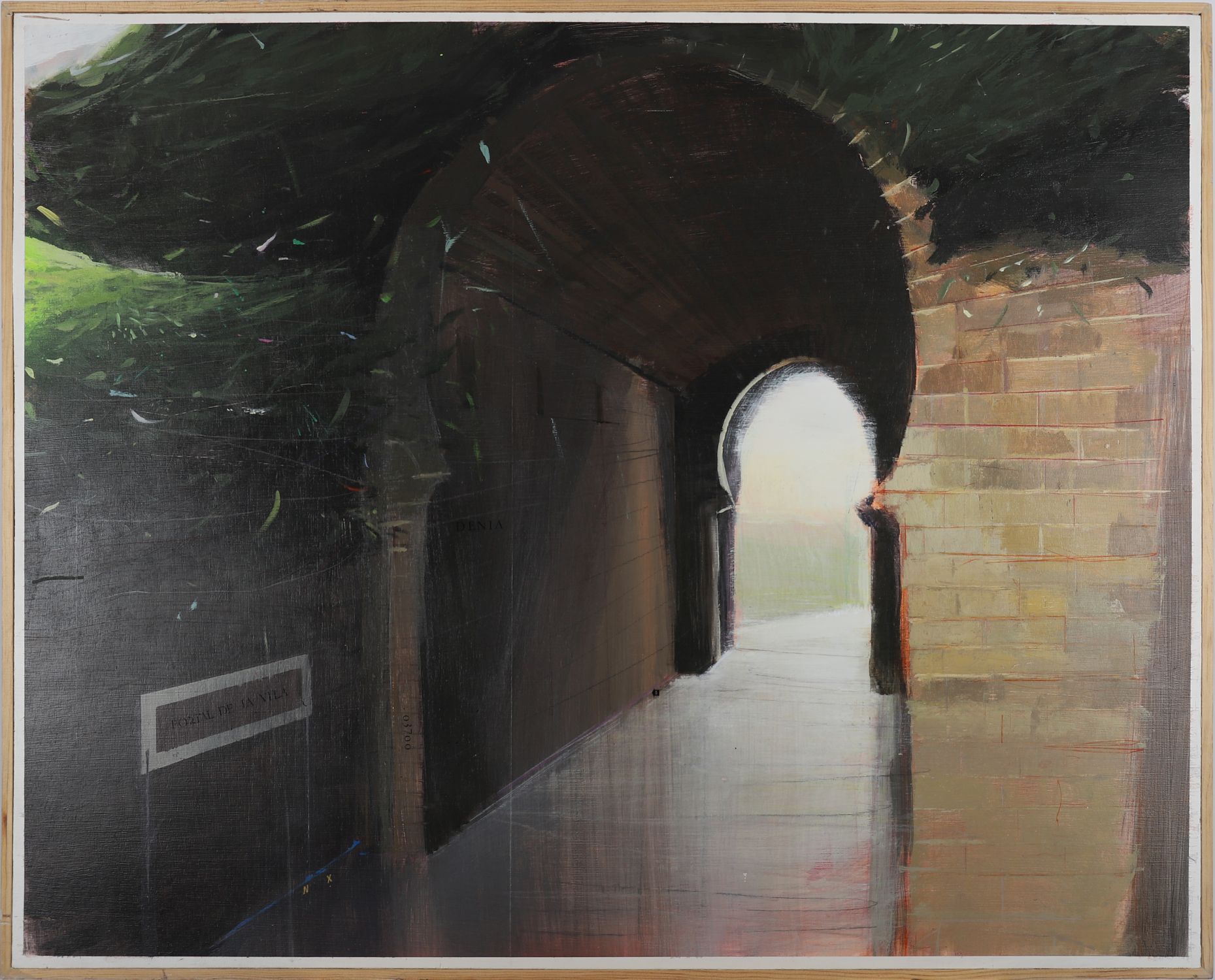 depicting an abstracted arched structure in tonal shades with dynamic light effects. Contemporary style. Signed oil on board.
