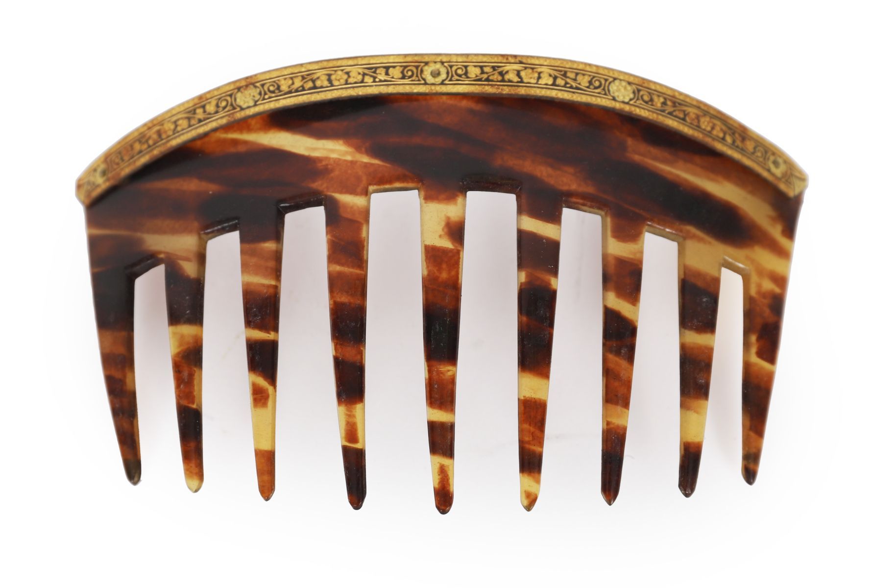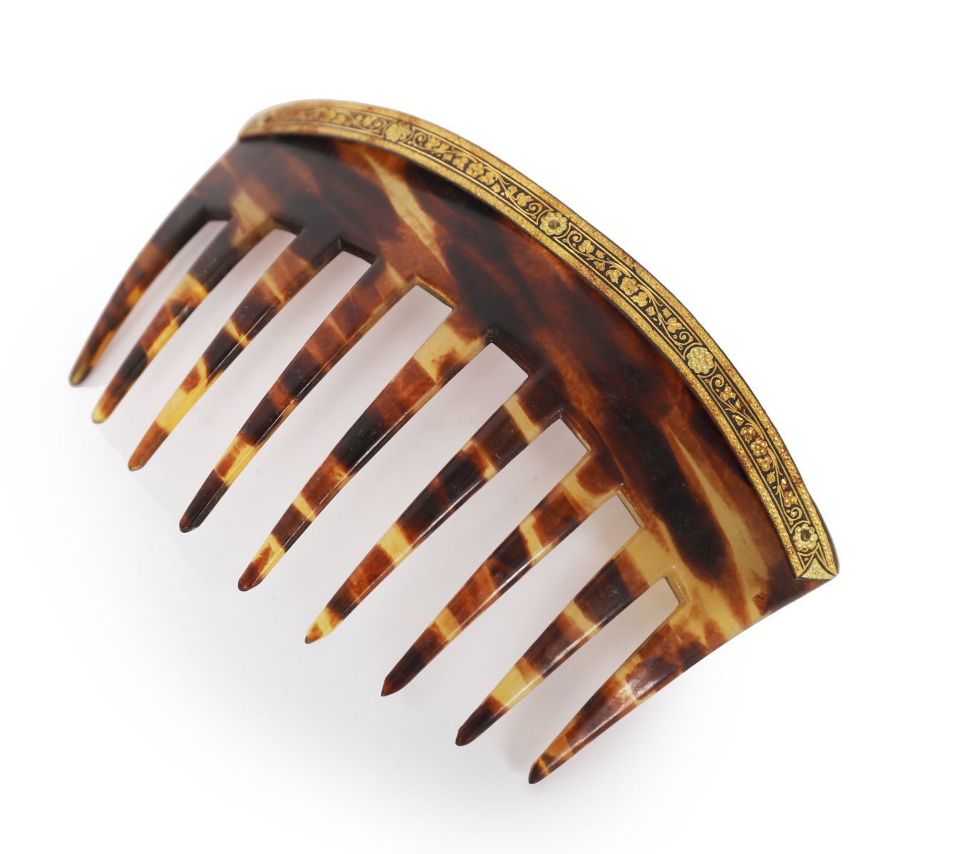 A 19th-century tortoiseshell hair comb with arched crest, applied with engraved gilt metal floral border.
