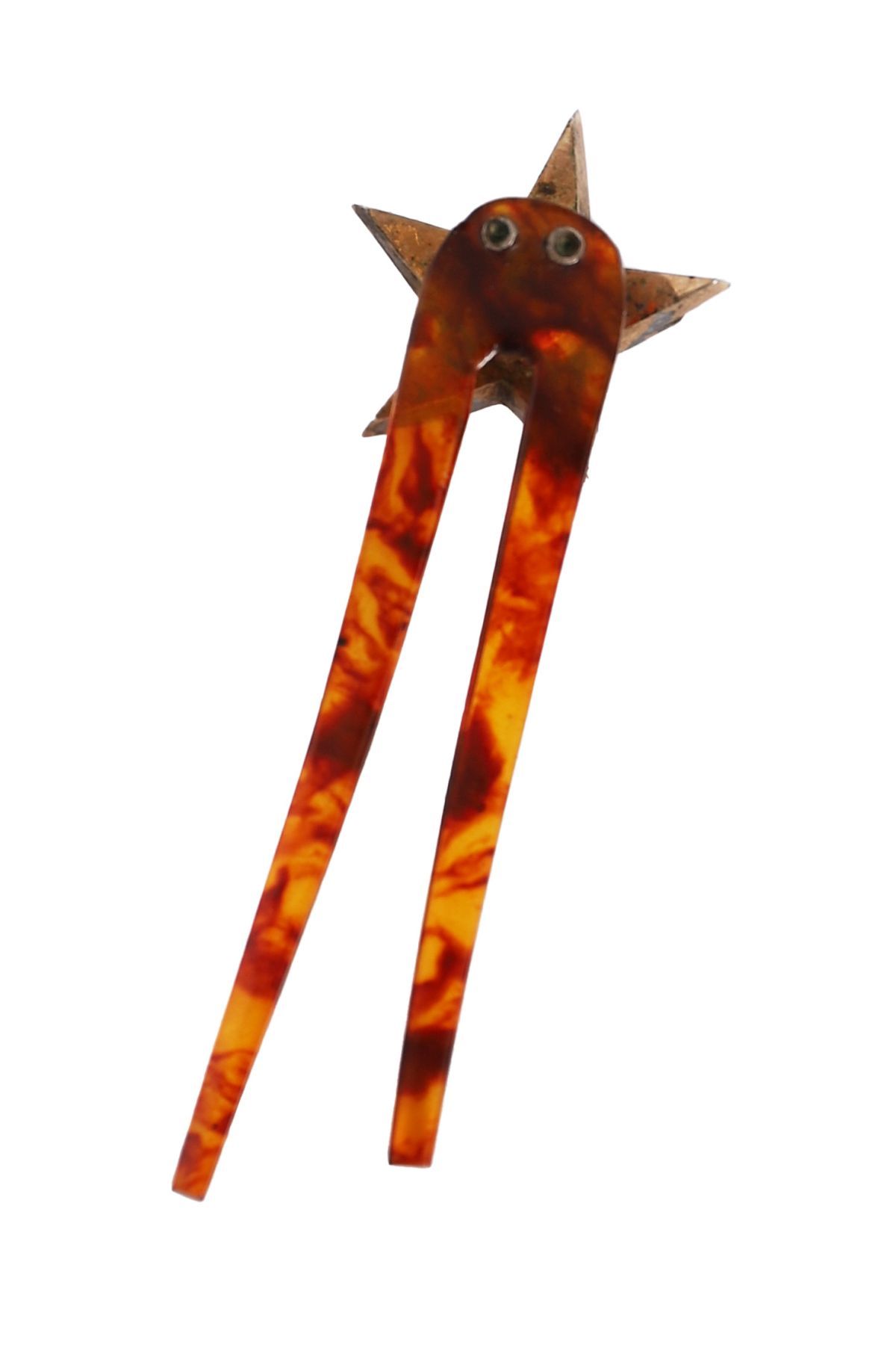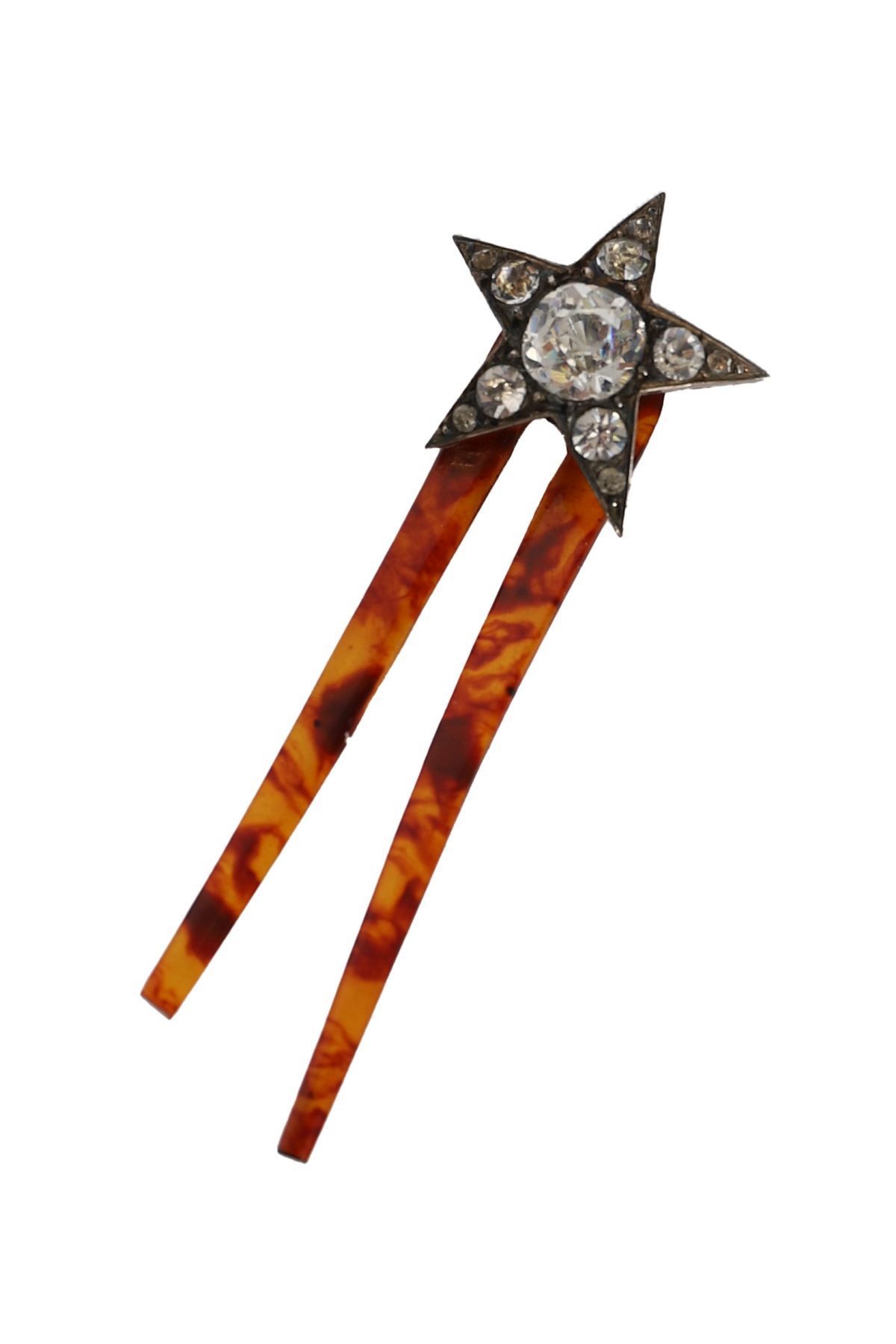 A tortoiseshell hair ornament mounted with a star-shaped silver setting, the stones foil-backed in the traditional manner. The ornament mounted on twin tortoiseshell prongs.