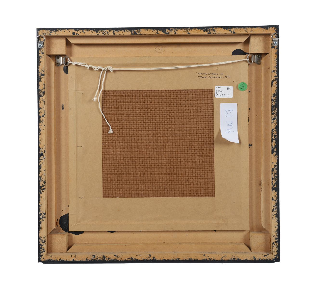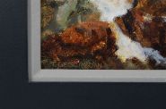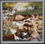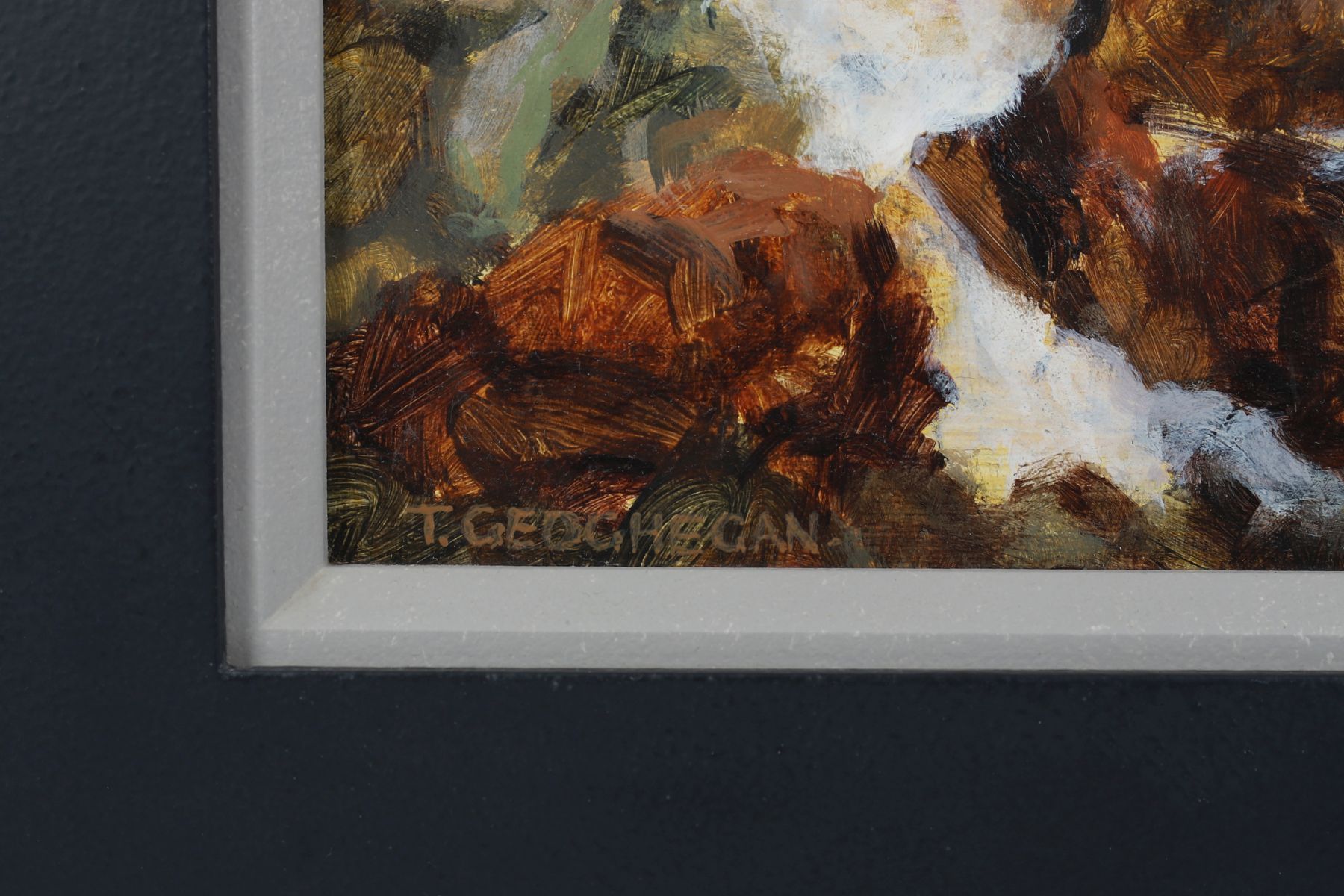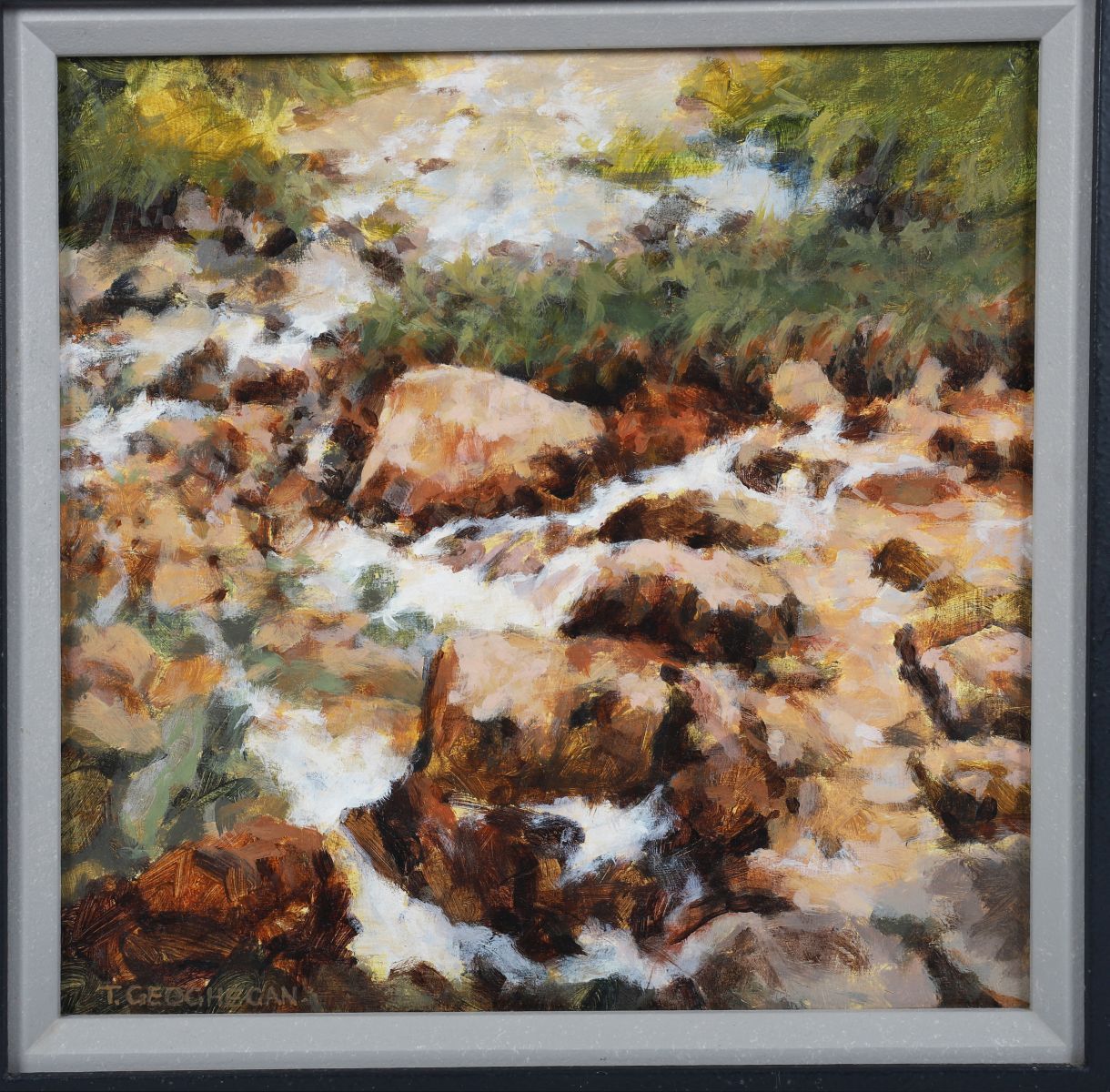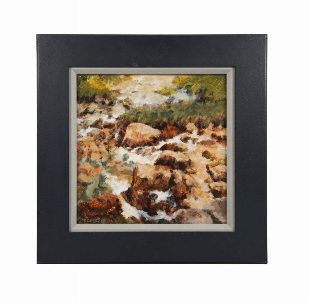 Oil on board depicting a rushing mountain stream over rocks, painted with Geoghegan’s lively brushwork and rich tonal contrasts. Signed lower left.