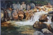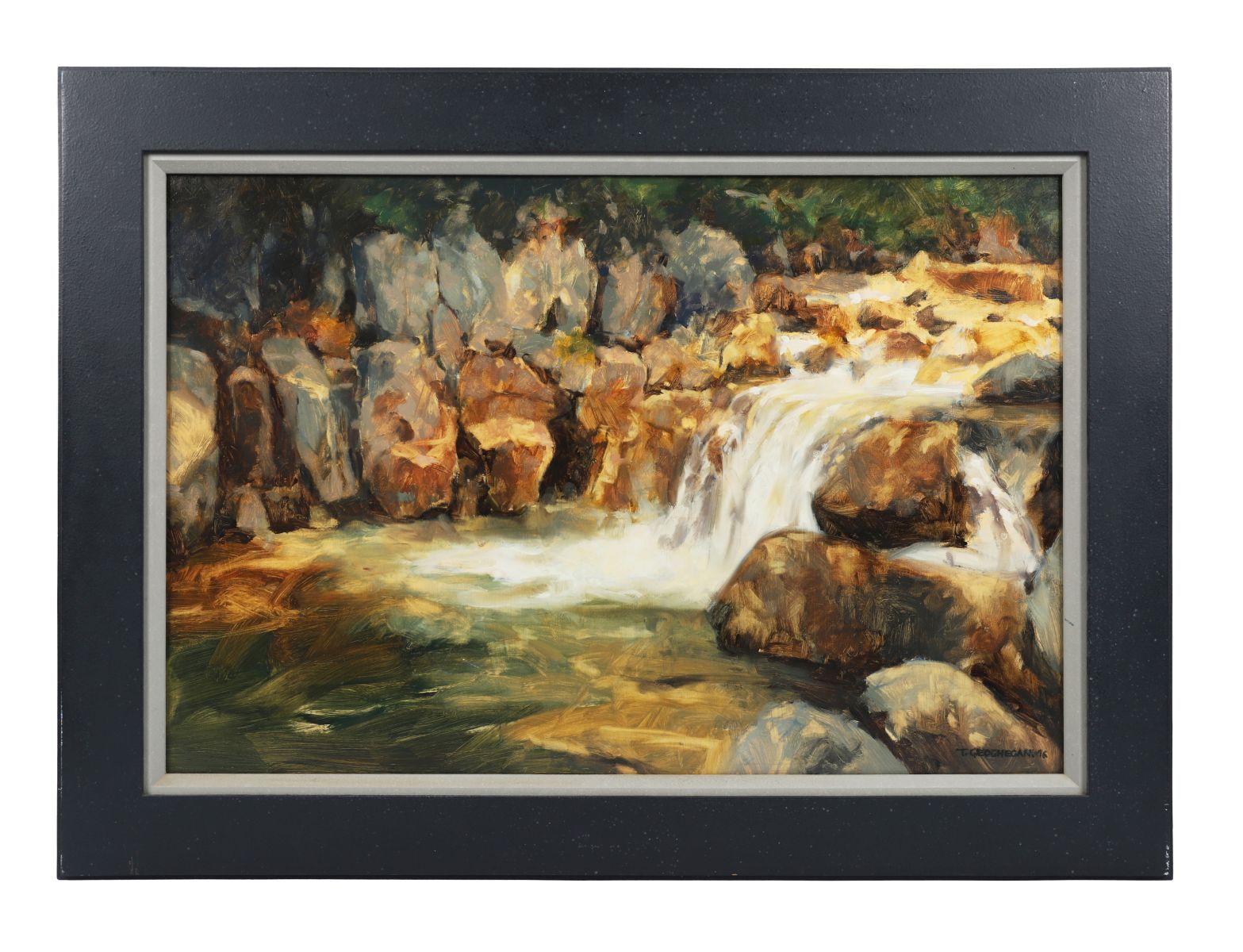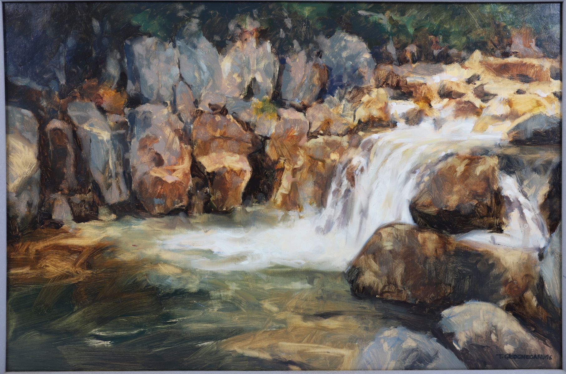 A richly atmospheric landscape in which Geoghegan captures the luminous movement of water tumbling through a rocky pool. The artist’s vigorous brushwork and glowing palette convey the shifting reflections, submerged tones, and crystalline clarity of the stream. Textural contrasts between rugged stone and fluid water demonstrate Geoghegan’s mastery in rendering natural drama