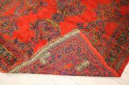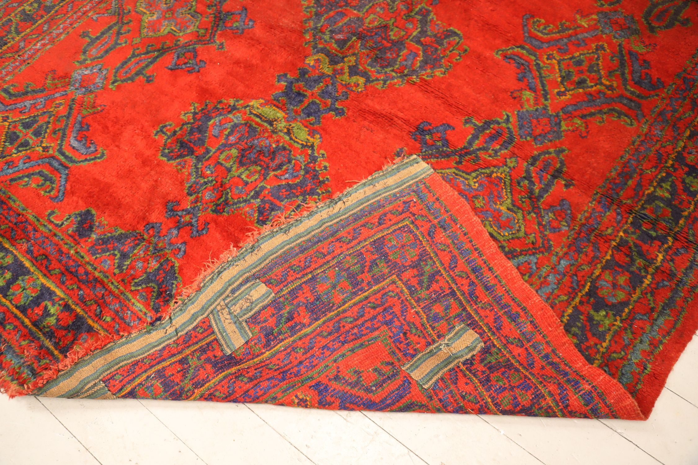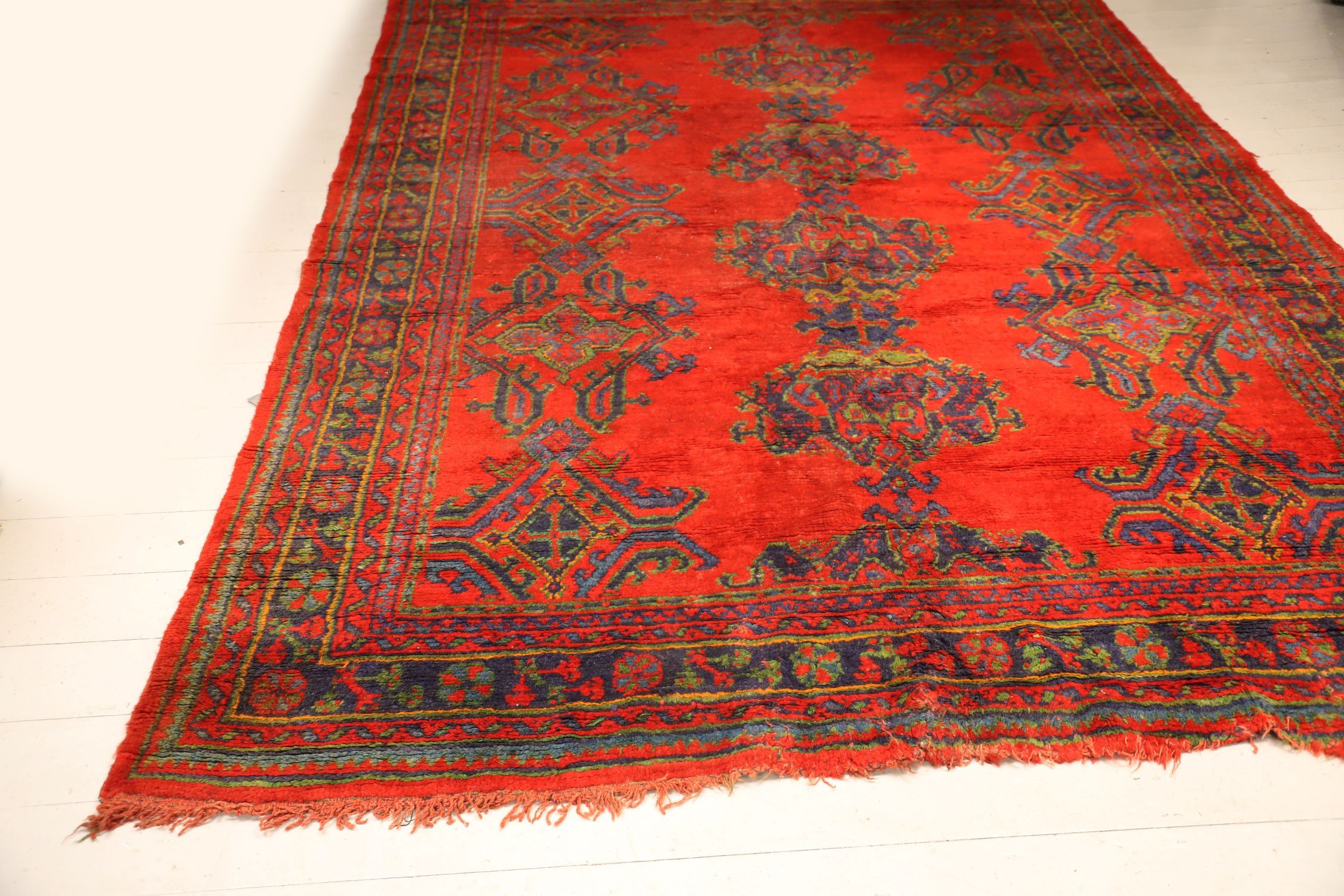 A traditional Turkish wool carpet, hand-knotted with a vibrant red ground, featuring a central column of stylised floral medallions and geometric motifs throughout. Framed by a broad floral and rosette border in blue, green, and yellow tones.