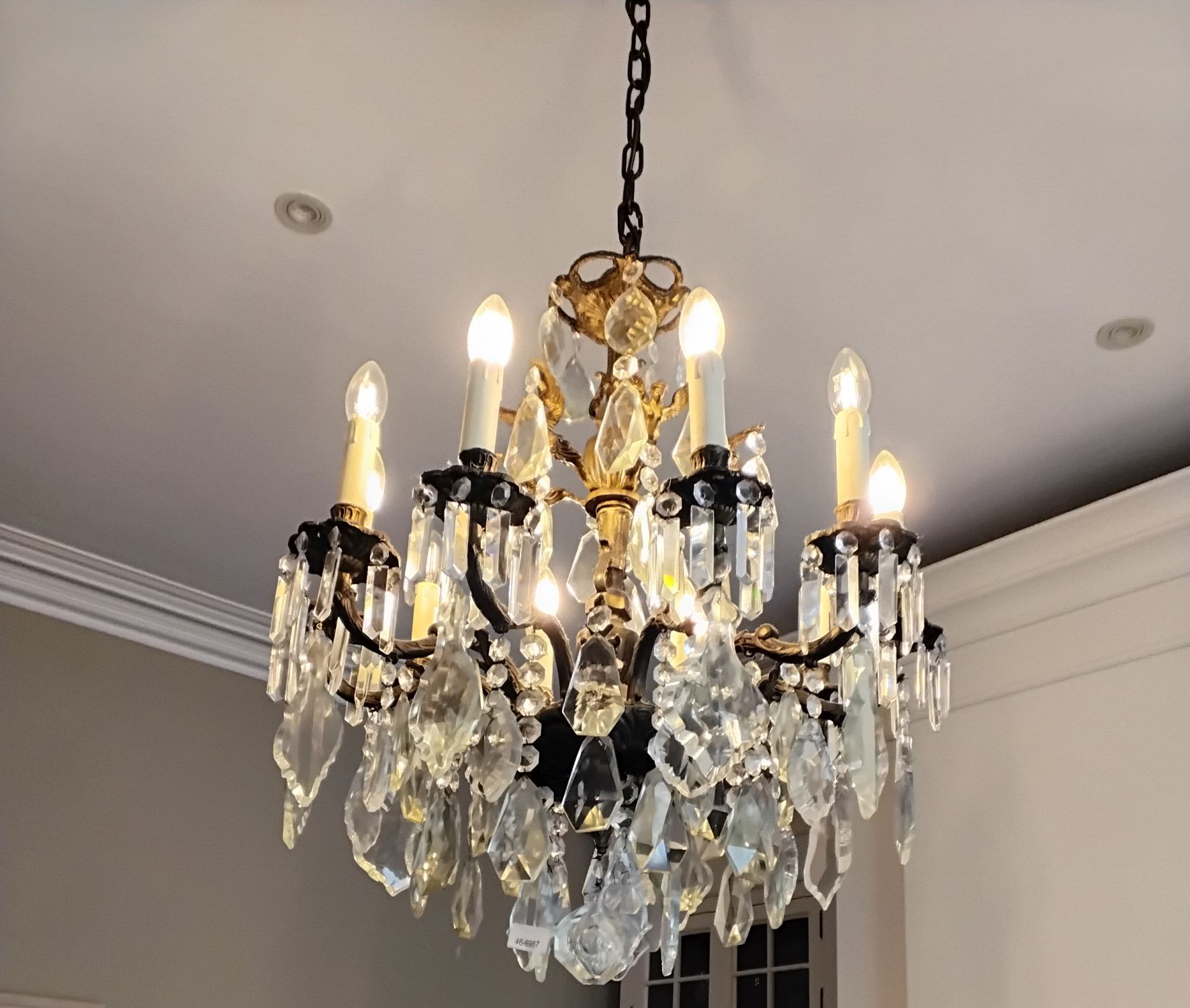 A large twelve-branch chandelier with gilt metal frame and faceted cut-glass drops, arranged in tiers with candle-style sconces and richly dressed with pendants and swags — a bold and traditional ceiling light.