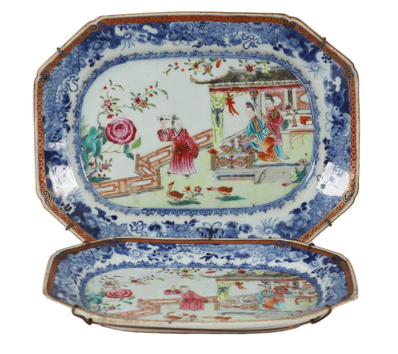 A pair of 18th-century Chinese porcelain platters of octagonal form, decorated in polychrome enamels with figural courtyard scenes, floral motifs, and diaper-pattern borders. Qing Dynasty, 18th century.