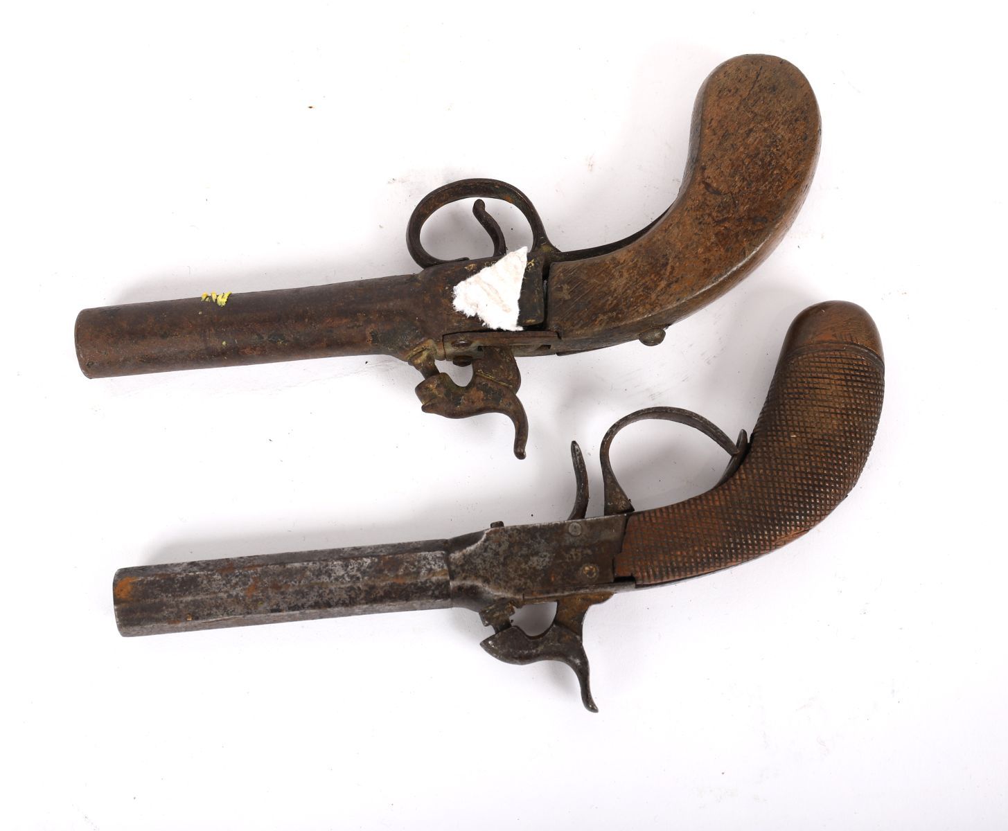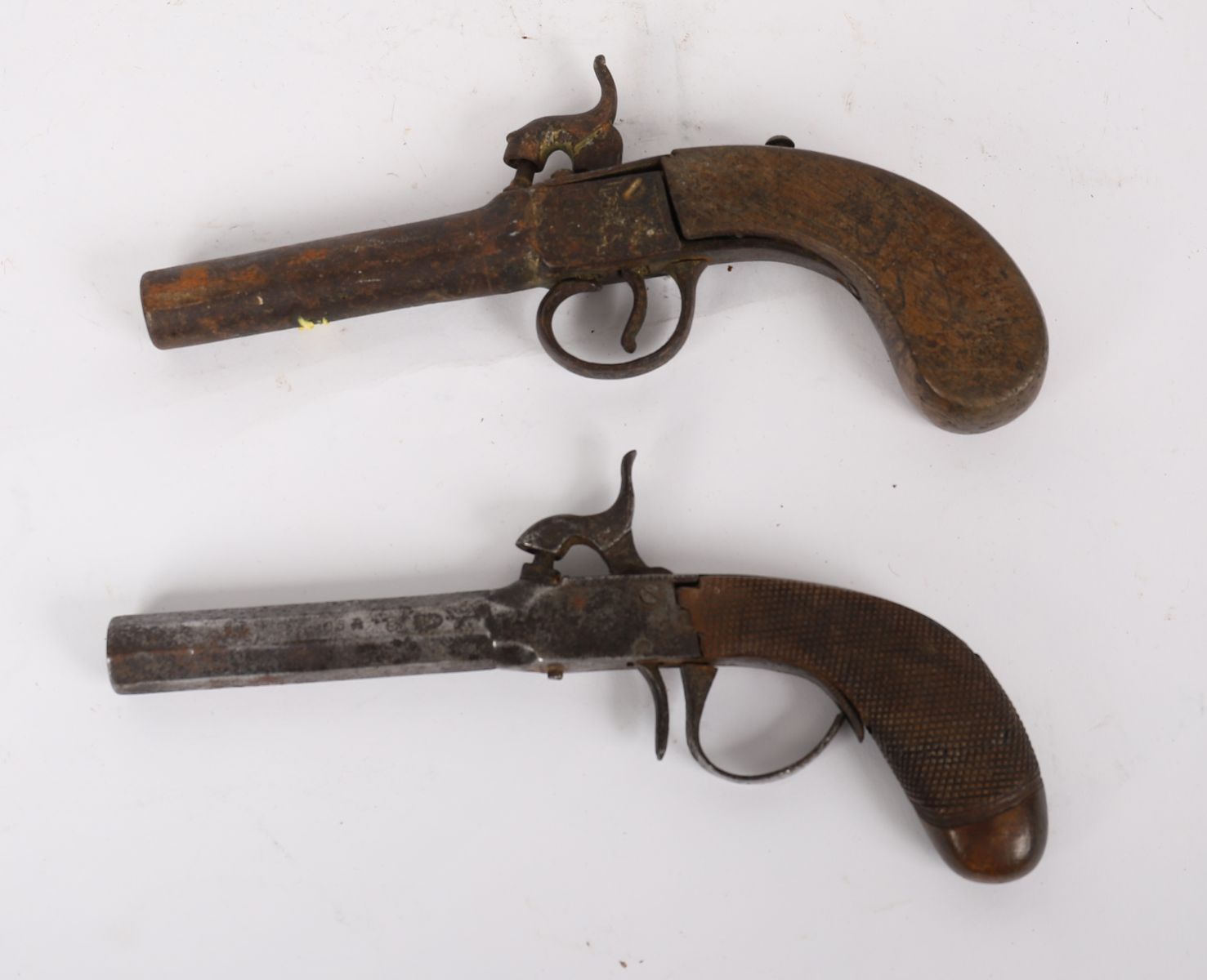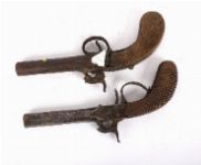 Two small 19th-century double-trigger percussion pistols with iron barrels and wooden grips.