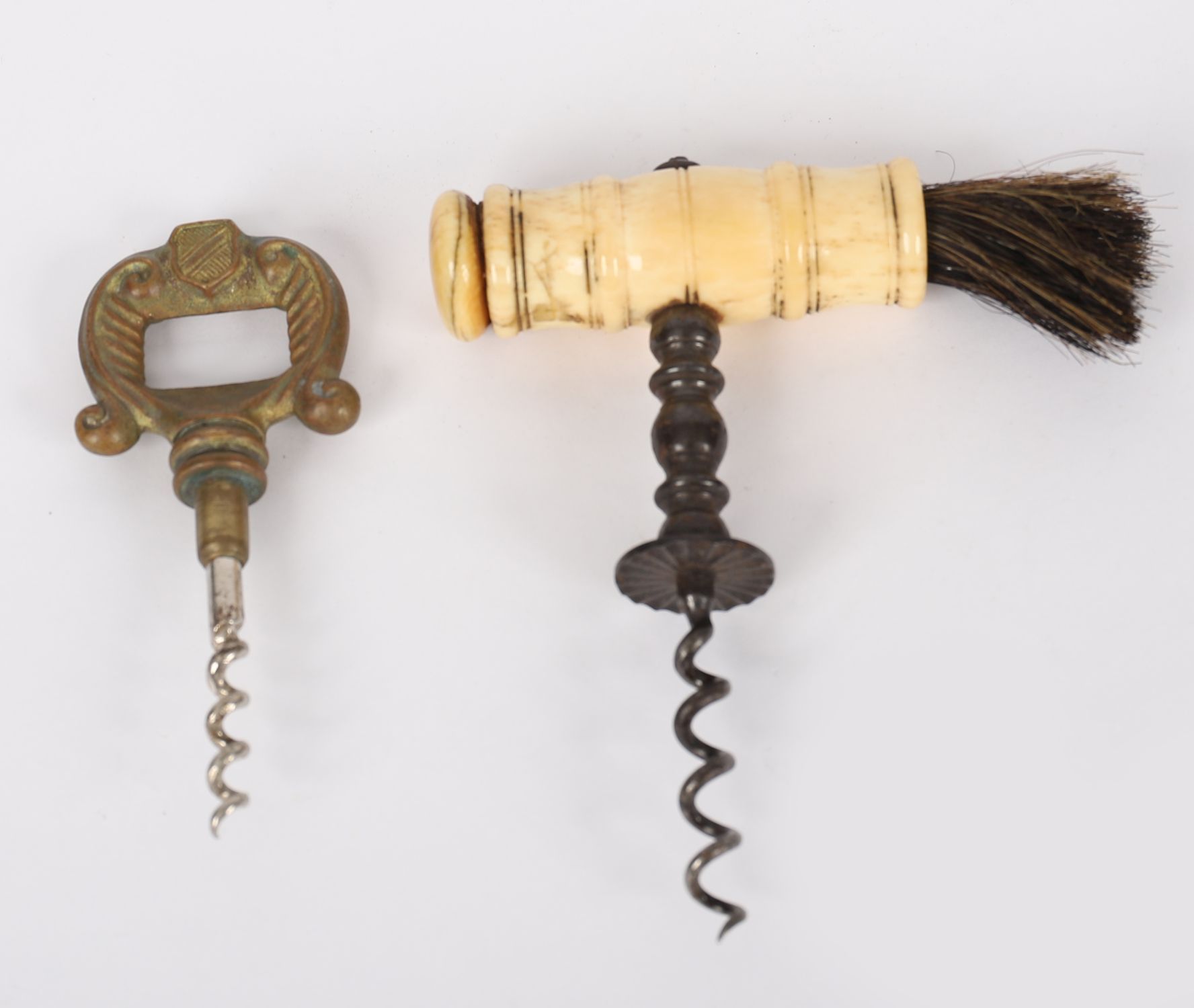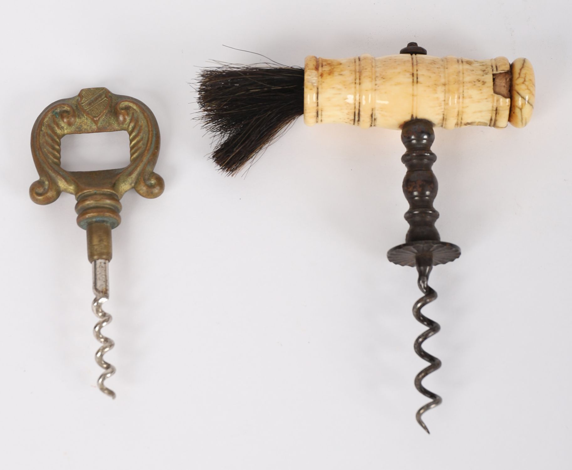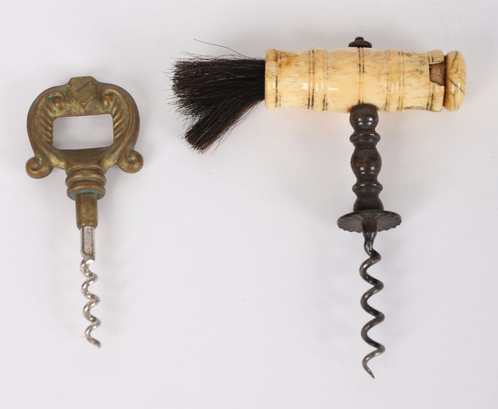 A pair of 19th century corkscrews, comprising a brass example with shaped openwork handle, and a bone-handled example with brush terminal.