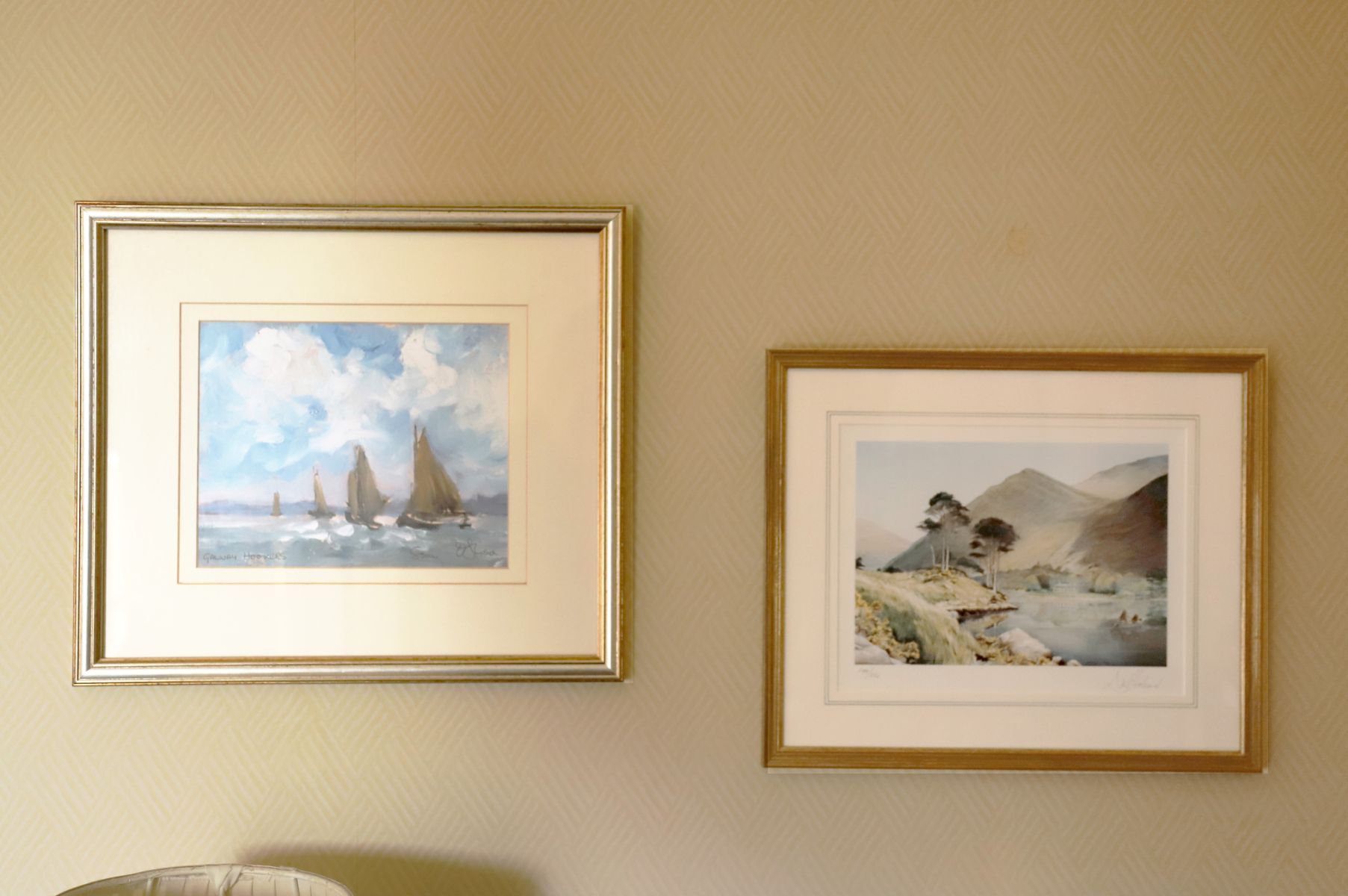 A pair of framed prints depicting Galway Hooker sailing vessels, each showing traditional Irish maritime scenes.