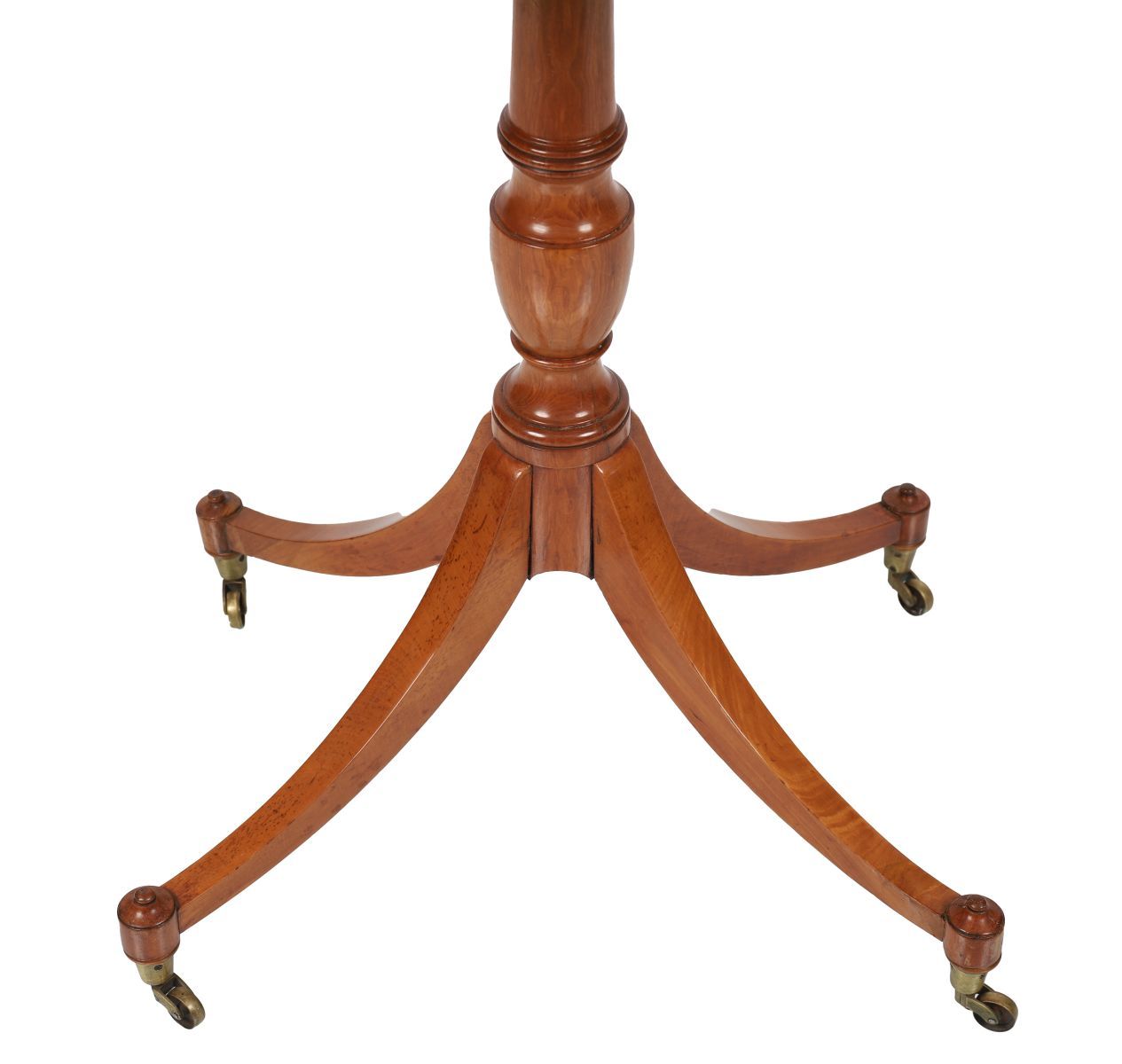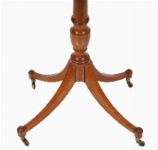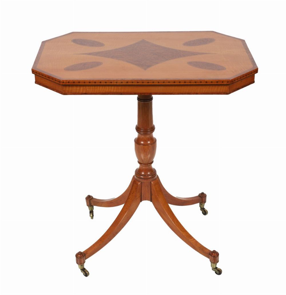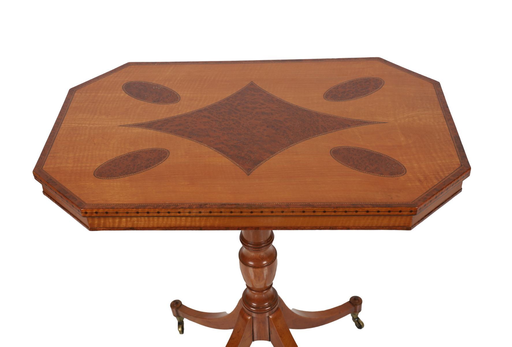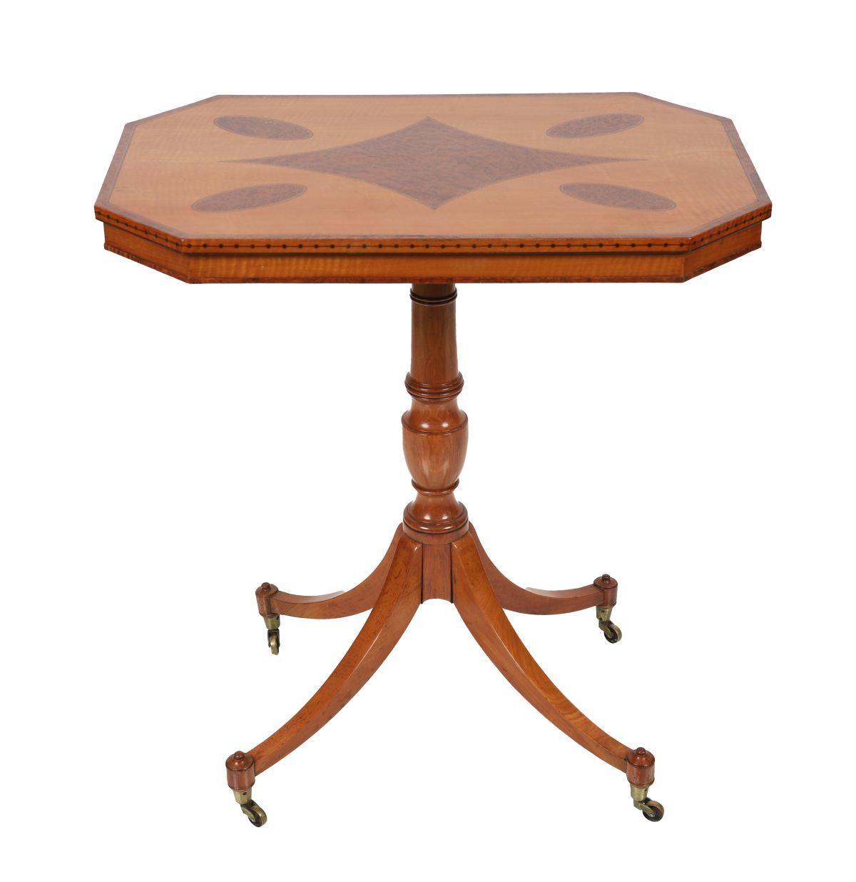 A 19th-century satinwood and amboyna centre table of octagonal form, the top inlaid with radiating panels and oval reserves, raised on a turned pedestal with tripod base on brass castors.