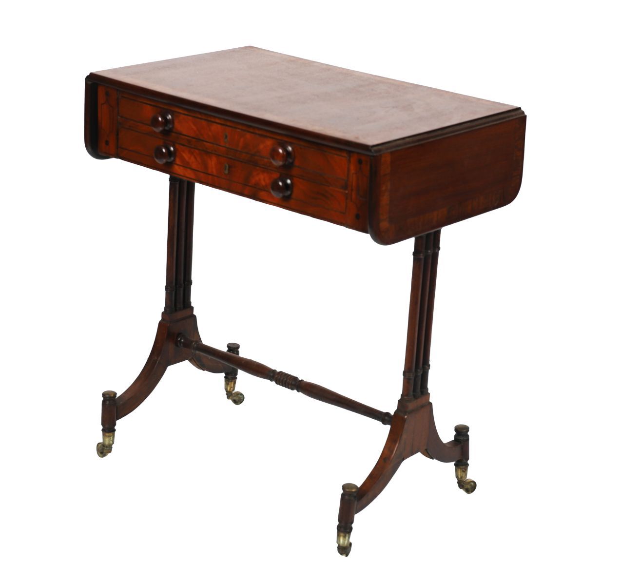 Early 19th century. A rare small Regency period mahogany sofa table, fitted with two drawers and opposing dummy drawers, on lyre-form end supports united by a turned stretcher, raised on brass castors.