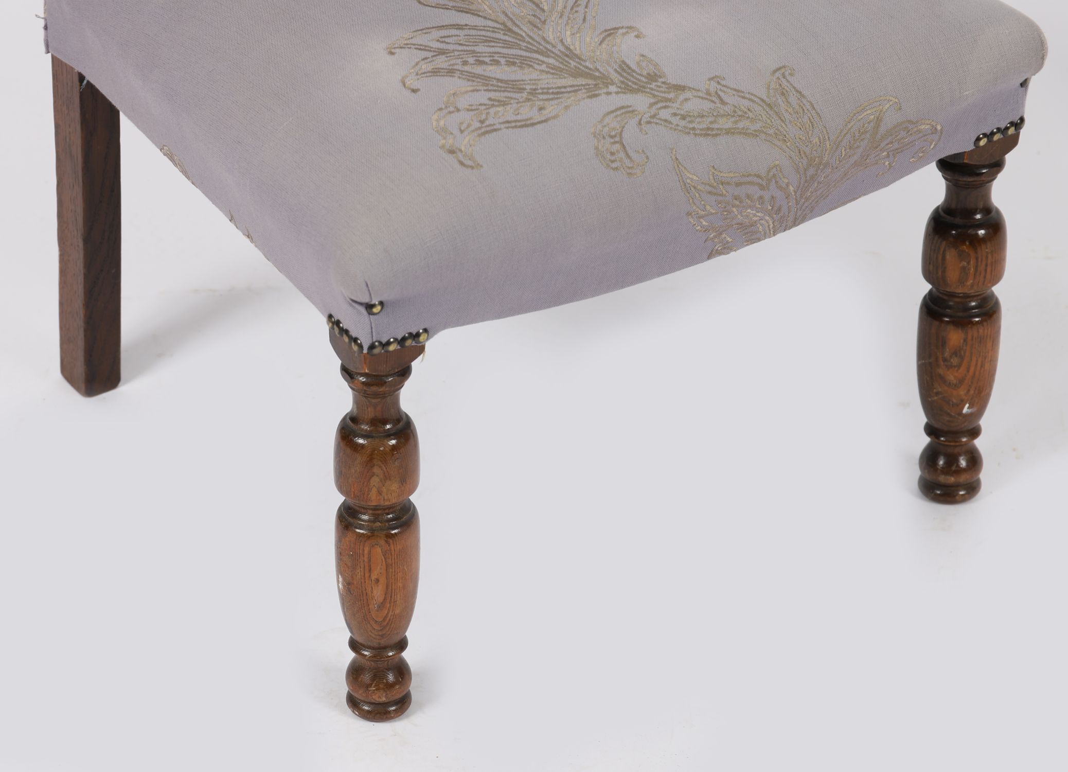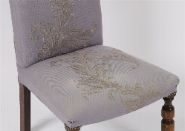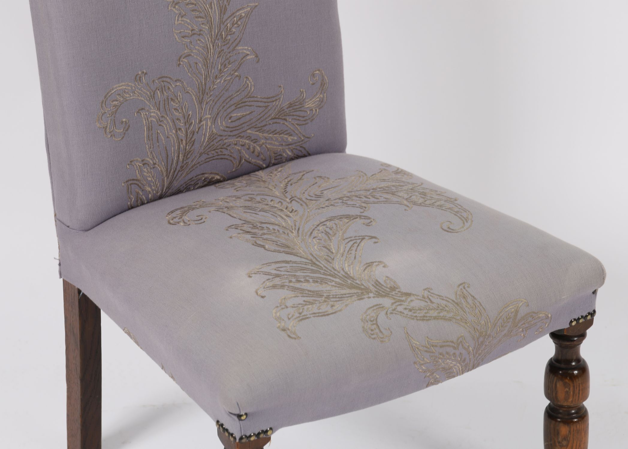A side chair with padded back and seat upholstered in lilac fabric with oversized acanthus scroll embroidery, raised on turned legs — soft in tone with a bold textile motif.