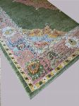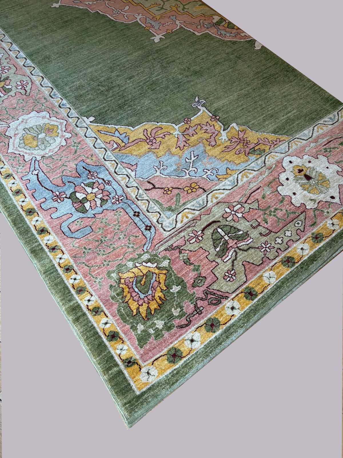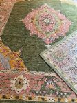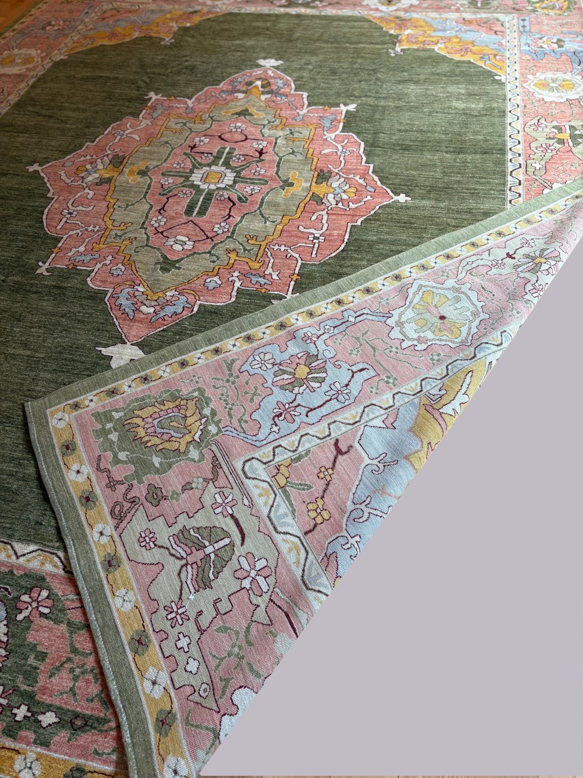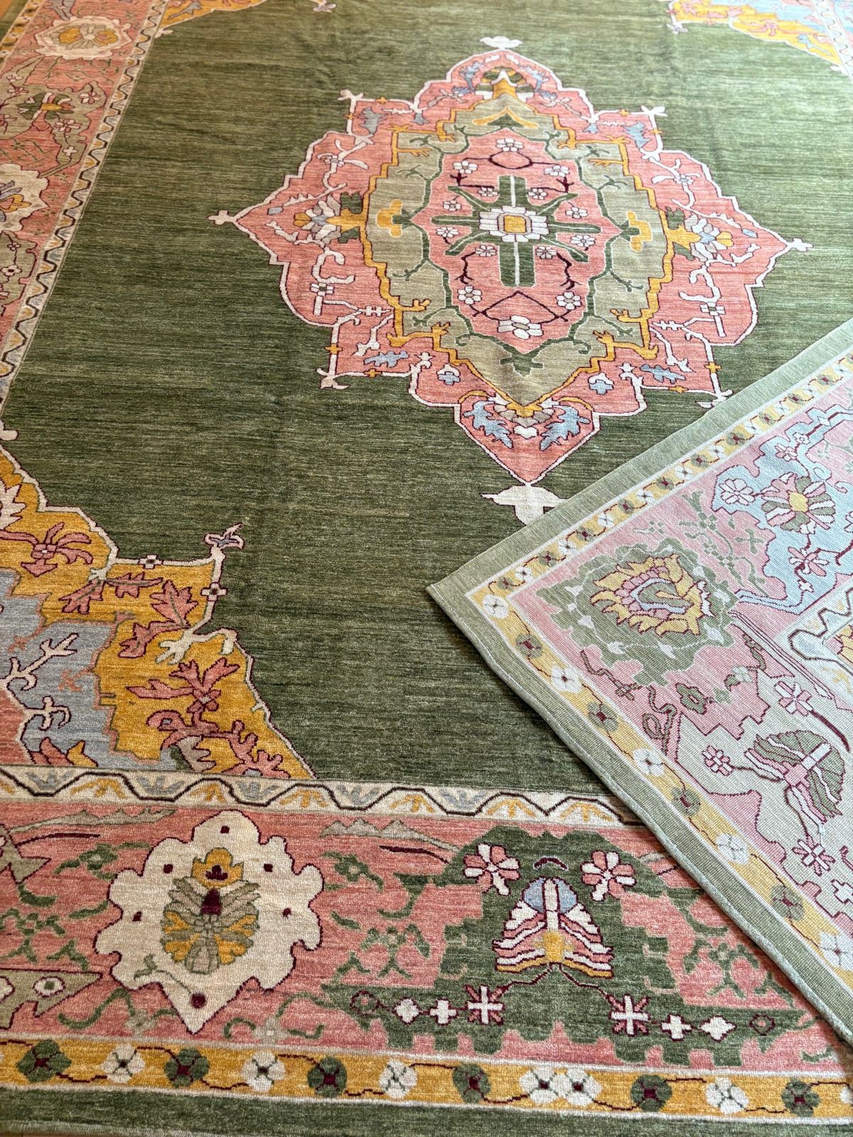 Olive ground with central medallion enclosed by a peach border and outer olive guard.