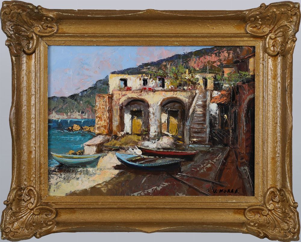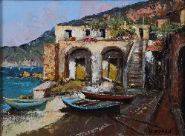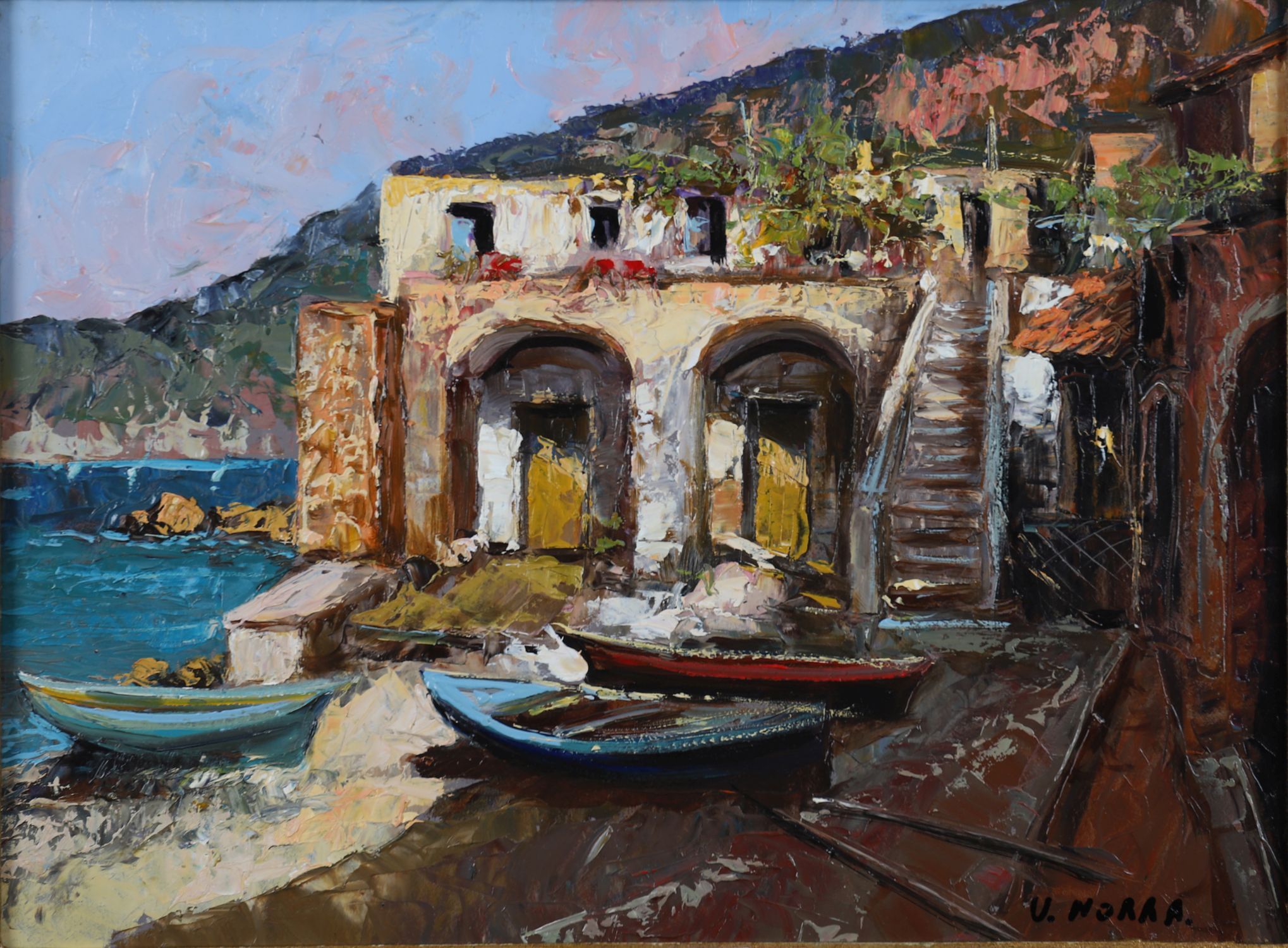 Case di Pescatori. Signed oil on board. Dated 2020. Framed.