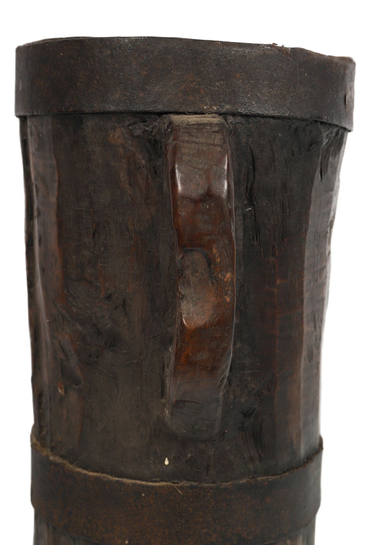 A vernacular dugout wooden vessel, hollowed from a single timber section, bound with metal bands and fitted with an integral carved handle, likely for agricultural or domestic use. Probably 18th–19th century.