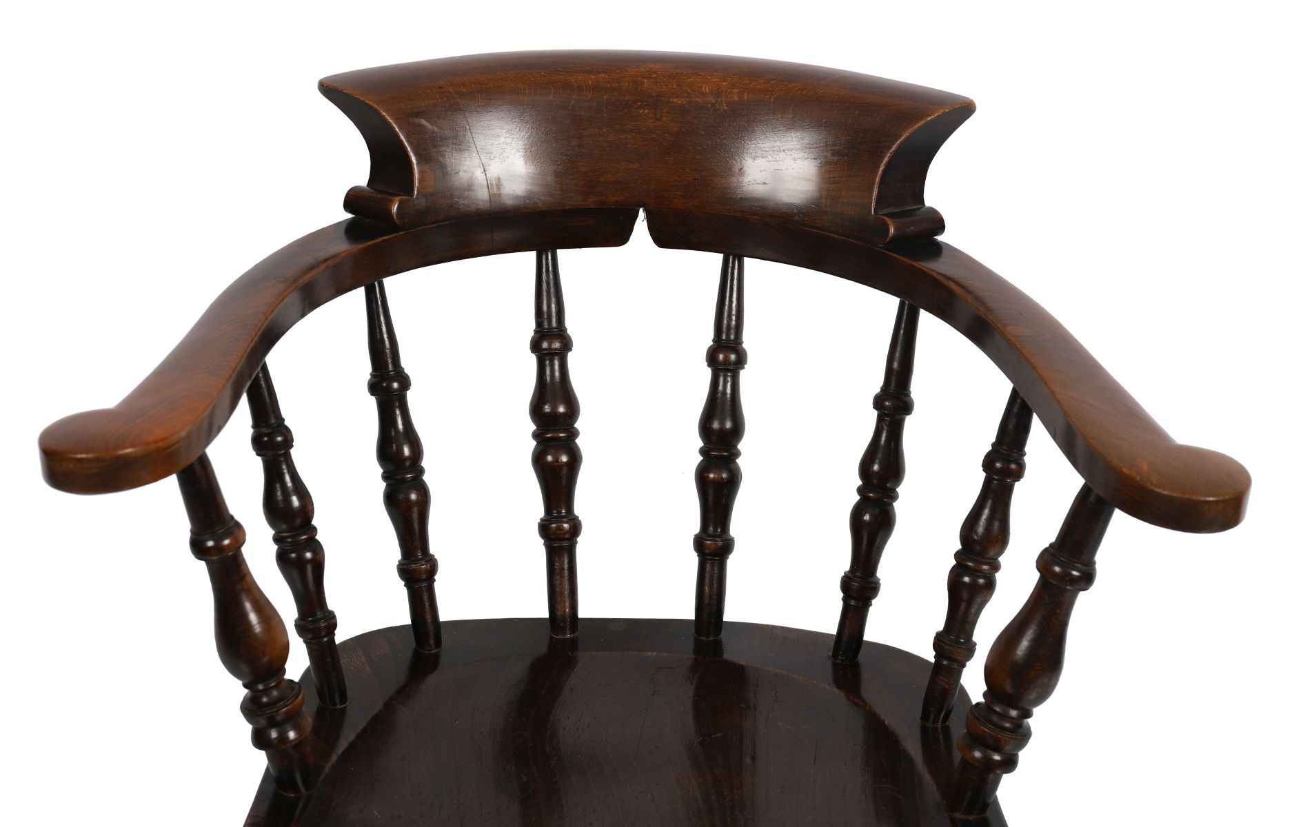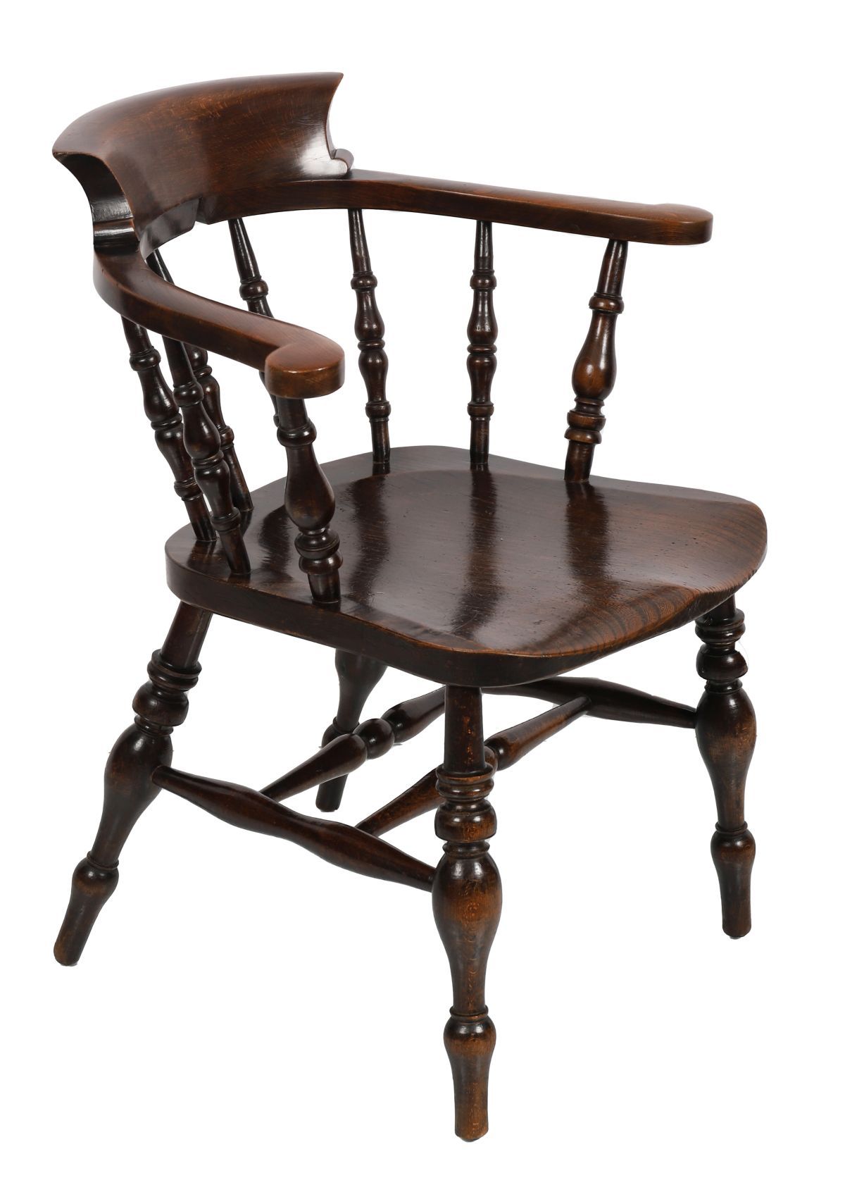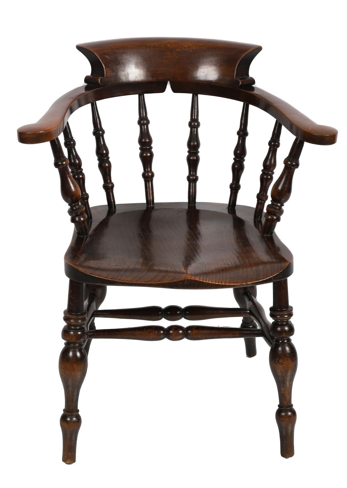 A vernacular smoker’s bow kitchen chair, with shaped top rail, spindle back and solid seat, raised on turned legs joined by stretchers.