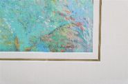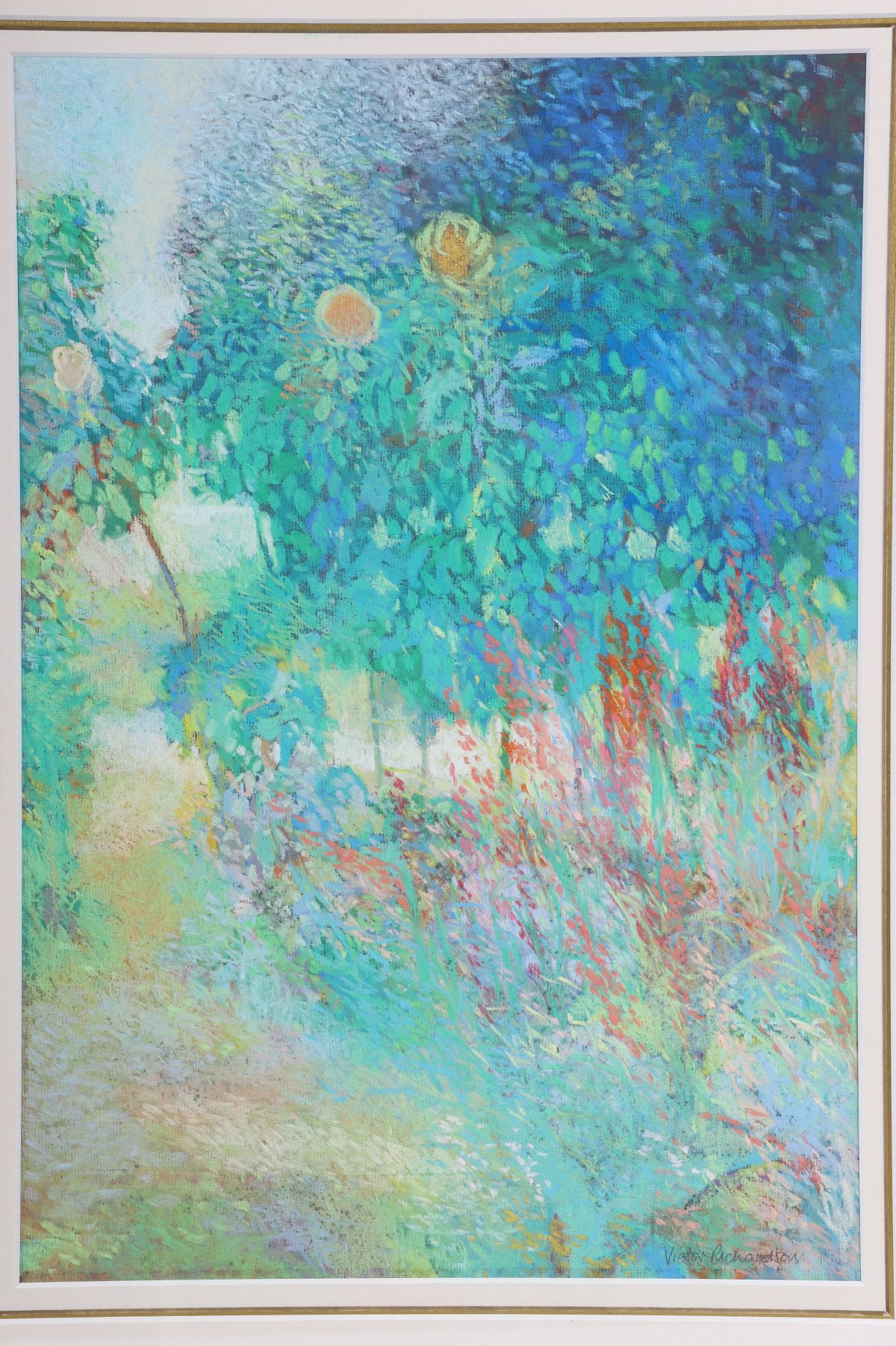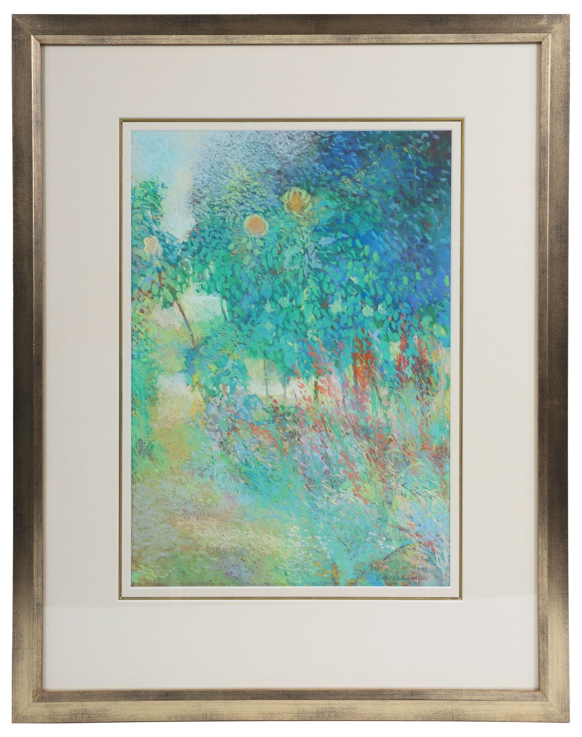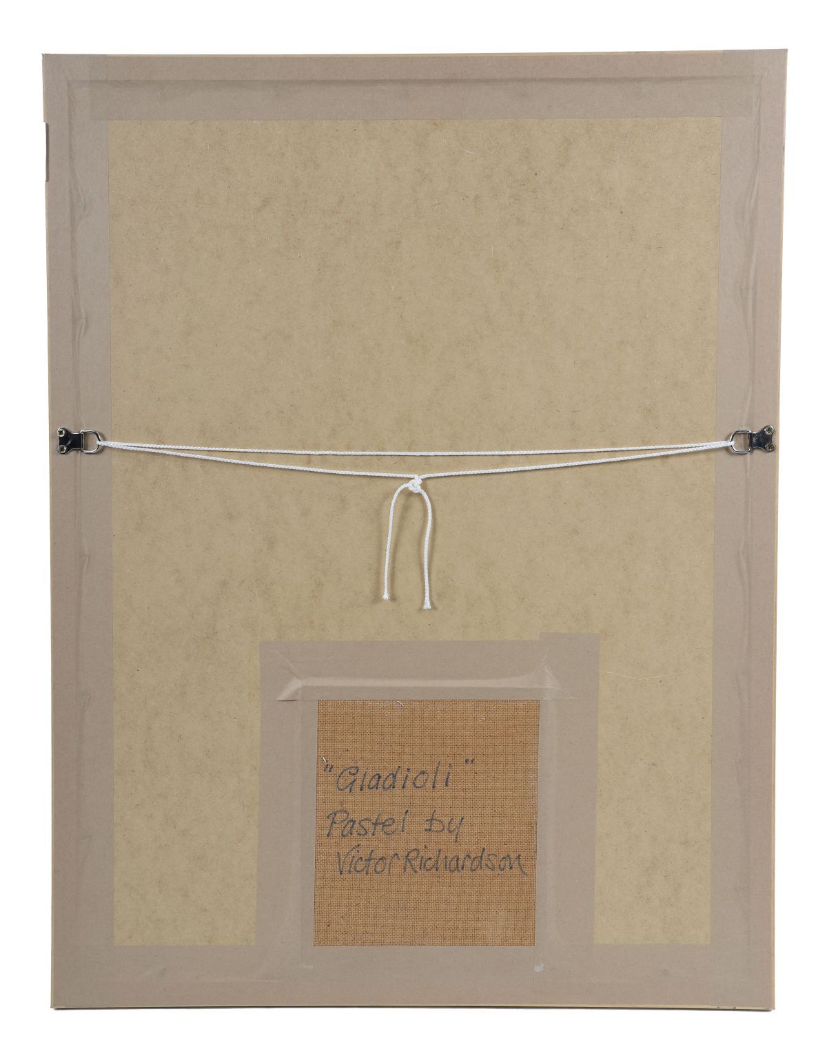 A richly coloured garden study by Victor Richardson, depicting a sunlit bed of gladioli and wildflowers in full bloom. Executed in pastel on board, the composition radiates with layered greens, pinks, and golds, evoking the vibrancy and texture of a summer garden. Richardson’s masterful handling of light and colour imbues the work with a sense of tranquility and painterly depth.