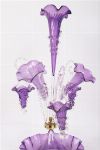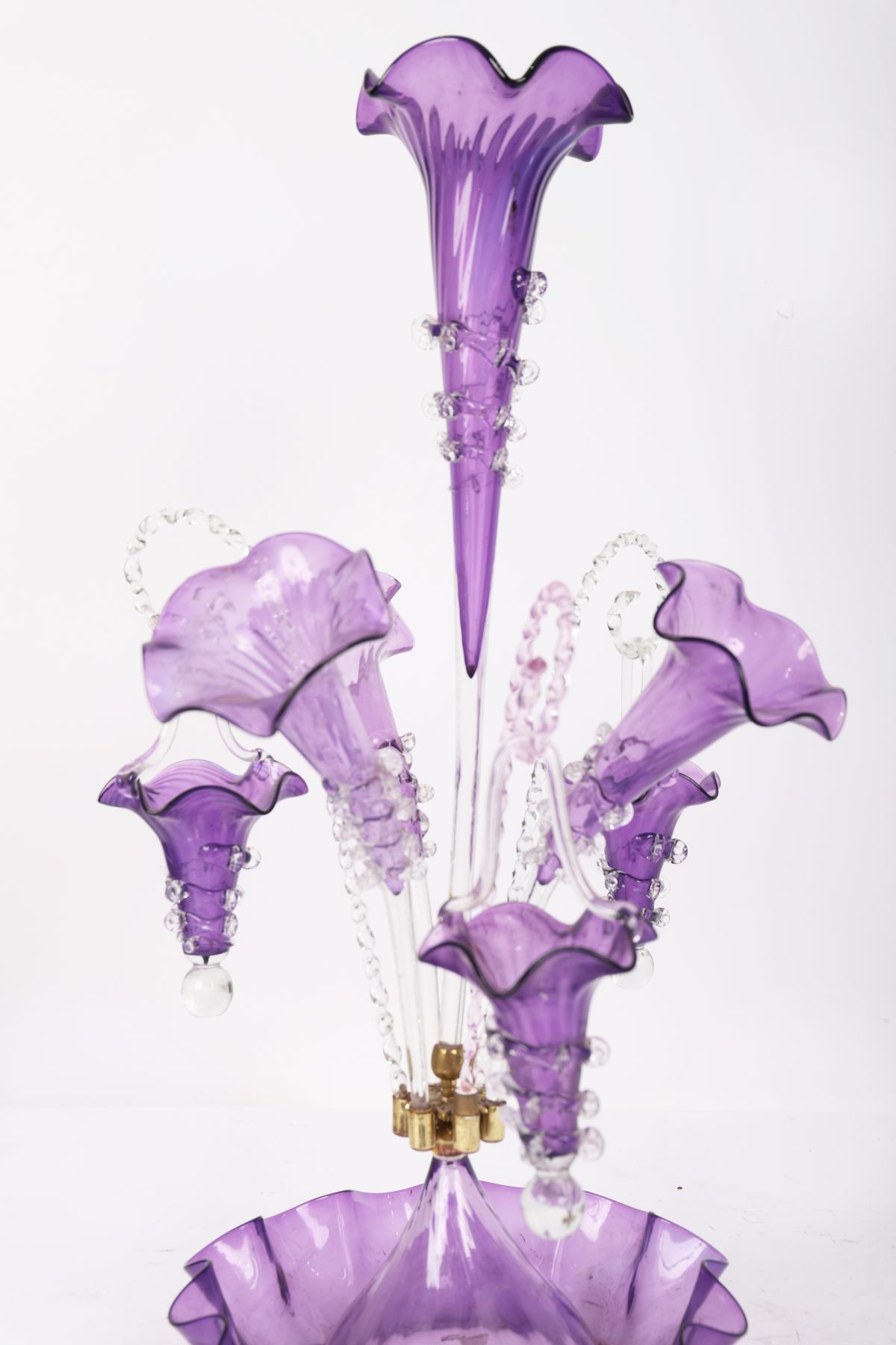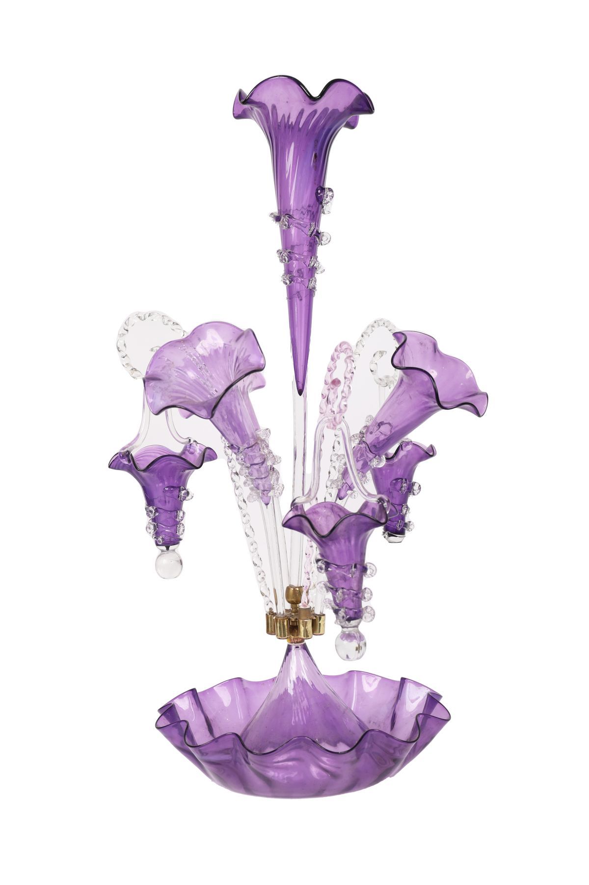 An impressive epergne with five fluted amethyst glass trumpets, each with applied clear glass decoration, raised on a matching base. 19th century.