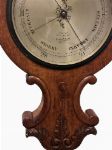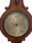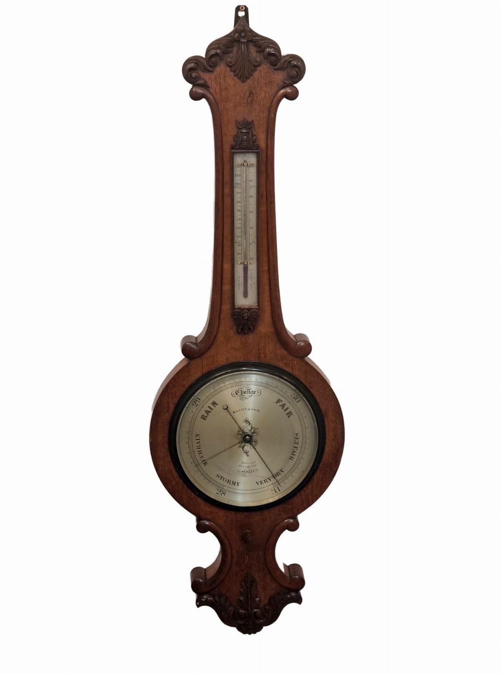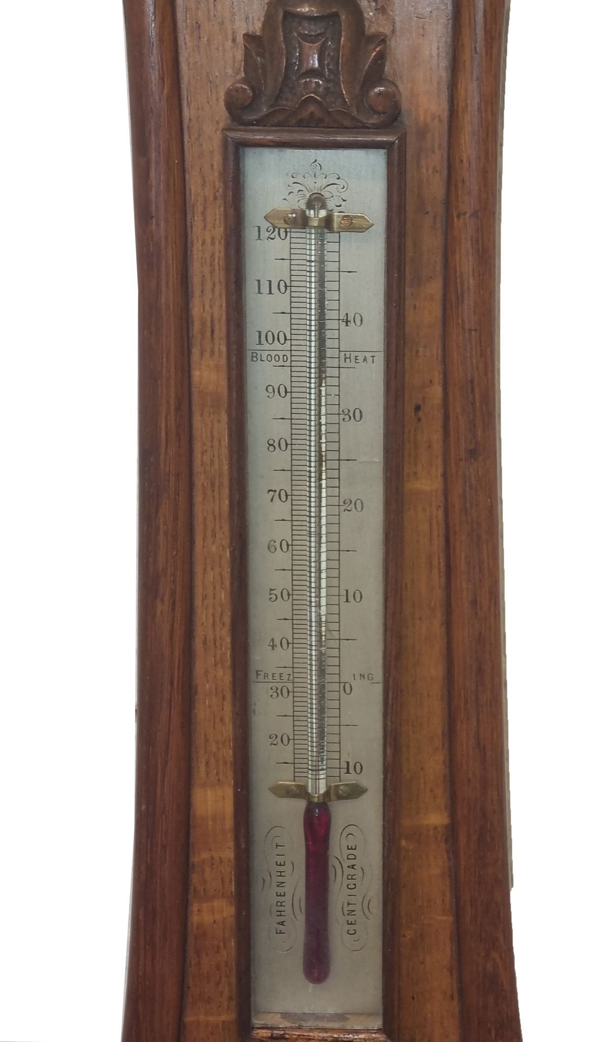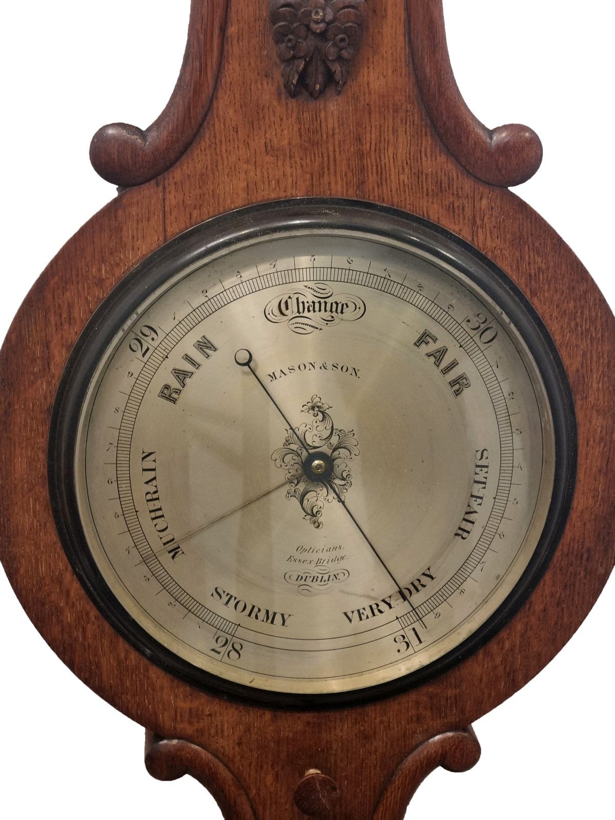 The carved walnut case housing a circular silvered dial signed Mason & Son, Dublin, with thermometer above, of classic banjo form.