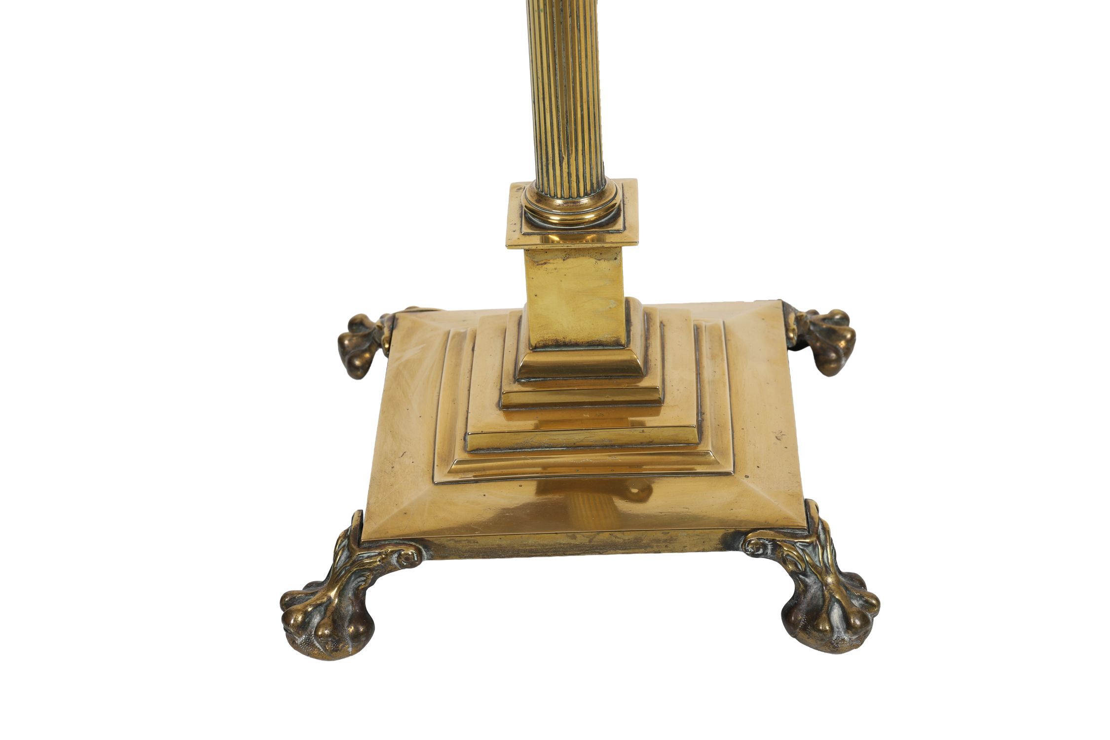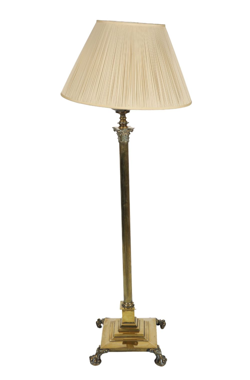 A Victorian brass standard lamp, the tall fluted Corinthian column stem raised on a stepped square base with paw feet. Complete with pleated shade. Classical and imposing in style.