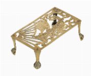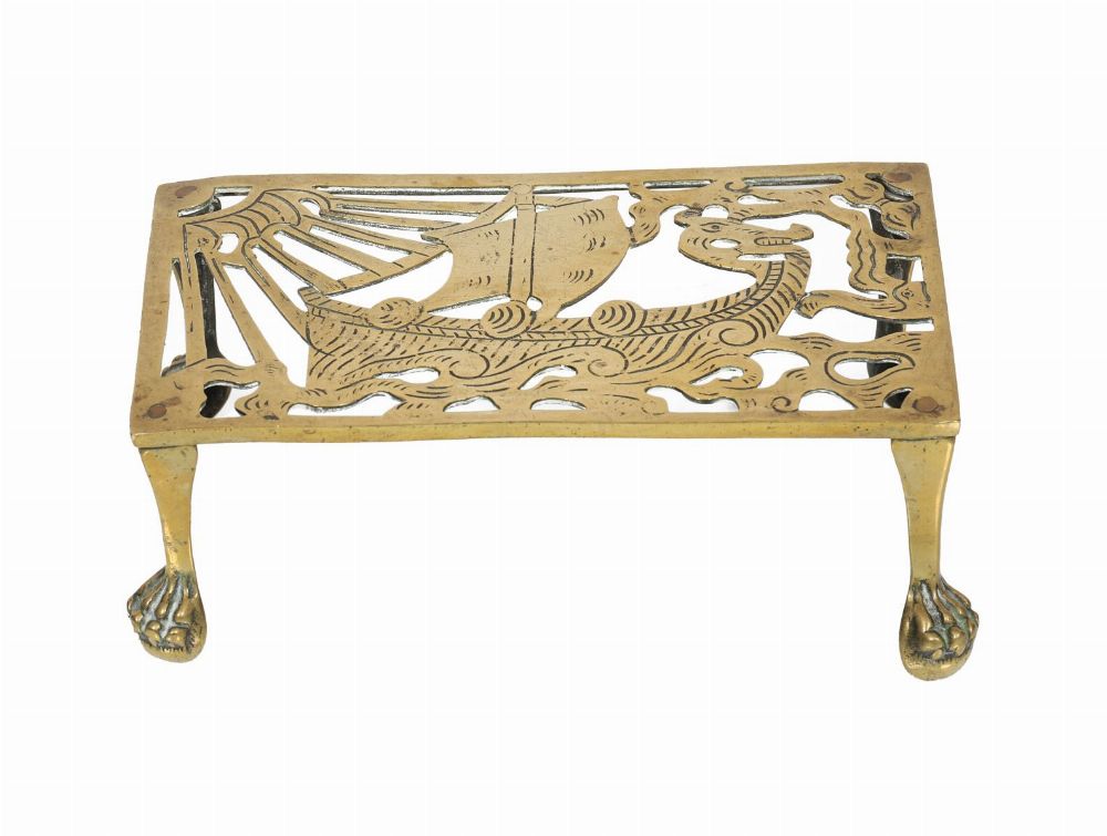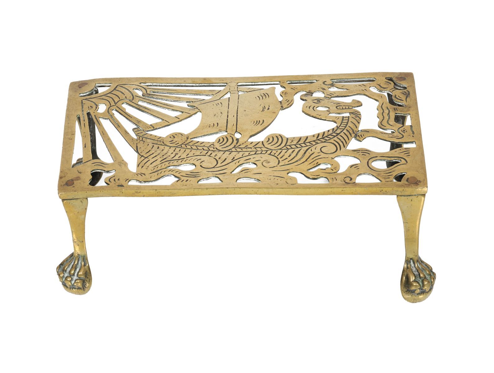 A decorative brass trivet of rectangular form, the pierced top depicting a Viking longship in waves, raised on claw feet.