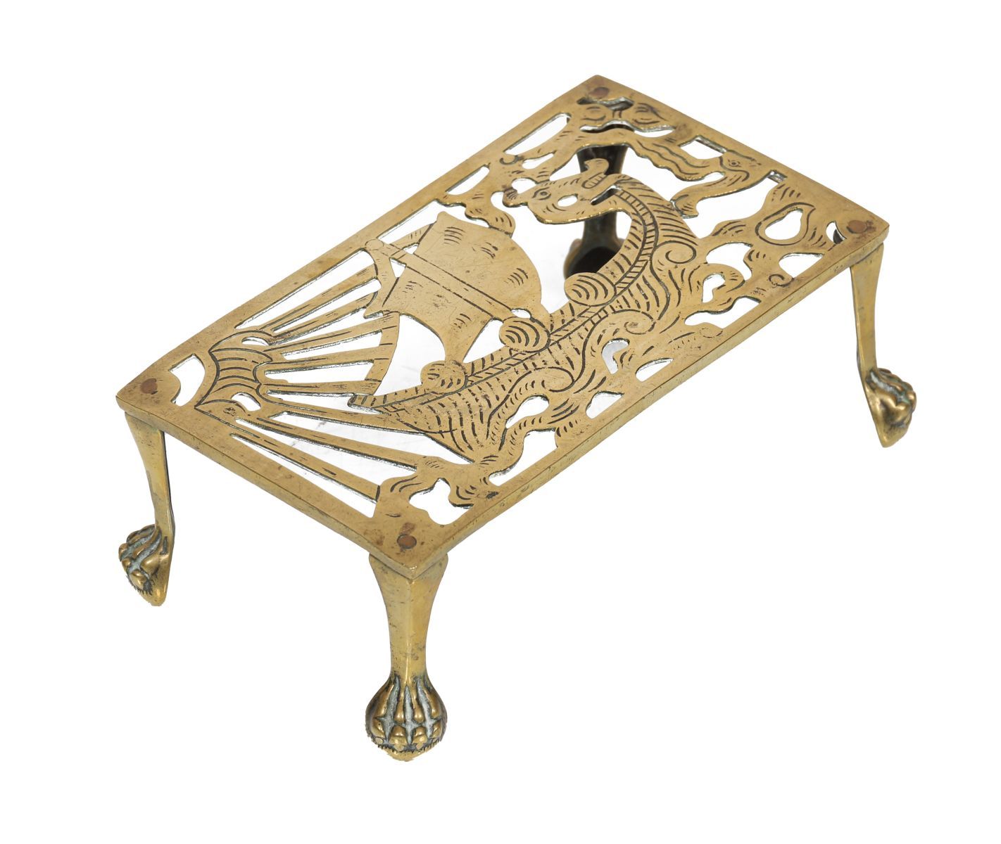 Lot 410 VICTORIAN BRASS TRIVET WITH VIKING SHIP MOTIF