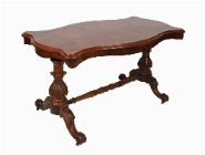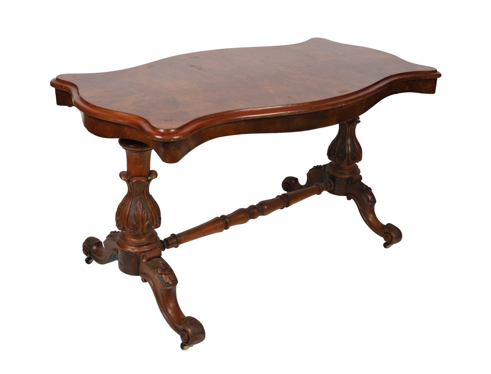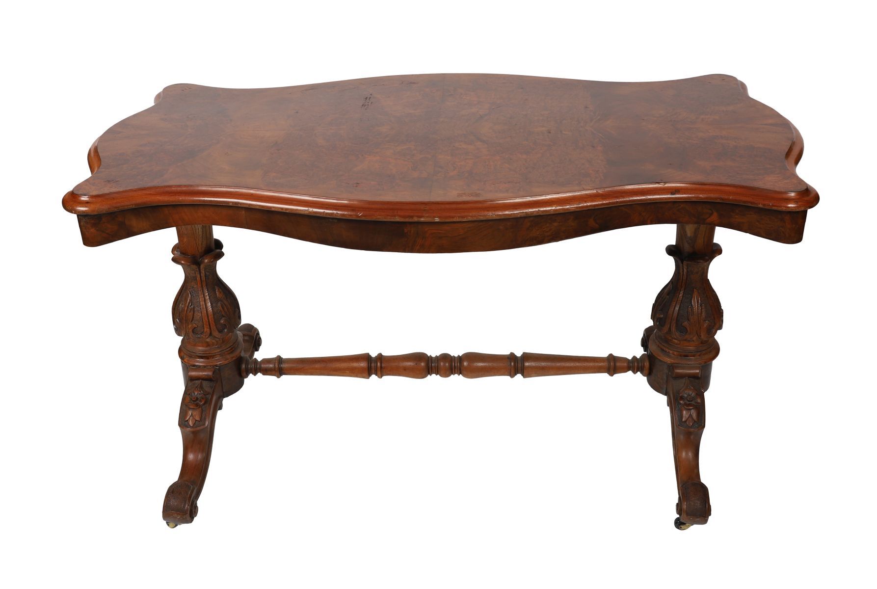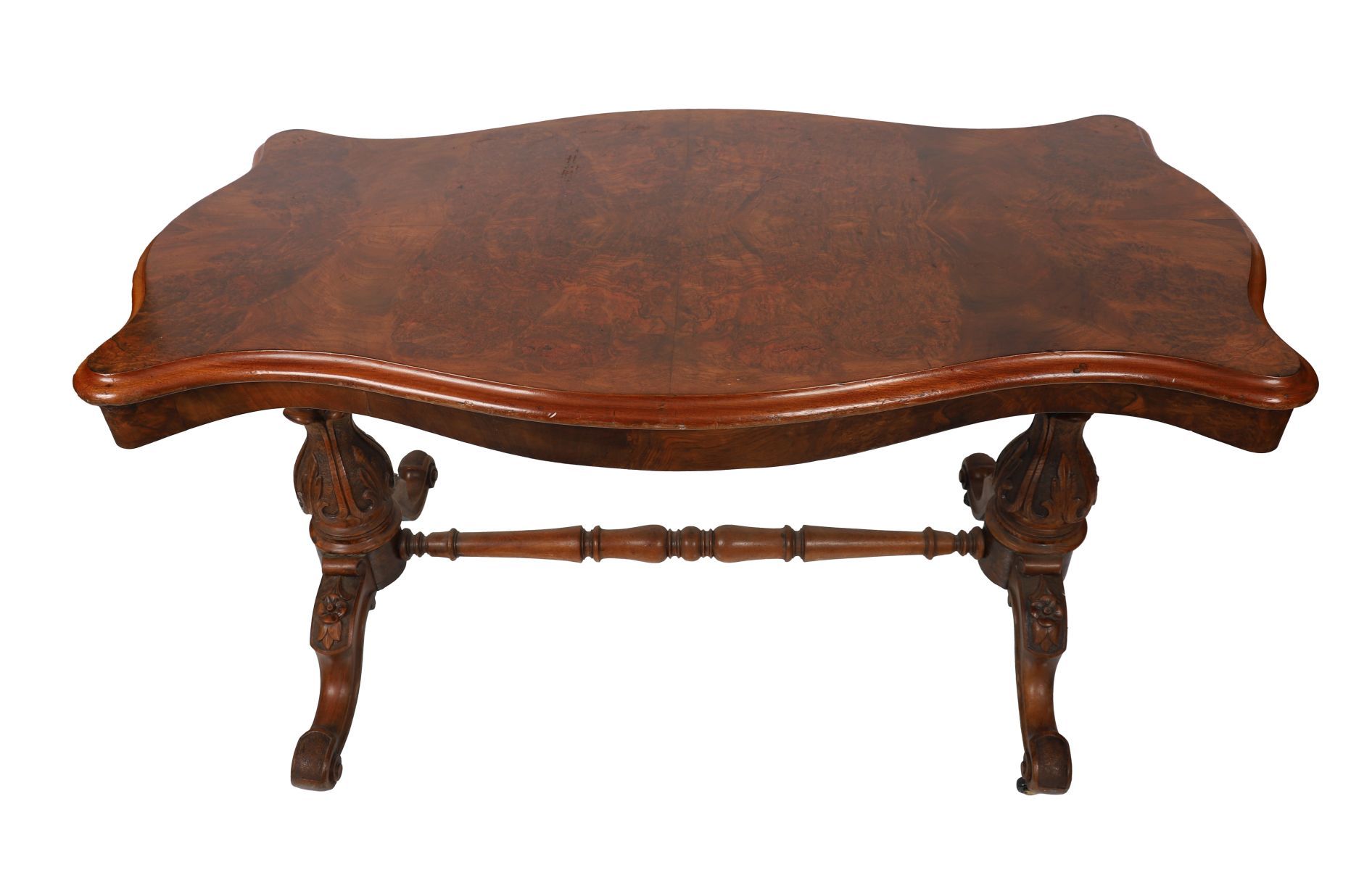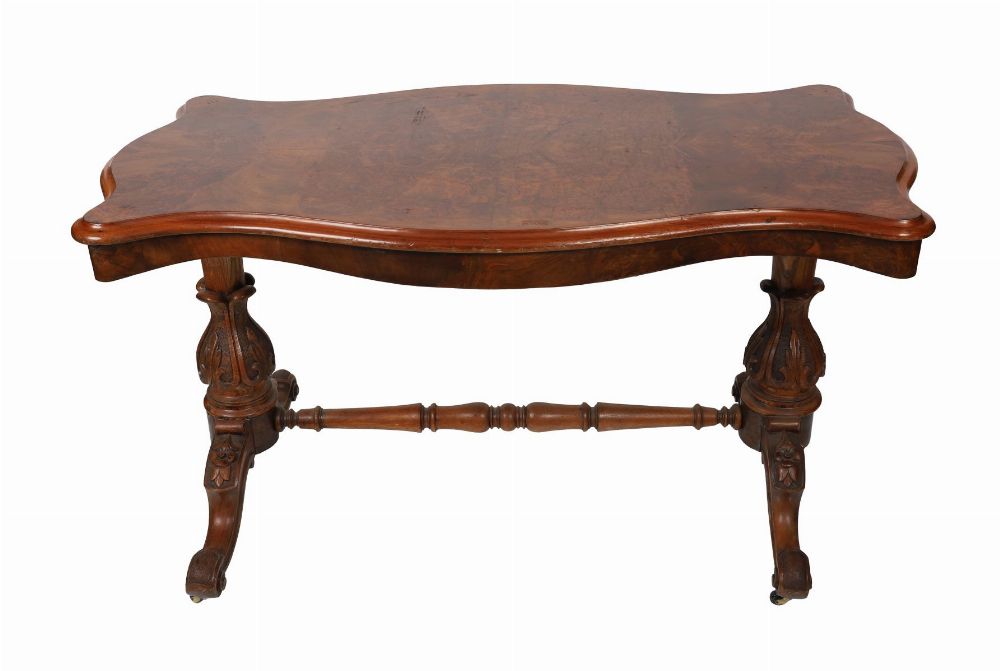 A fine Victorian burr walnut serpentine writing table, the shaped top with crossbanded edge above carved supports united by a central stretcher, raised on scrolled feet with concealed castors.