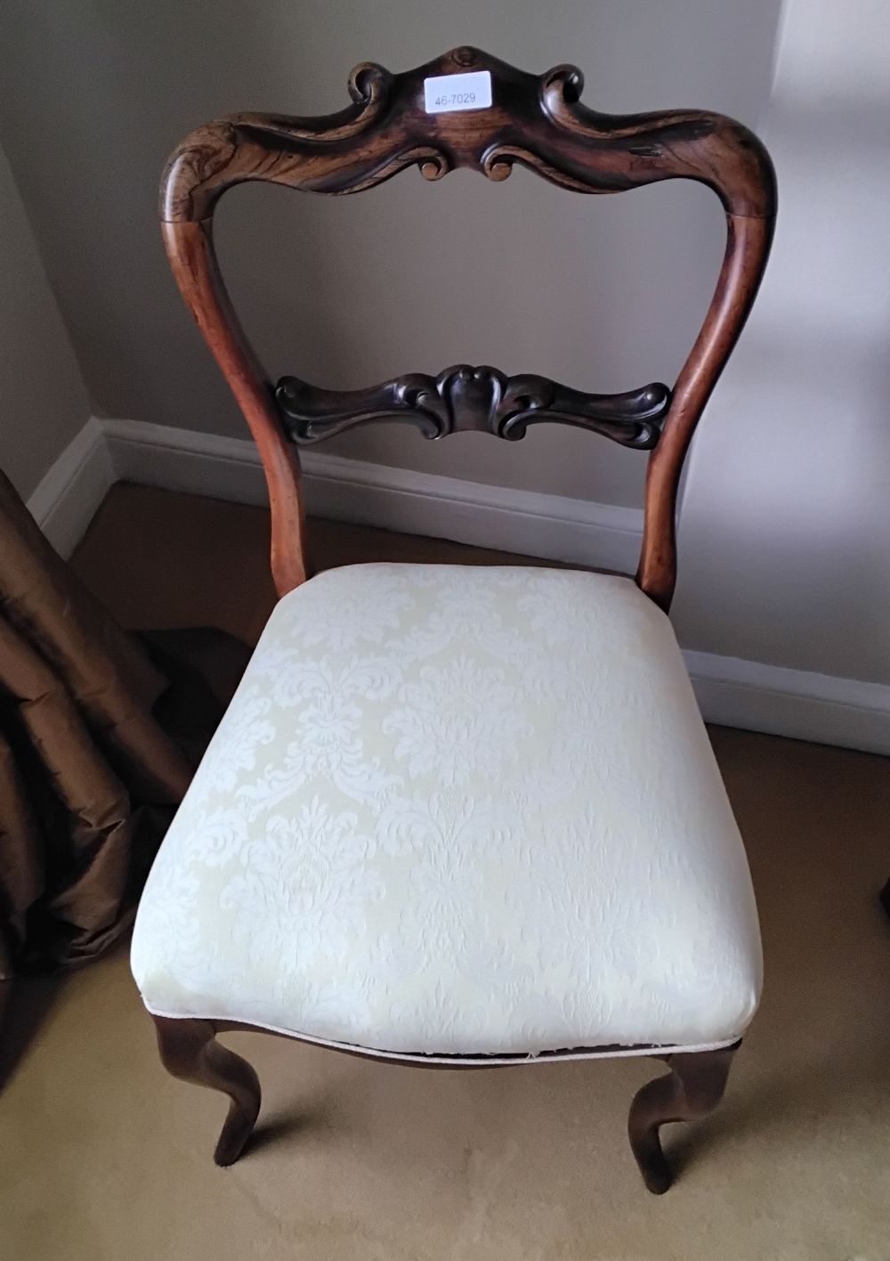 A Victorian carved walnut balloon-back chair with foliate scroll crest and pierced back rail, drop-in seat upholstered in damask, raised on cabriole legs.