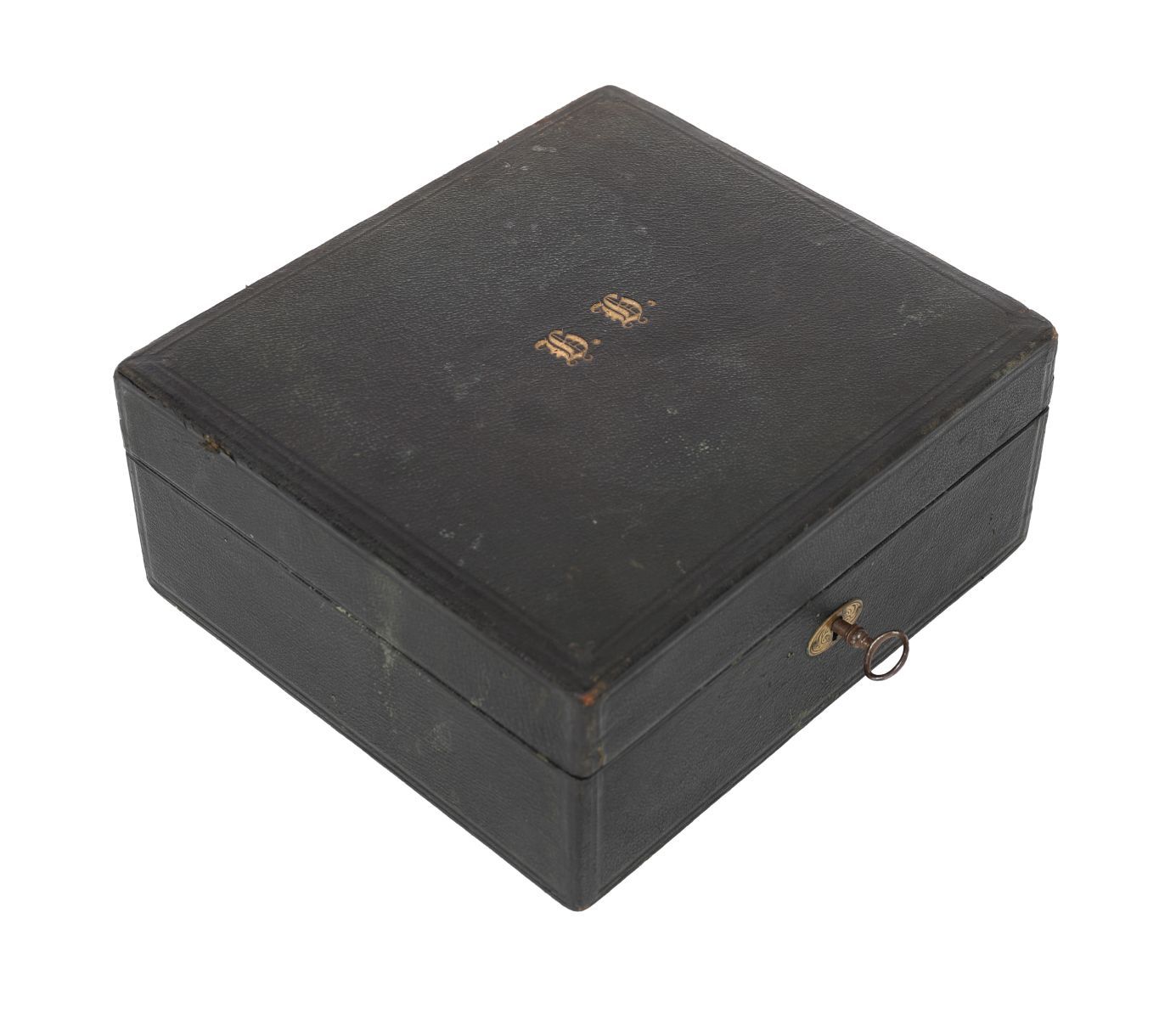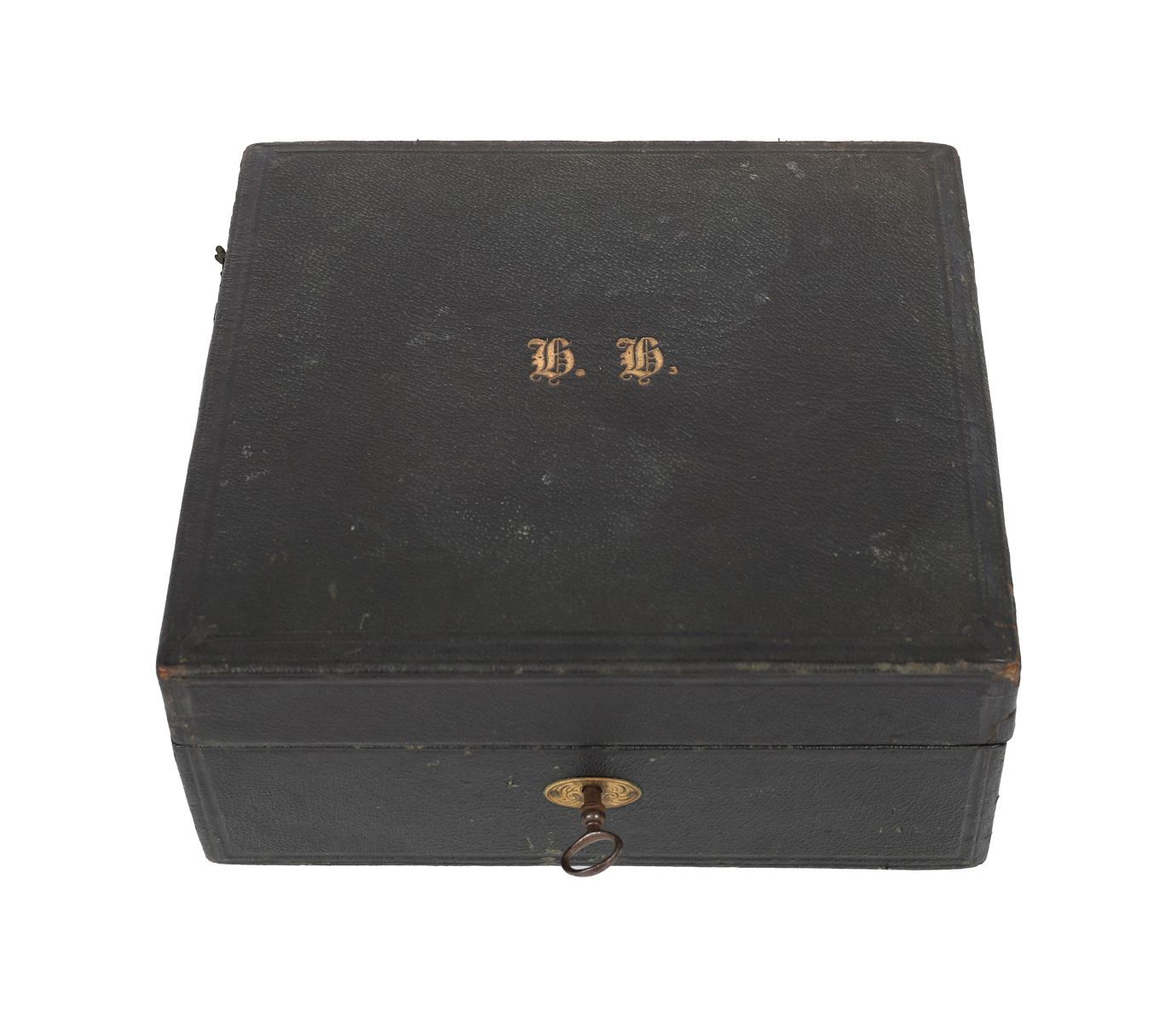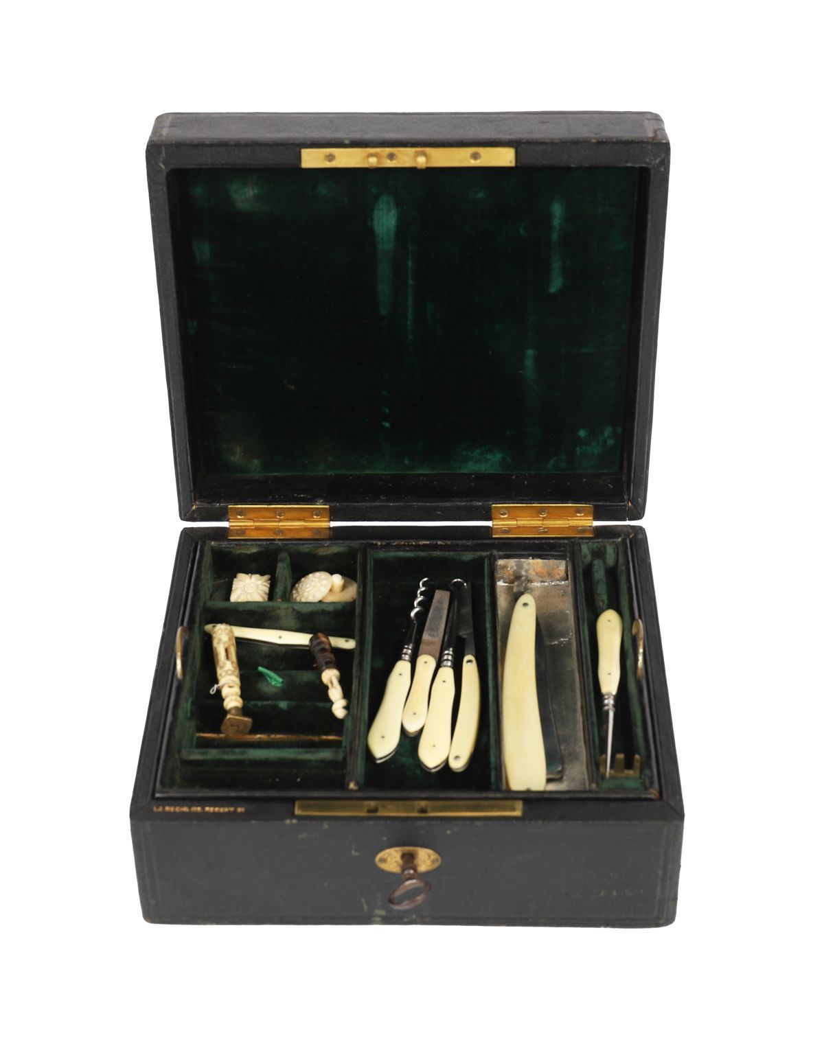 A fine 19th-century black leather dressing case with gilt monogram initials “H.H.” to the lid, the interior lined in green velvet and fitted with various compartments and removable trays containing grooming and personal implements, including ivory-handled manicure tools, corkscrew, folding knife, and carved accessories.