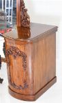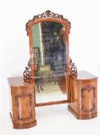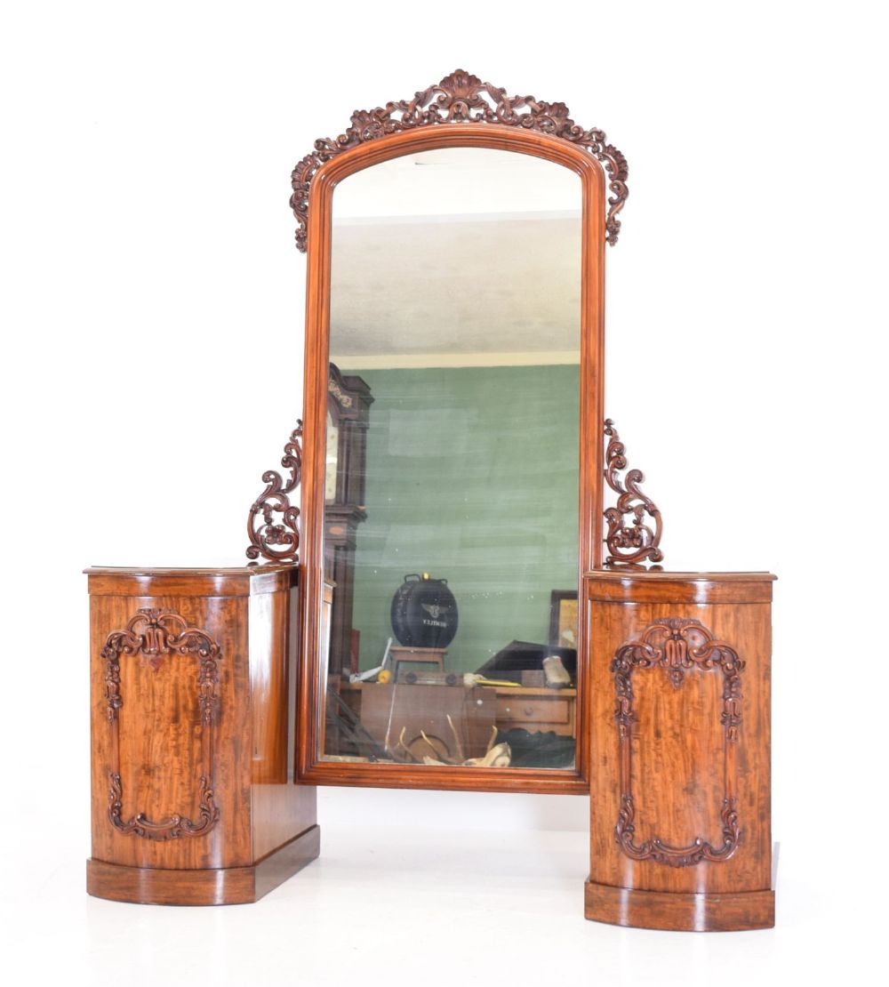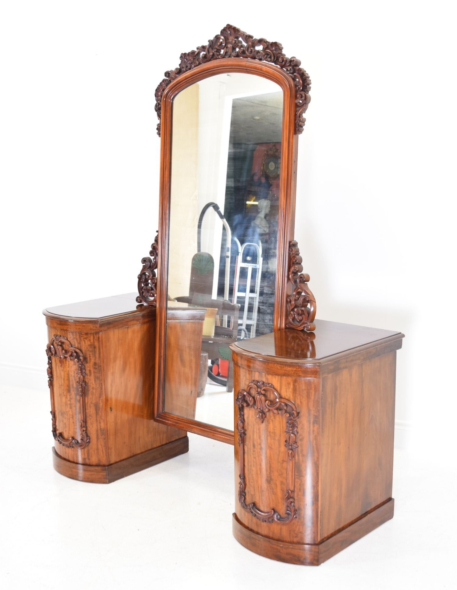 Dressing table with central arched mirror surmounted by carved scroll crest, flanked by two bow-front pedestals with carved panels, each with cupboard doors, on plinth bases.