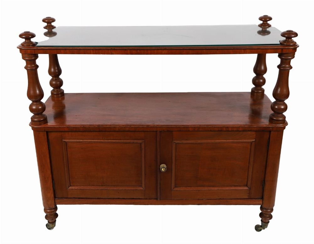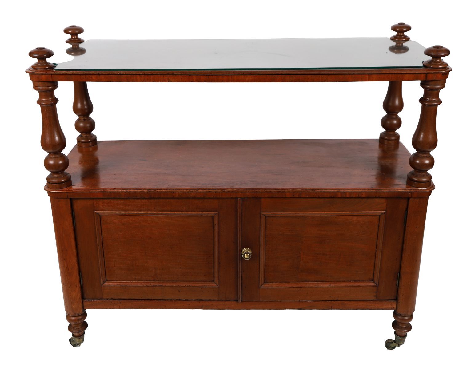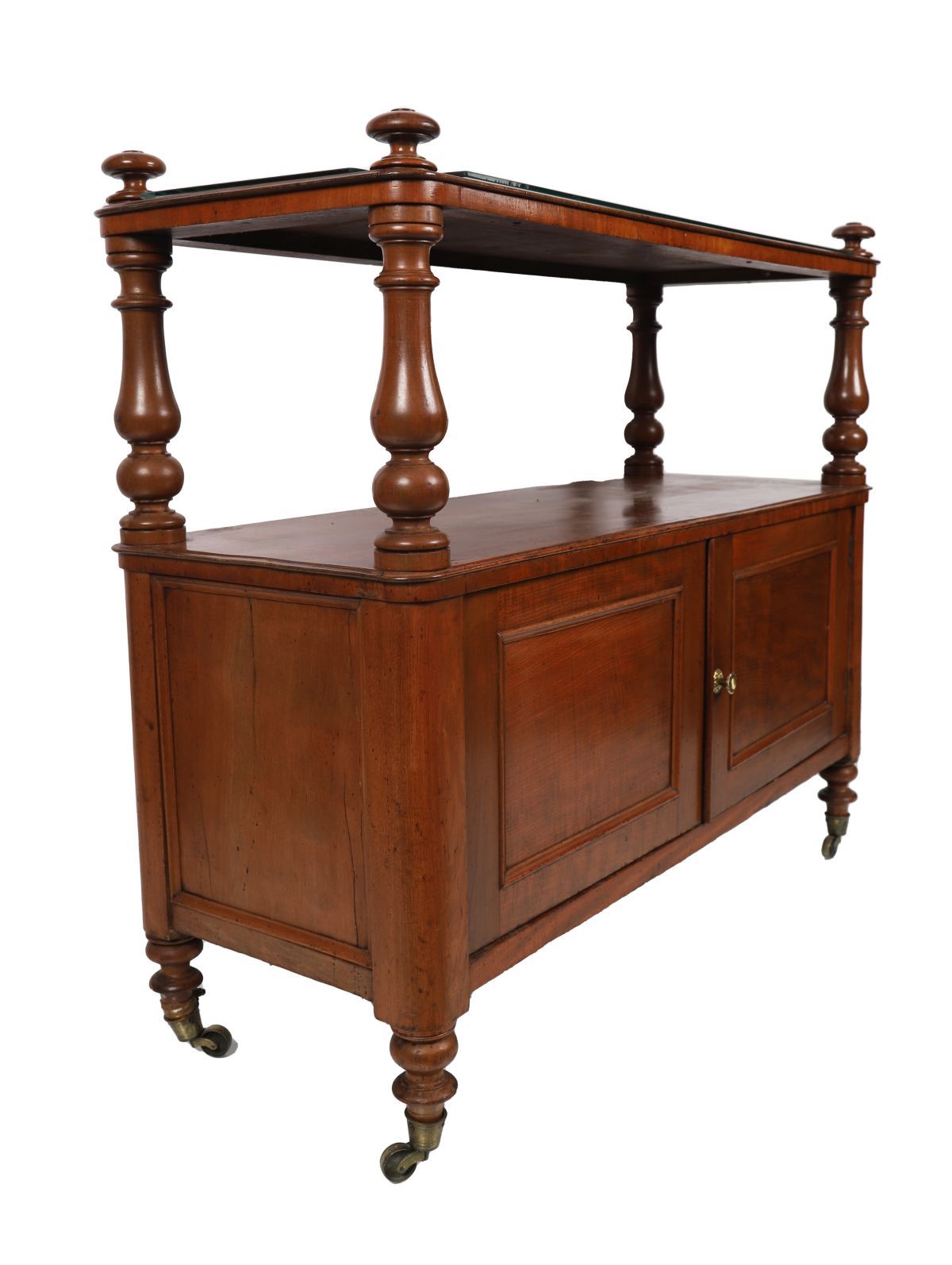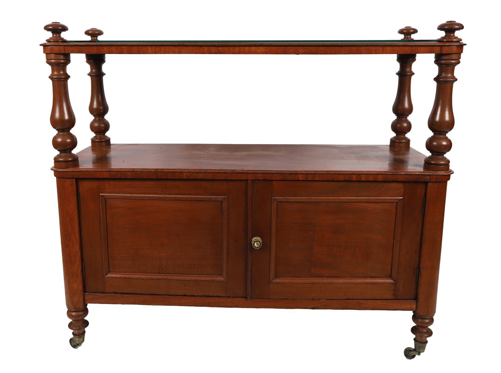 The rectangular moulded-edged top is raised on turned pillars above two panelled doors, and the whole piece is supported on turned legs terminating on brass cup castors.