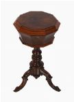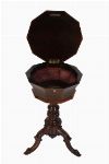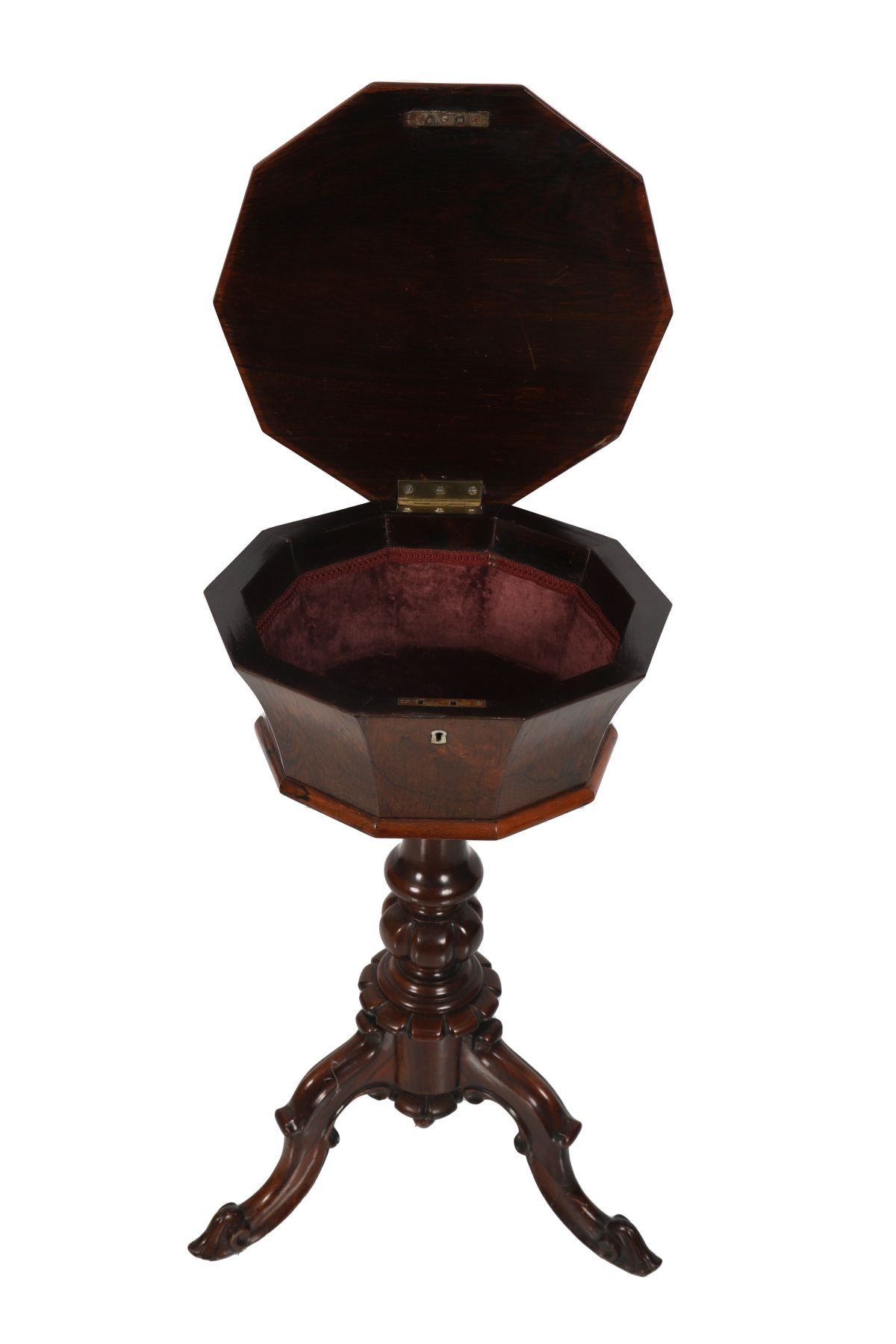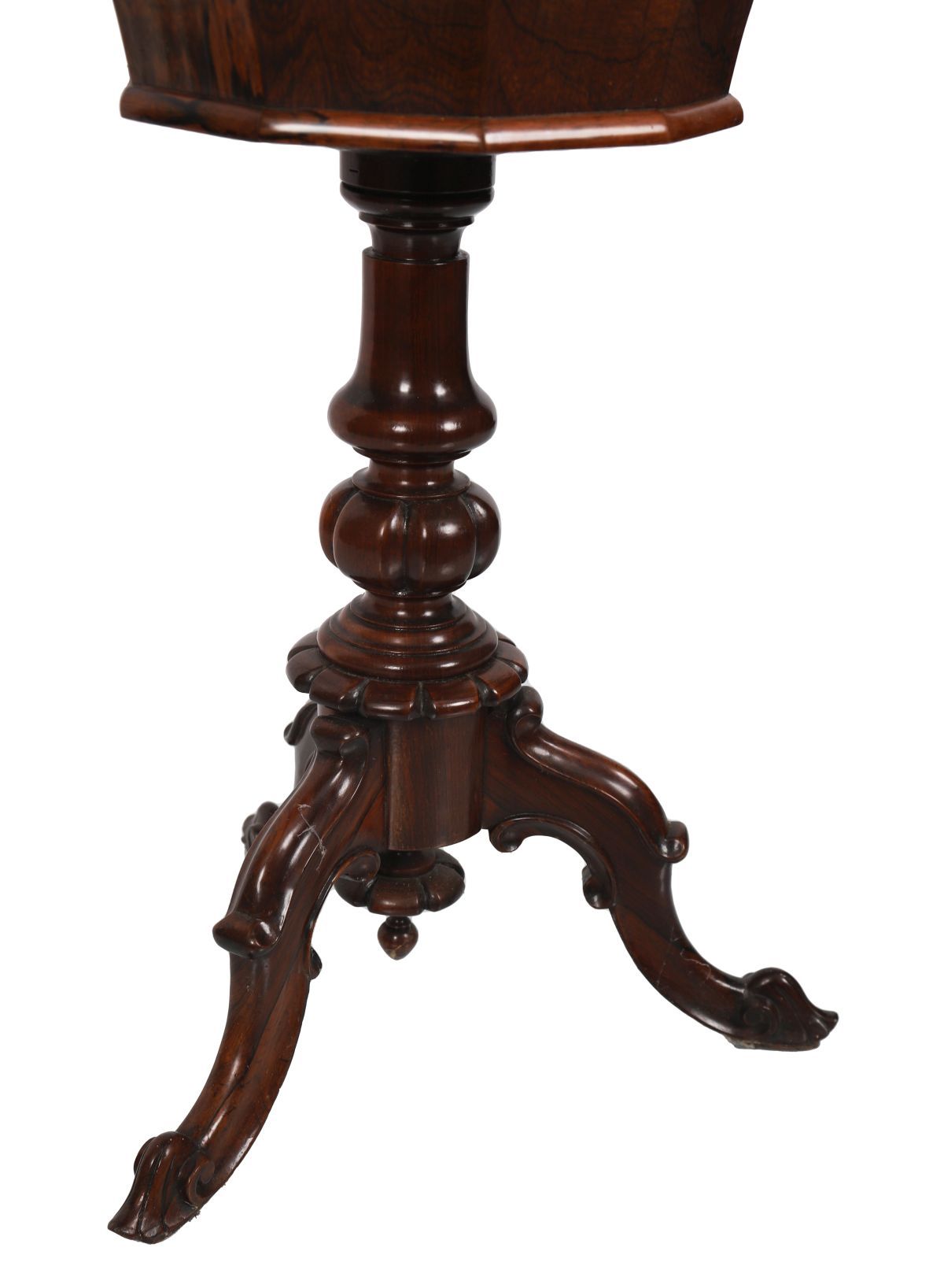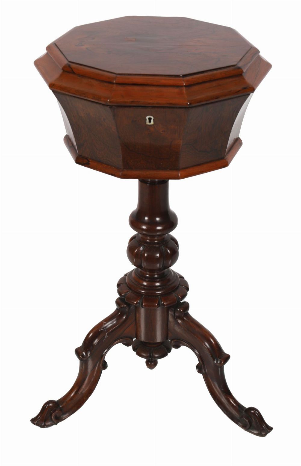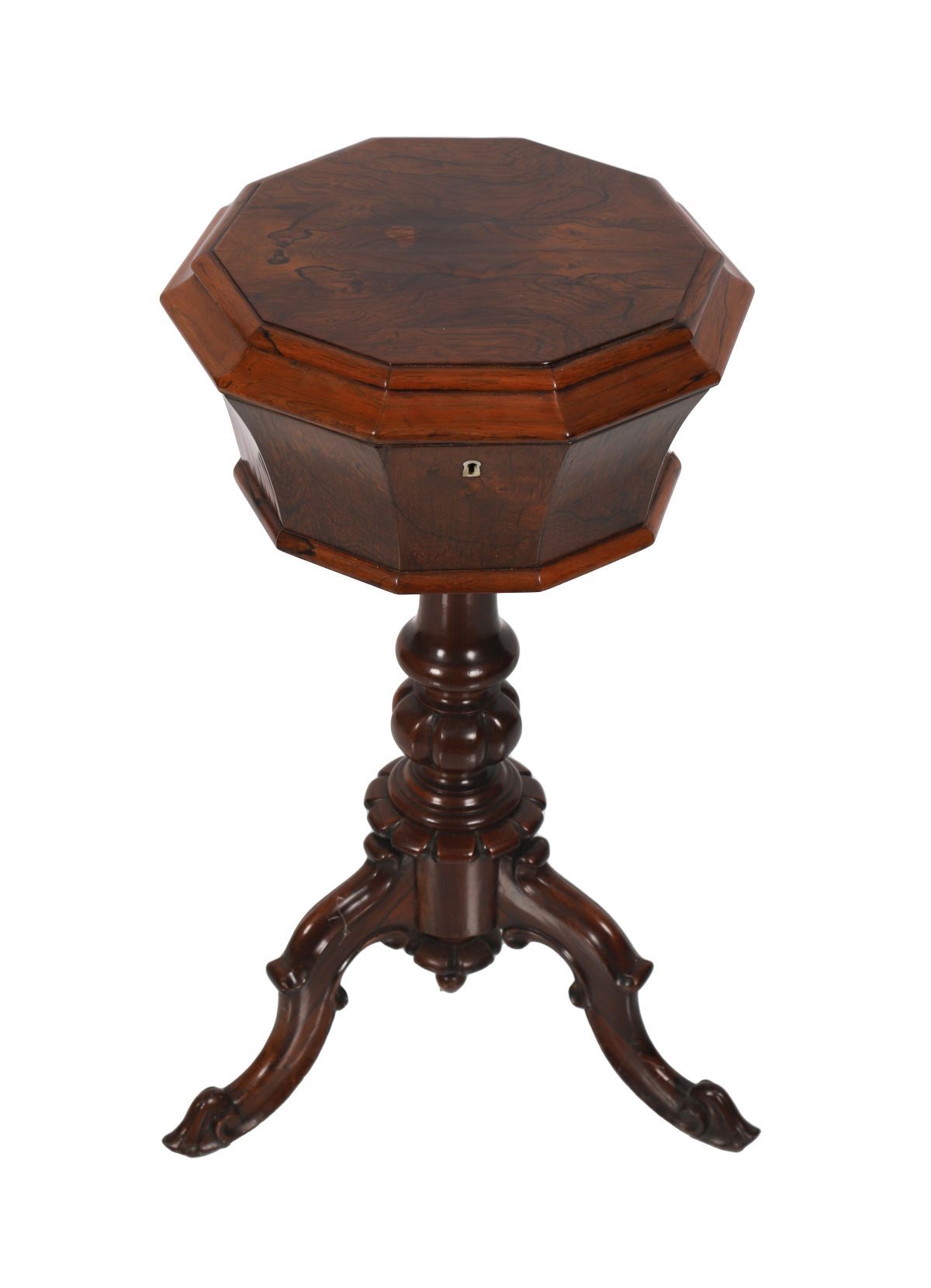 the stepped and moulded edged octagonal-shaped top opening to a fitted interior above a chamfered cavetto-shaped body raised on a turned stem and scroll legged pod.