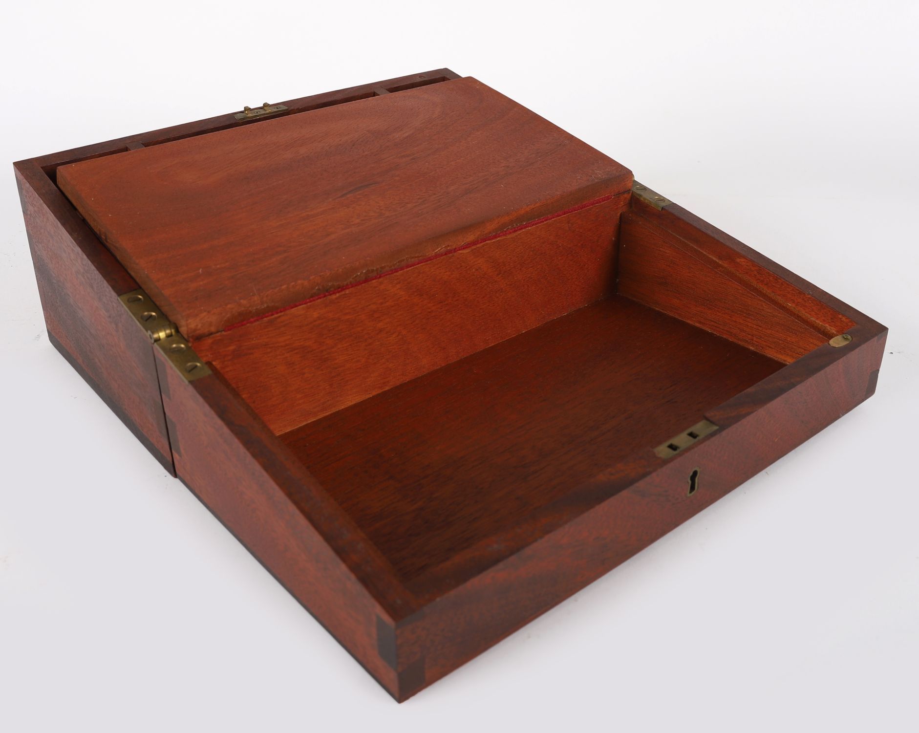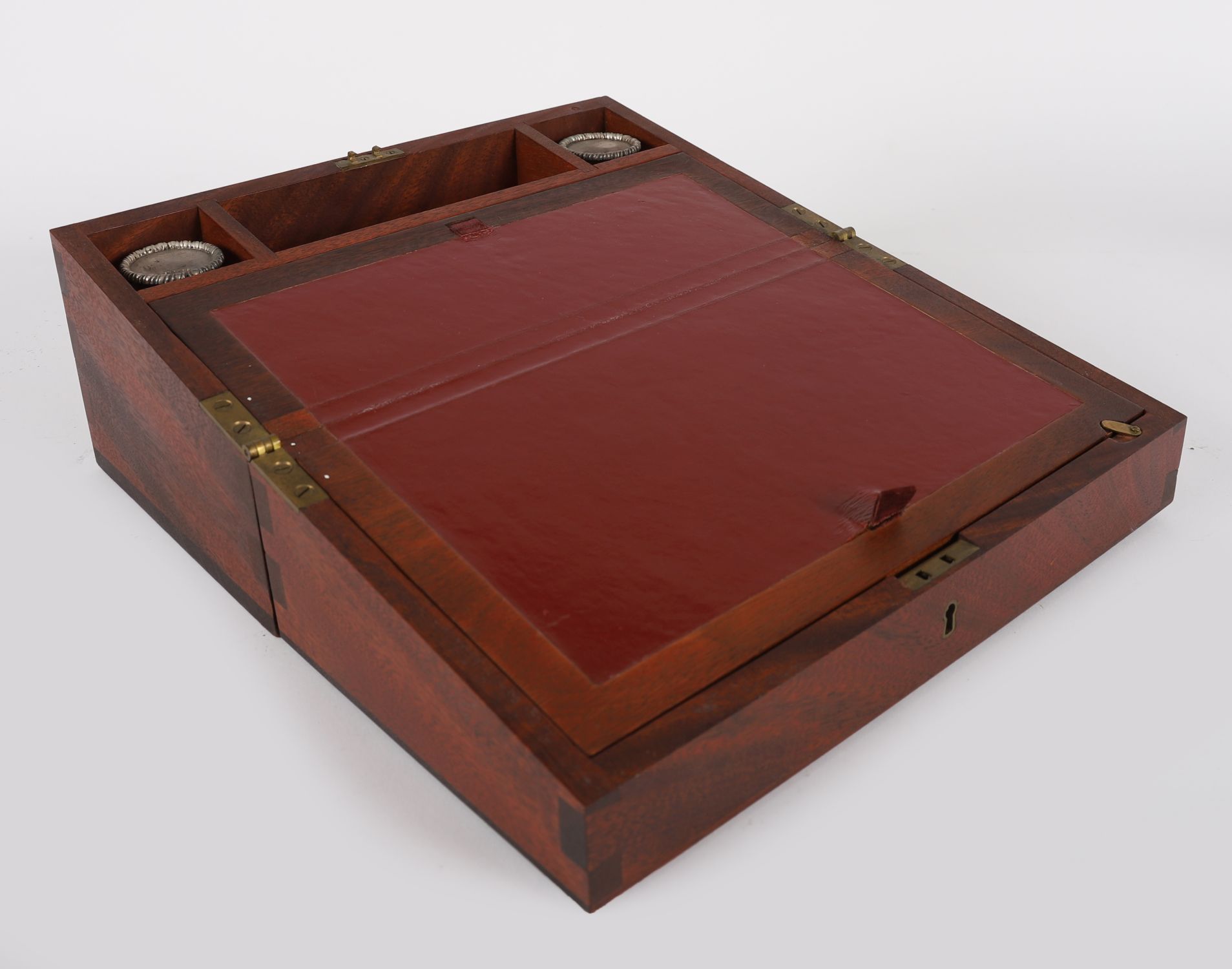A Victorian mahogany writing slope of rectangular form, the hinged cover opening to reveal a sloped writing surface inset with crimson leather, divided into two sections with gilt tooling. Fitted with compartments for inkwells, pens, and writing accessories, some retaining original glass inkwells with metal mounts. The exterior with brass hinges and key escutcheon, the interior designed with concealed storage beneath the writing panels.