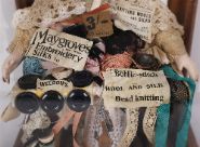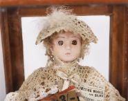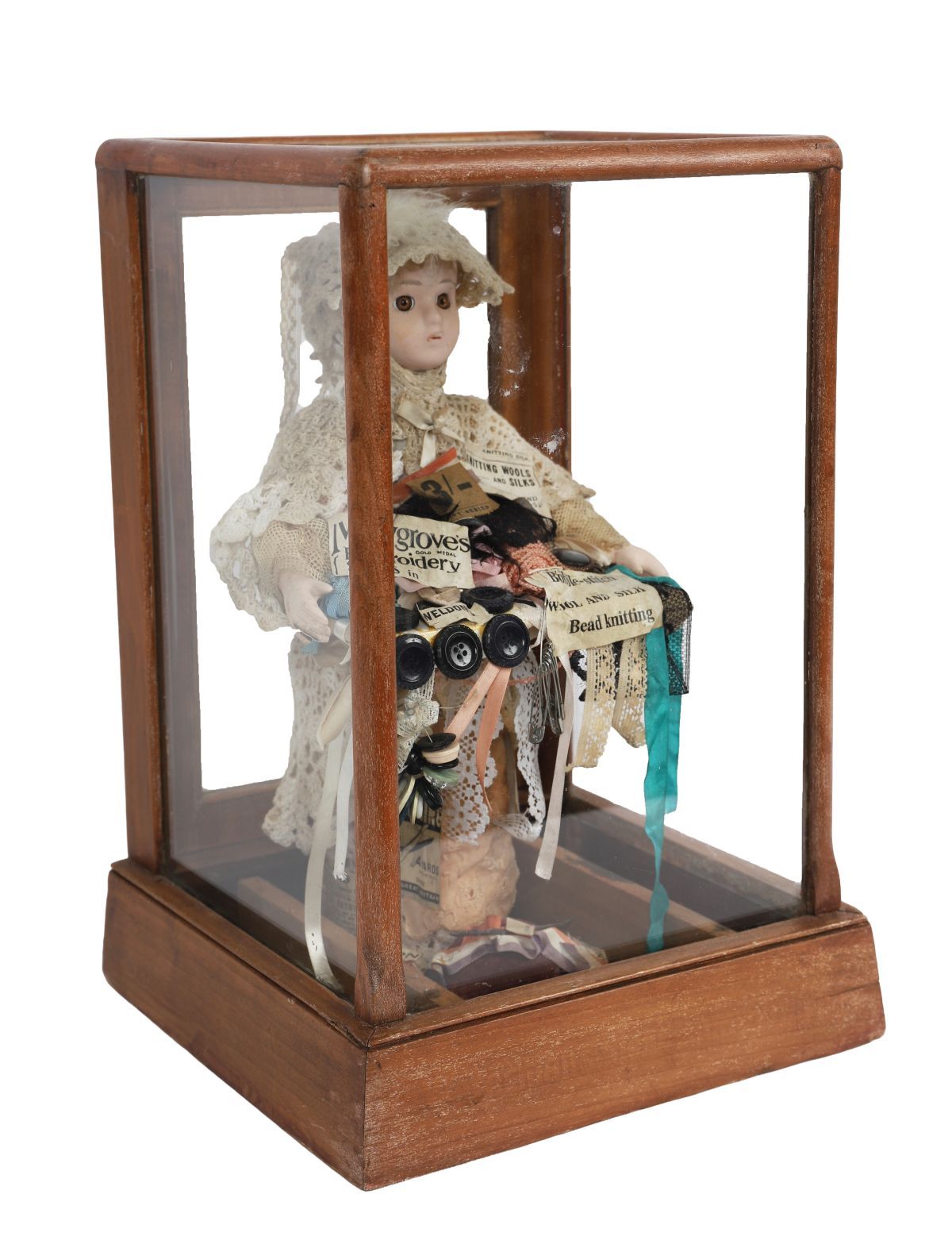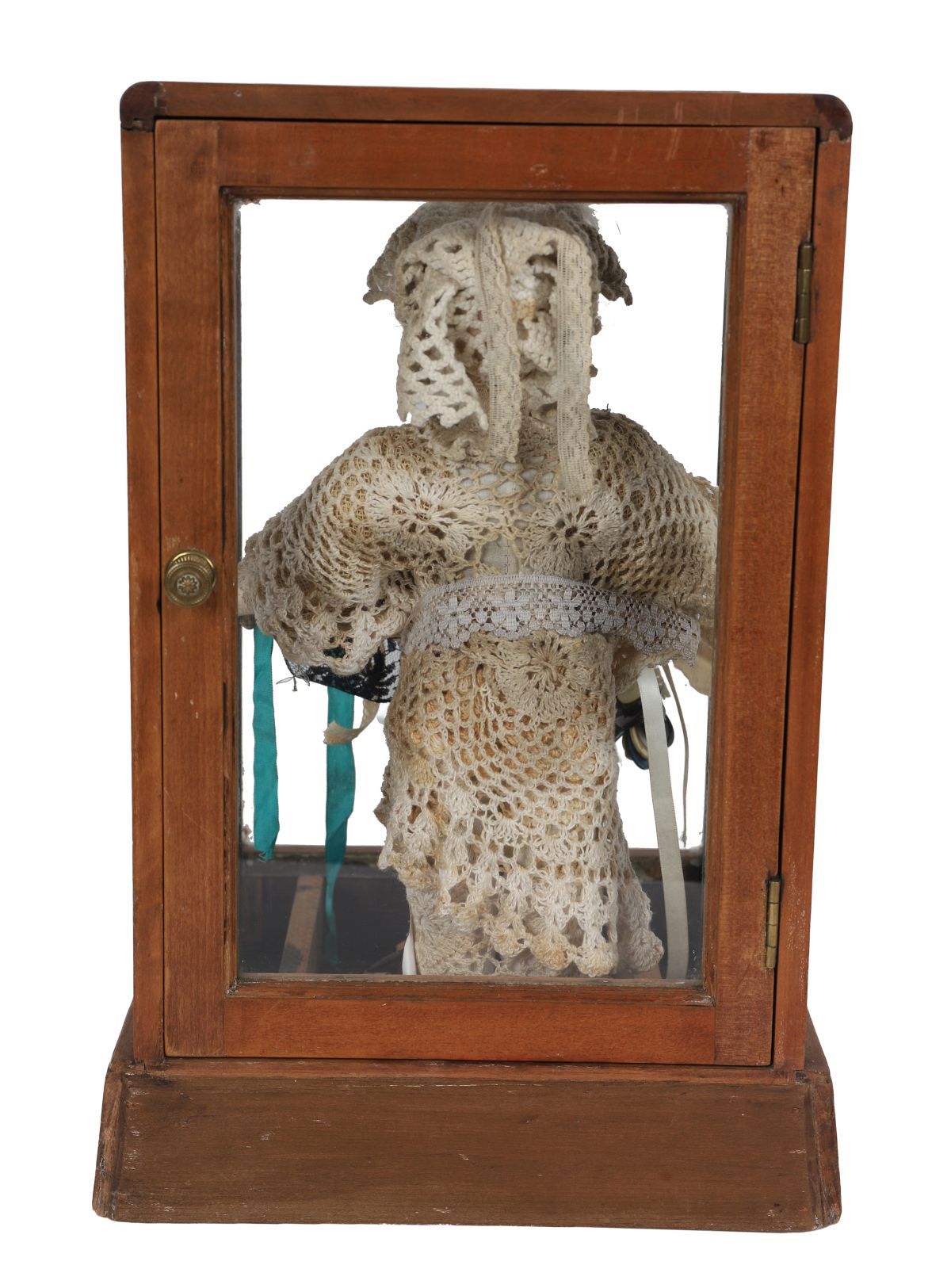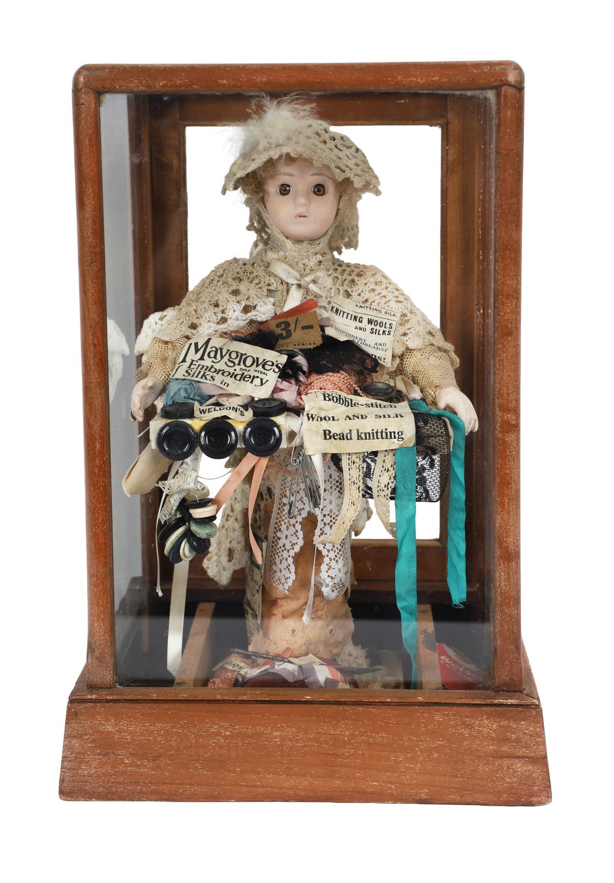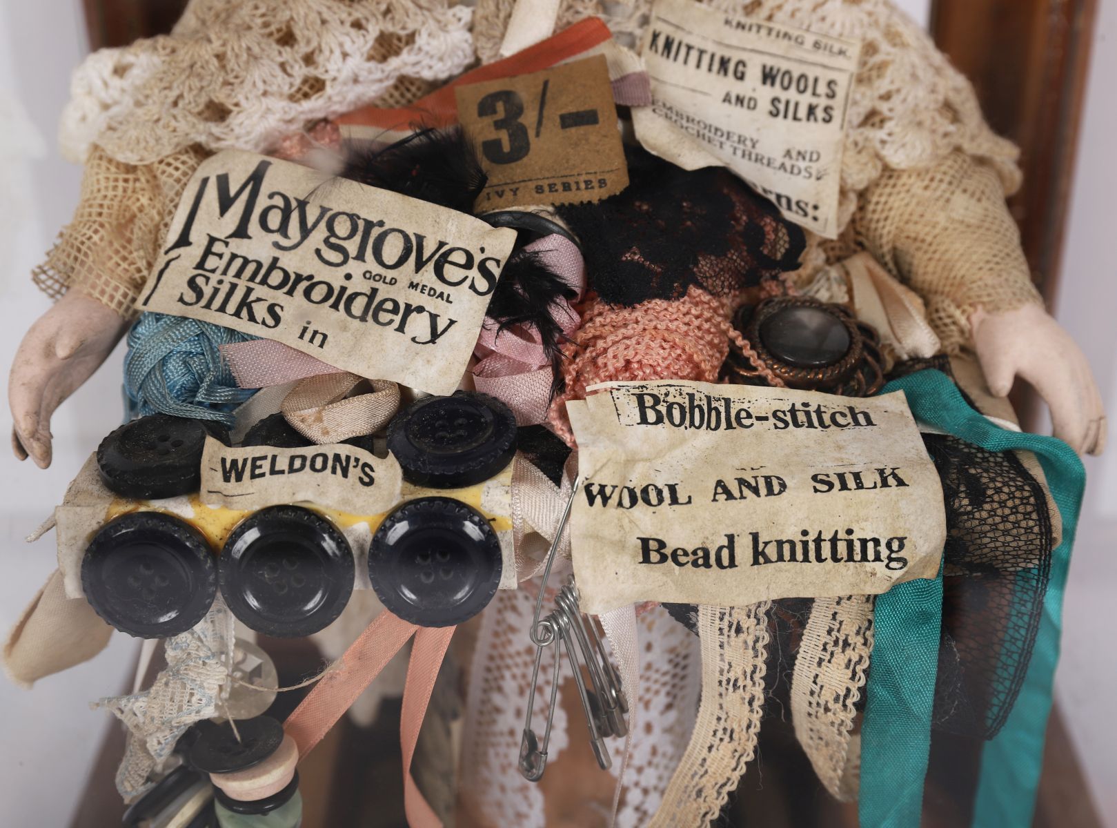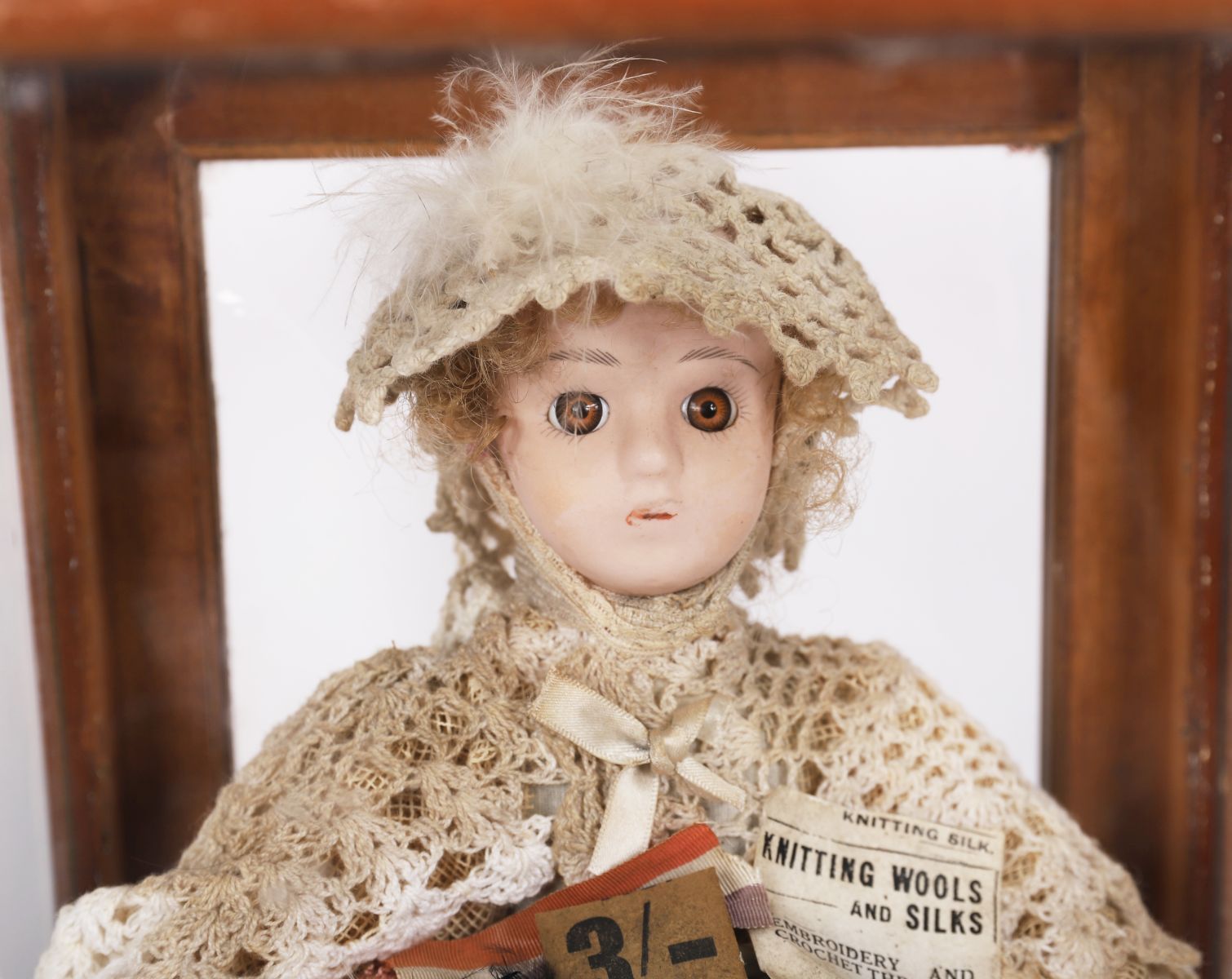 A late Victorian bisque-headed peddler doll wearing crochet garments and bonnet, displayed within a glazed wooden case, with miniature haberdashery items including ribbons, buttons, and silk packages.