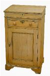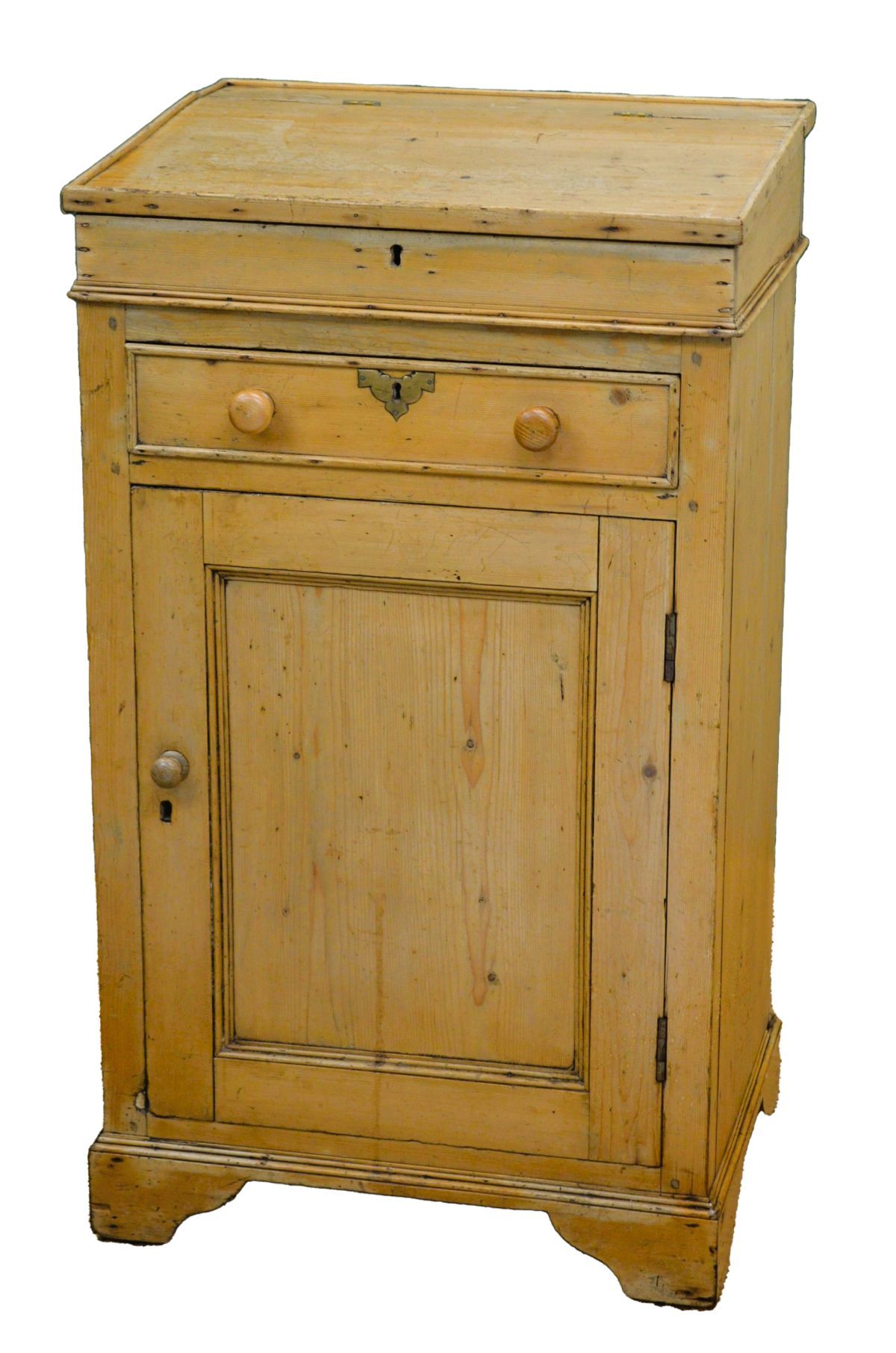 with sloped writing surface above a single drawer and cupboard door, raised on shaped bracket feet; typical of rural post offices or schools.