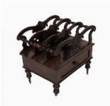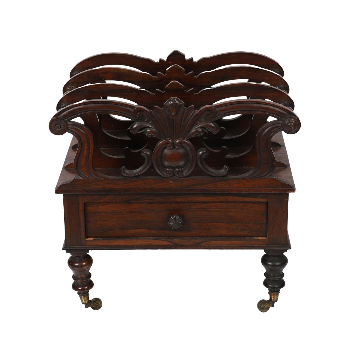 A Victorian rosewood Canterbury with pierced scroll dividers and single drawer, raised on turned legs with brass castors.