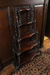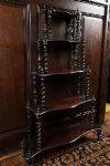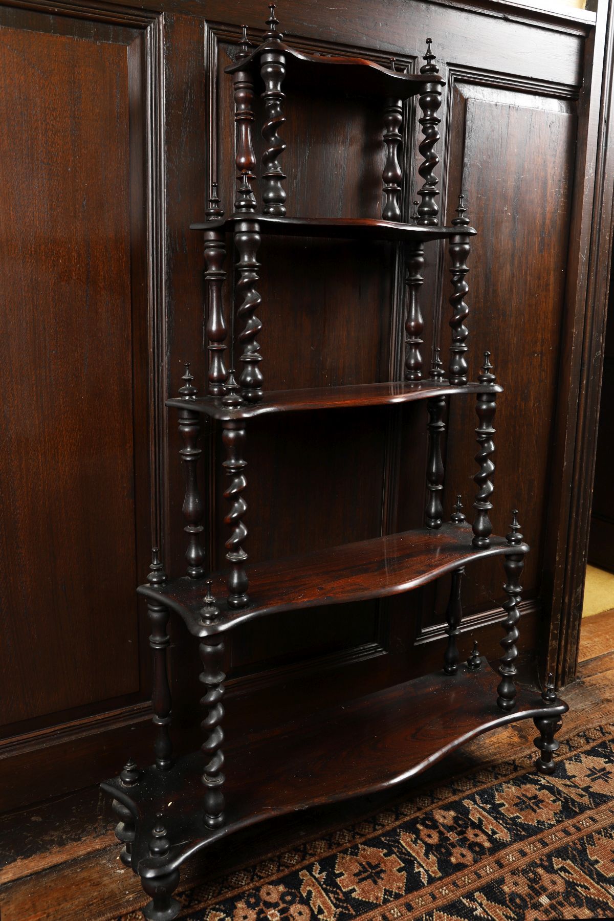 Victorian rosewood five-tier whatnot with turned supports and graduated shelves, raised on bun feet. Typical mid-19th-century form.