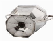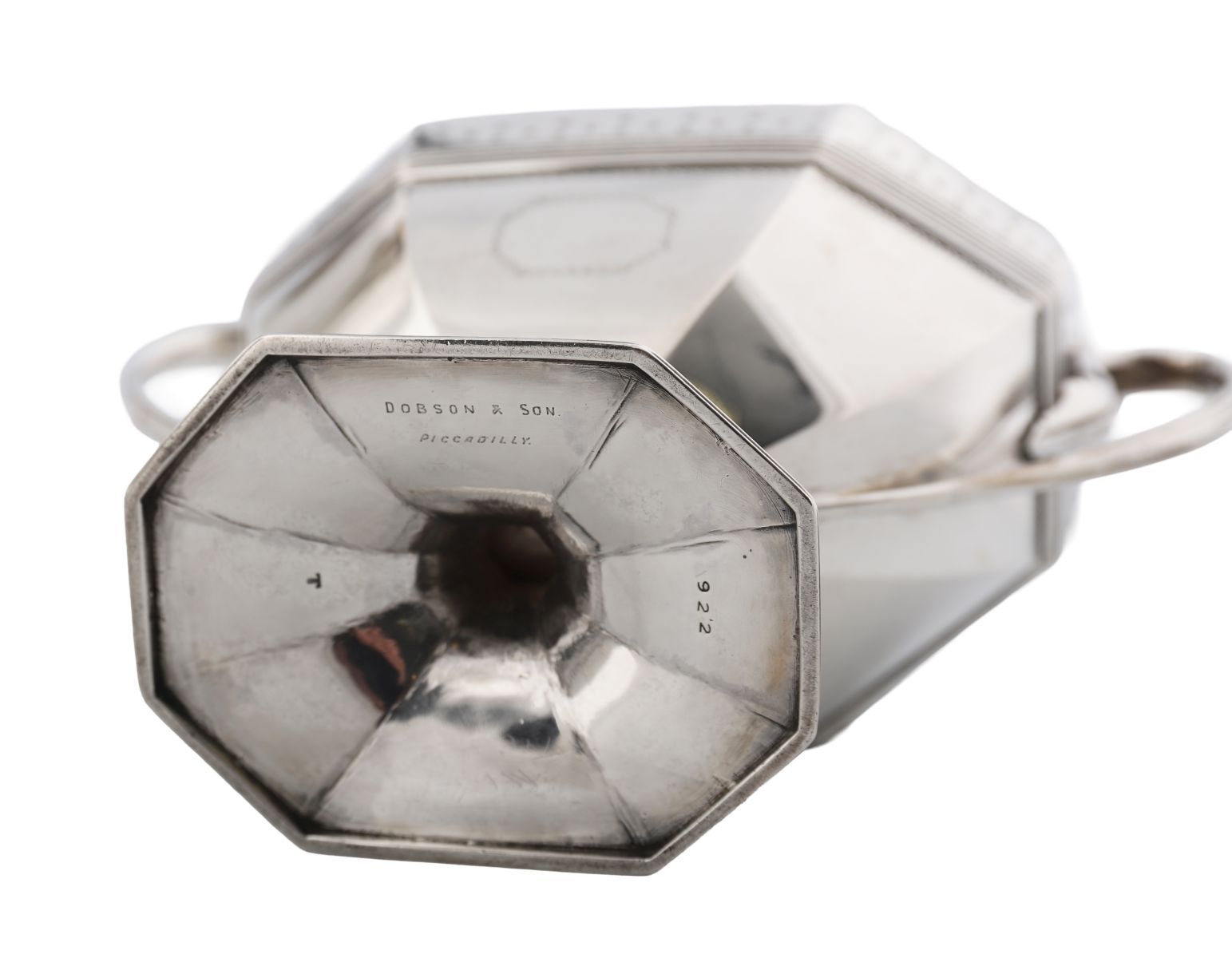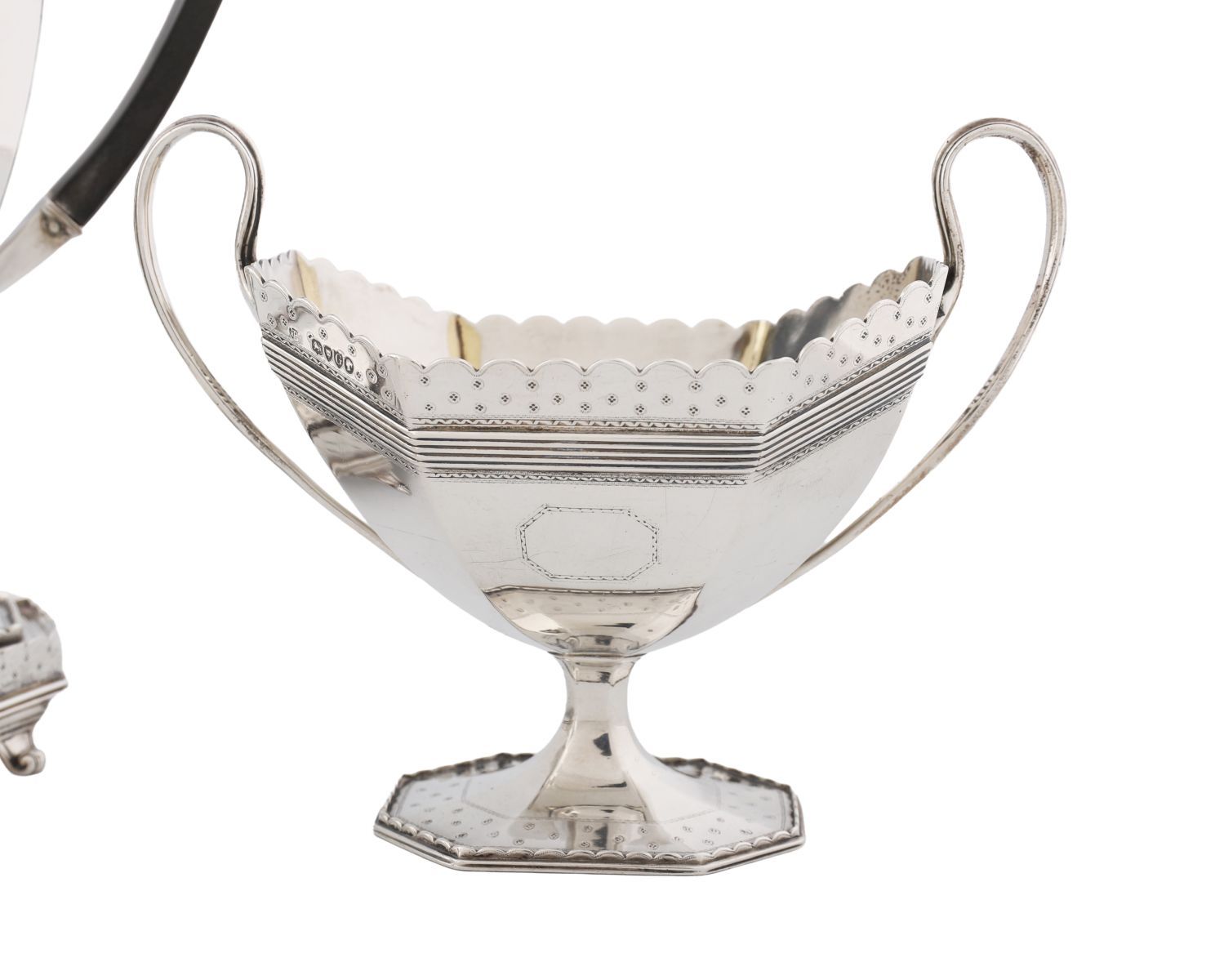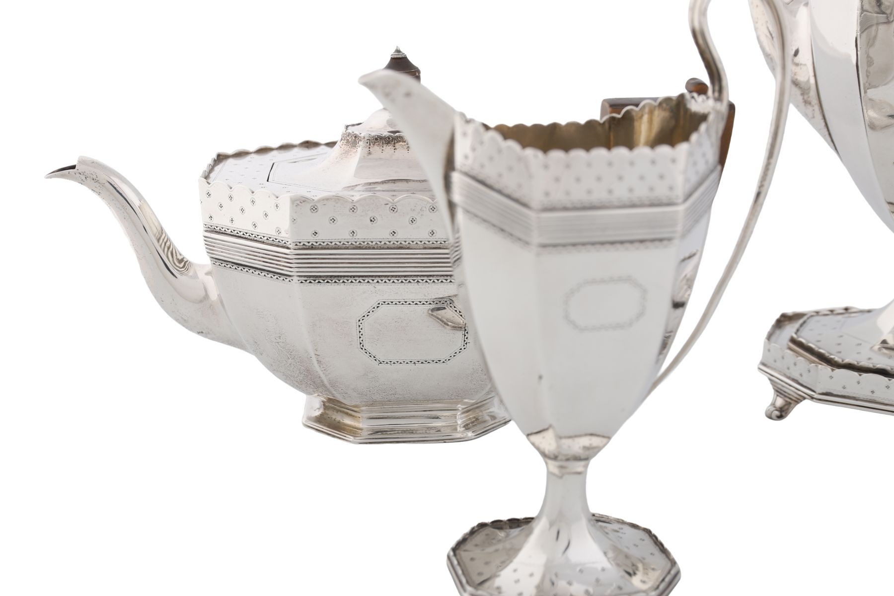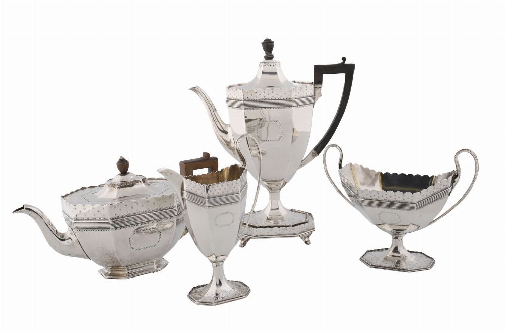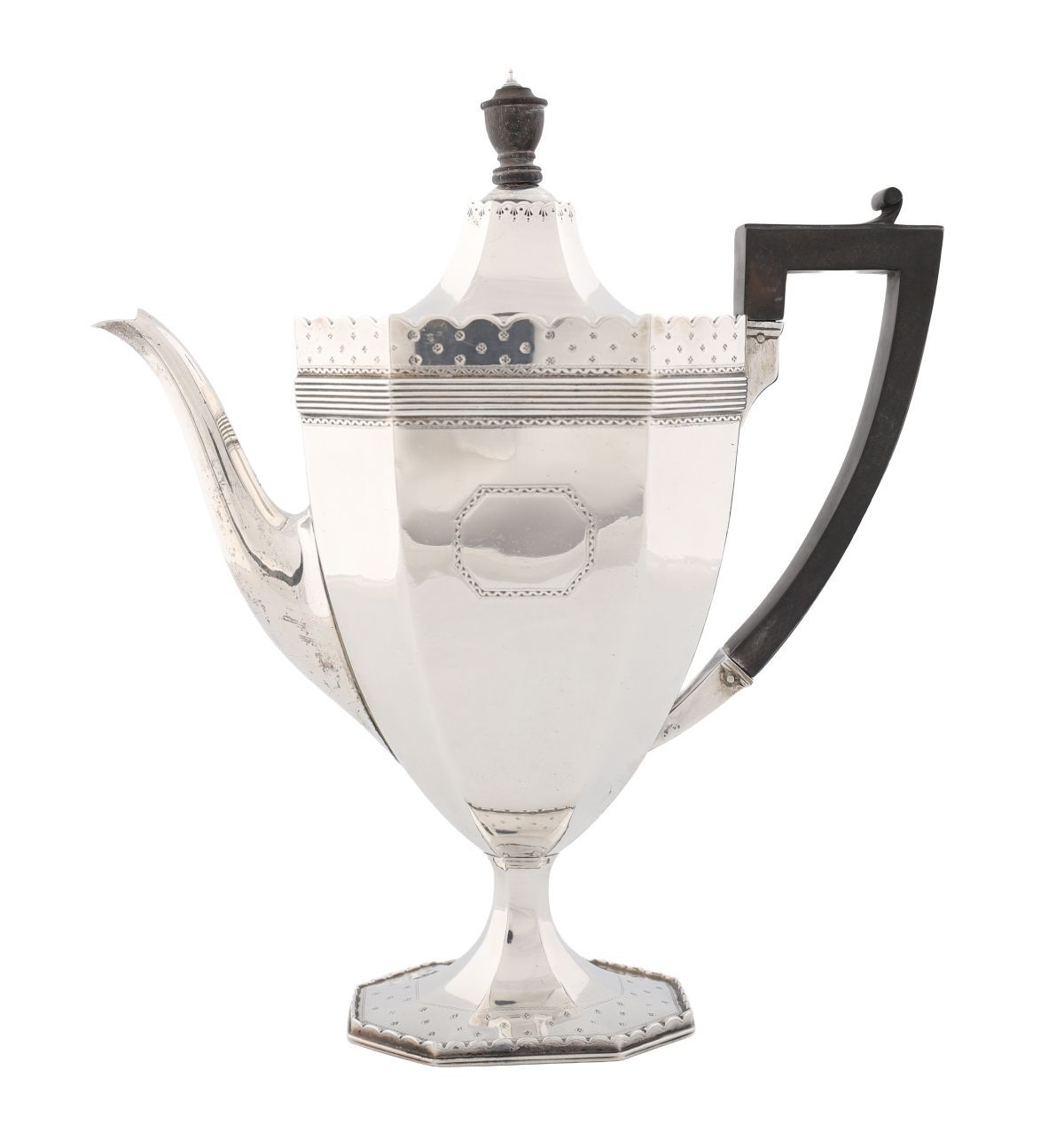 A Victorian silver octagonal five-piece tea and coffee service, mark of Walter & John Barnard, London 1882/3. Comprising teapot and stand, coffee pot, sugar bowl and cream jug; each bright-engraved with a castellated border and bead motif above a ribbed girdle, the tea and coffee pots with urn finials and wood handles. Approx. 2,139g