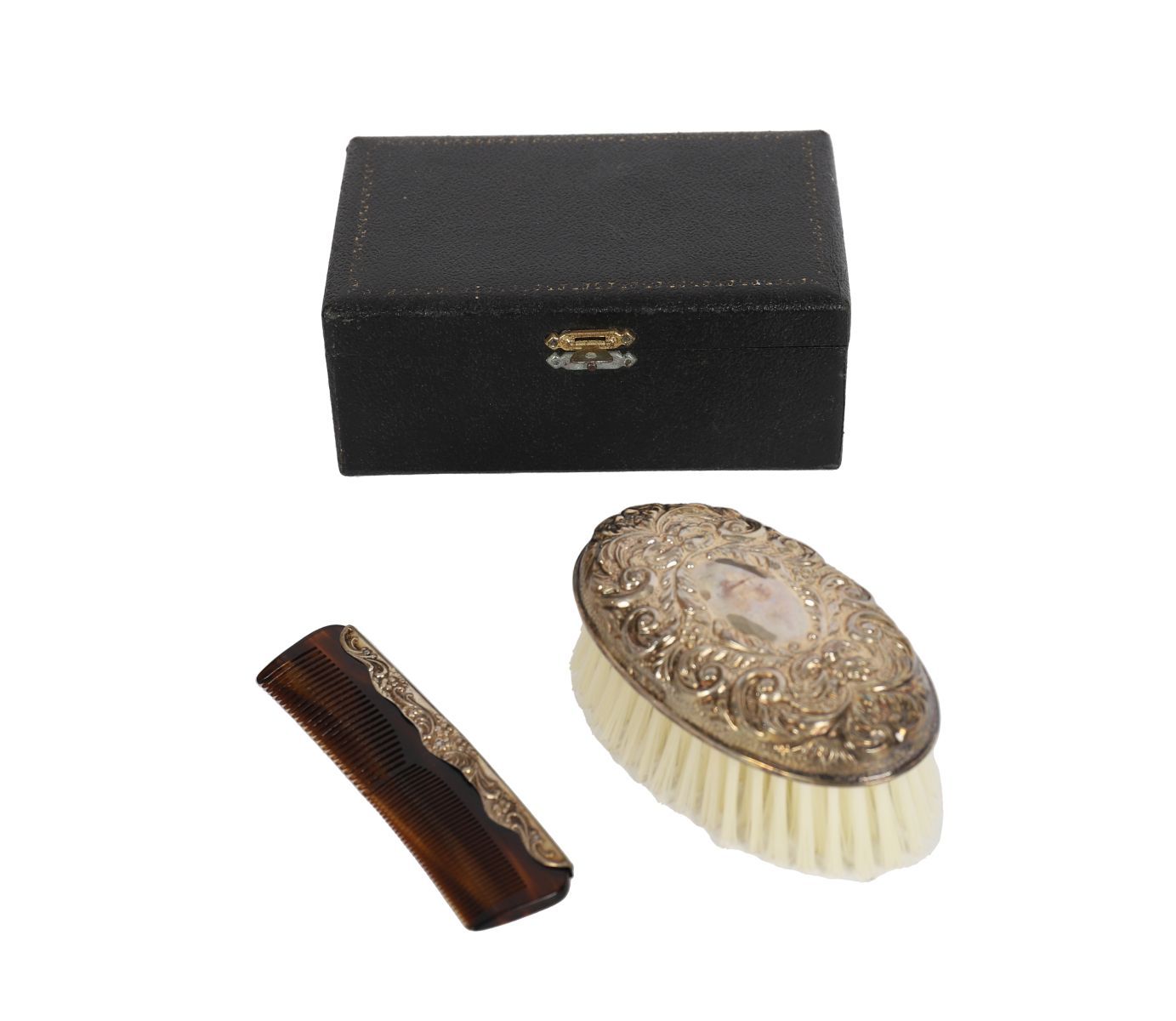 A Victorian silver-mounted hairbrush with embossed scrollwork decoration and vacant cartouche, bristle inset to reverse, bearing English hallmarks. Birmingham 1950.