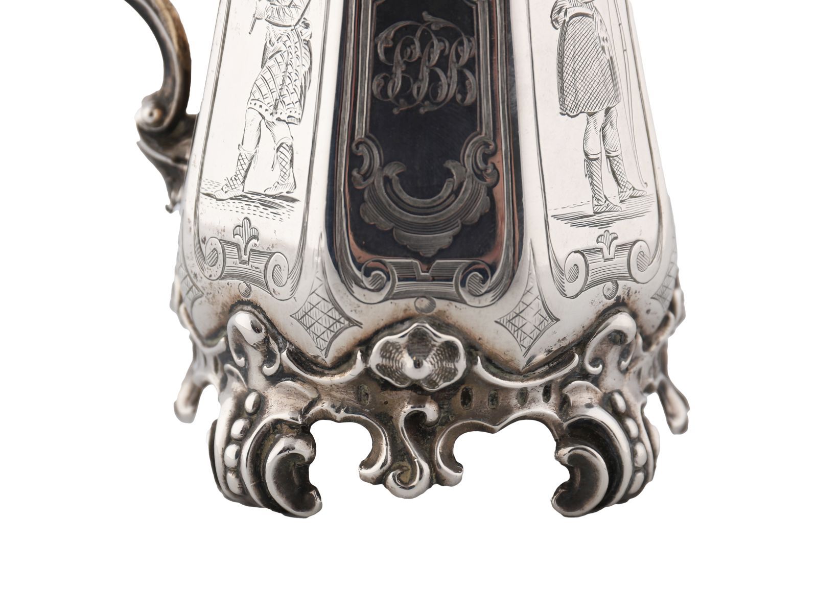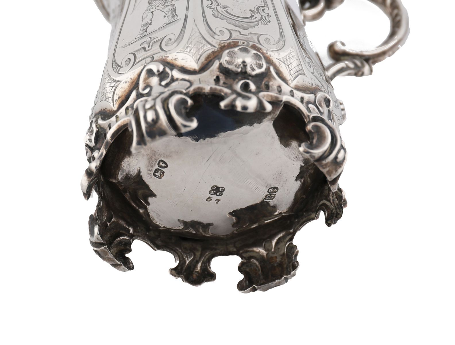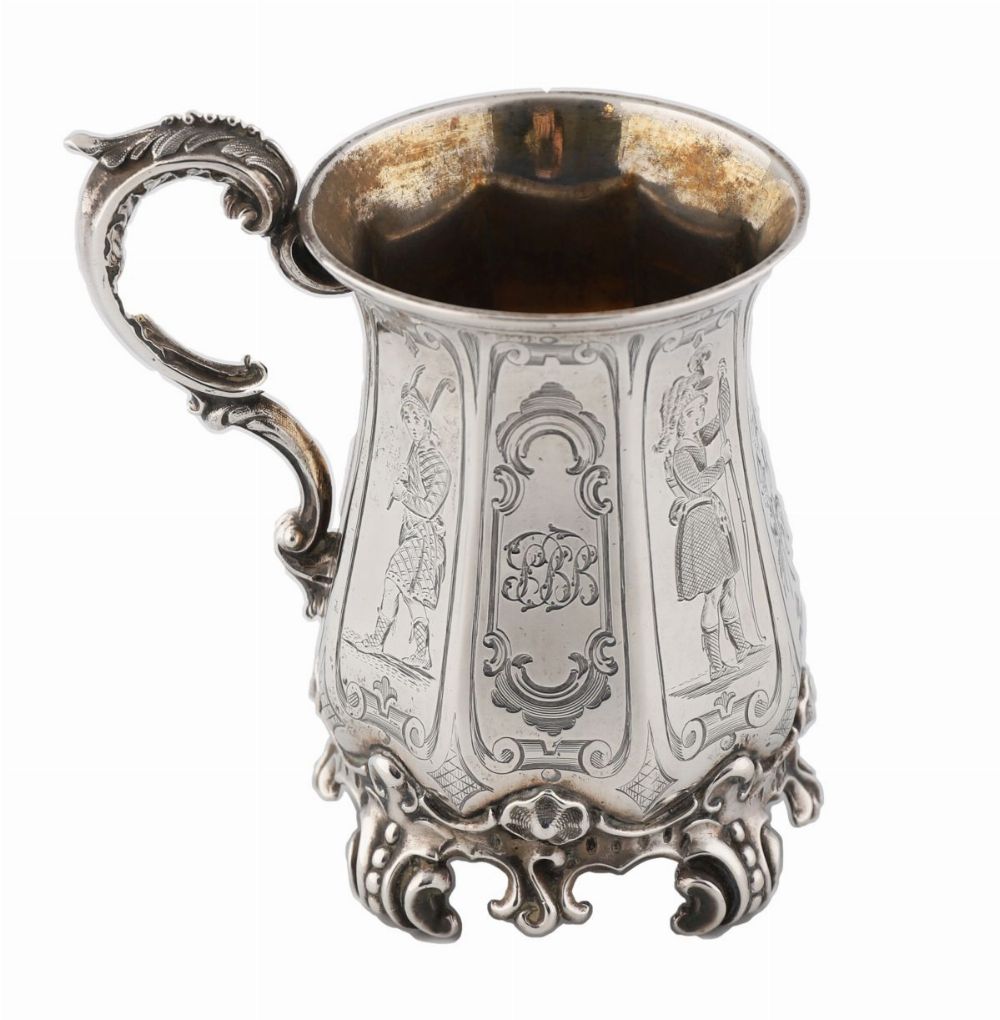 A fine Victorian silver mug by James & Nathaniel Creswick, the tapering body engraved with figures and scrollwork, with central cartouche dated June 9, 1853, raised on ornate scroll foot. Weight 189 g