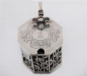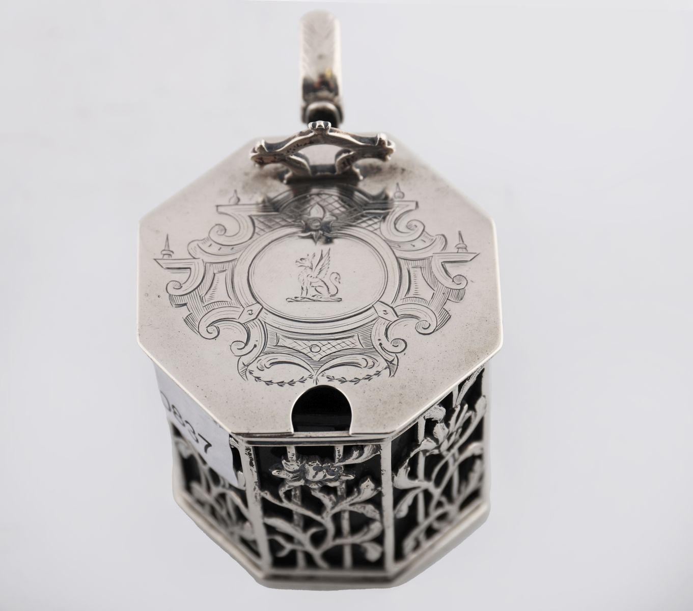 By Charles and George Fox, London 1853, of octagonal form with scroll handle, pierced foliate decoration, hinged cover with engraved decoration and crest, with blue glass liner; approx. weight 4.5 oz. The crest used by families including Belcher, Foote, Gell, Halford and Walker.