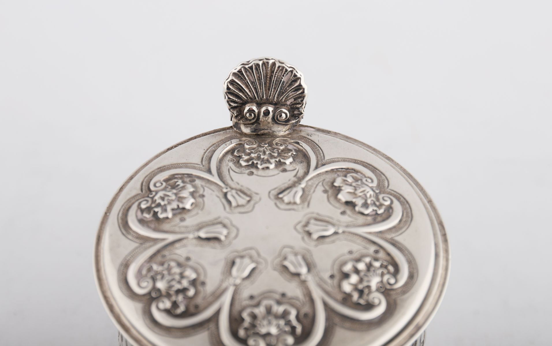 By George Adams, London 1862, circular form with chased foliate and shell decoration on a matted background, hinged cover with shell thumbpiece and scroll handle, with blue glass liner; approx. weight 4 oz.