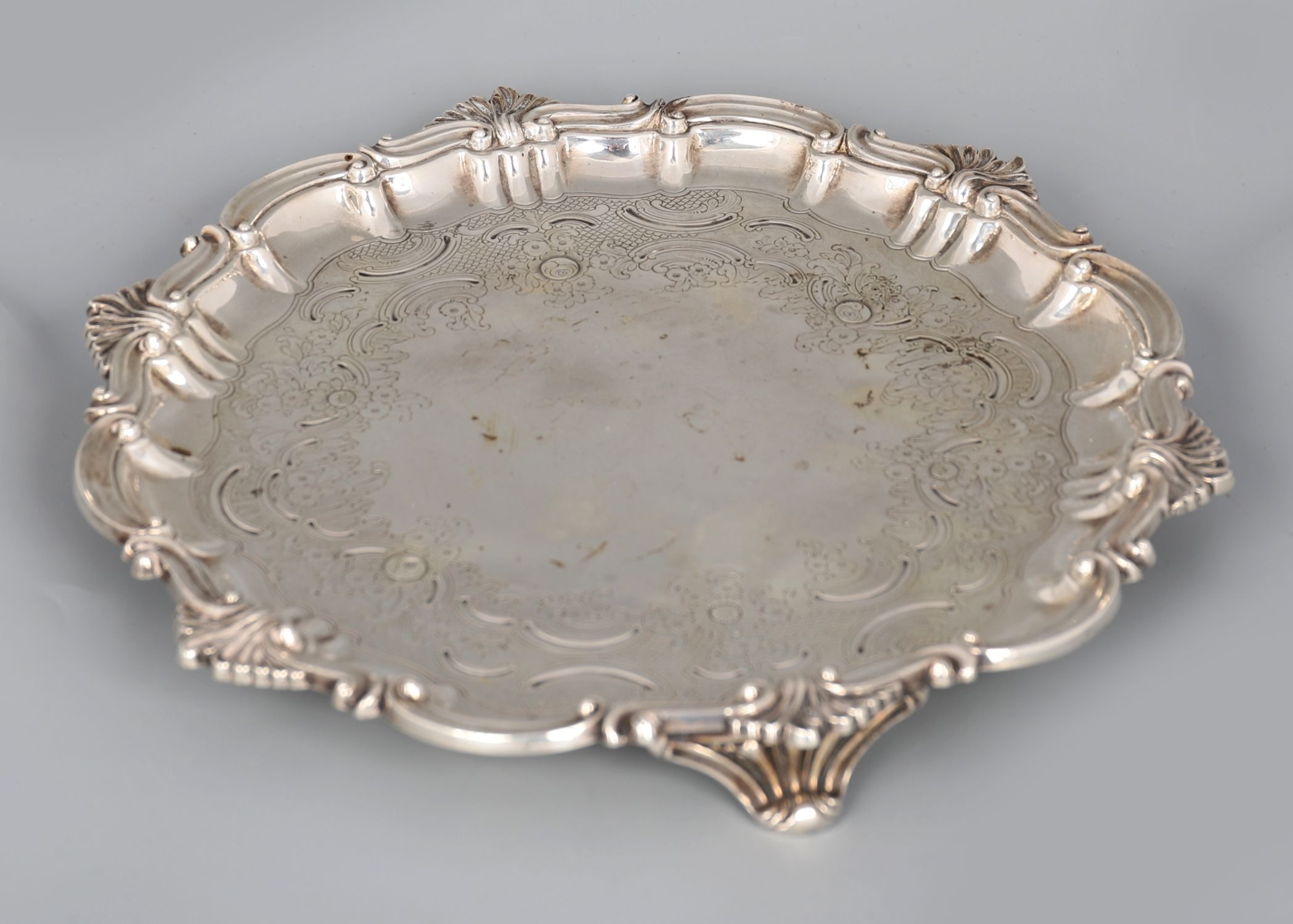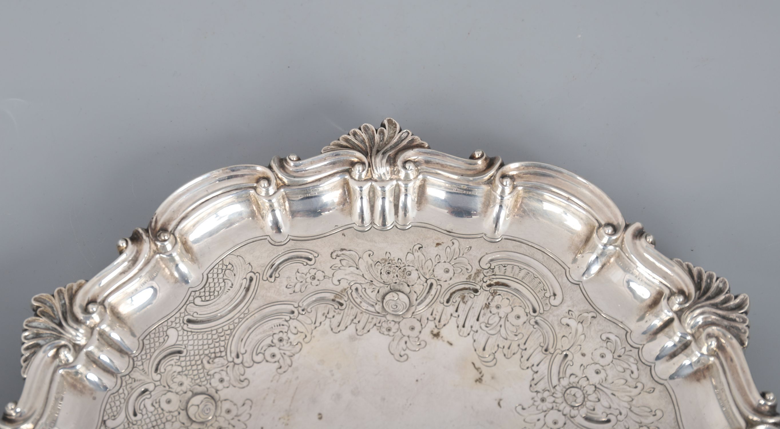 A fine Victorian silver salver of circular form with cast and applied rococo scroll border, the centre engraved with foliate and diaper decoration. Stamped West & Son, College Green, Dublin and hallmarked London, 1893, maker Thomas Bradbury. 666 grams.