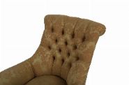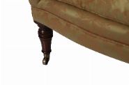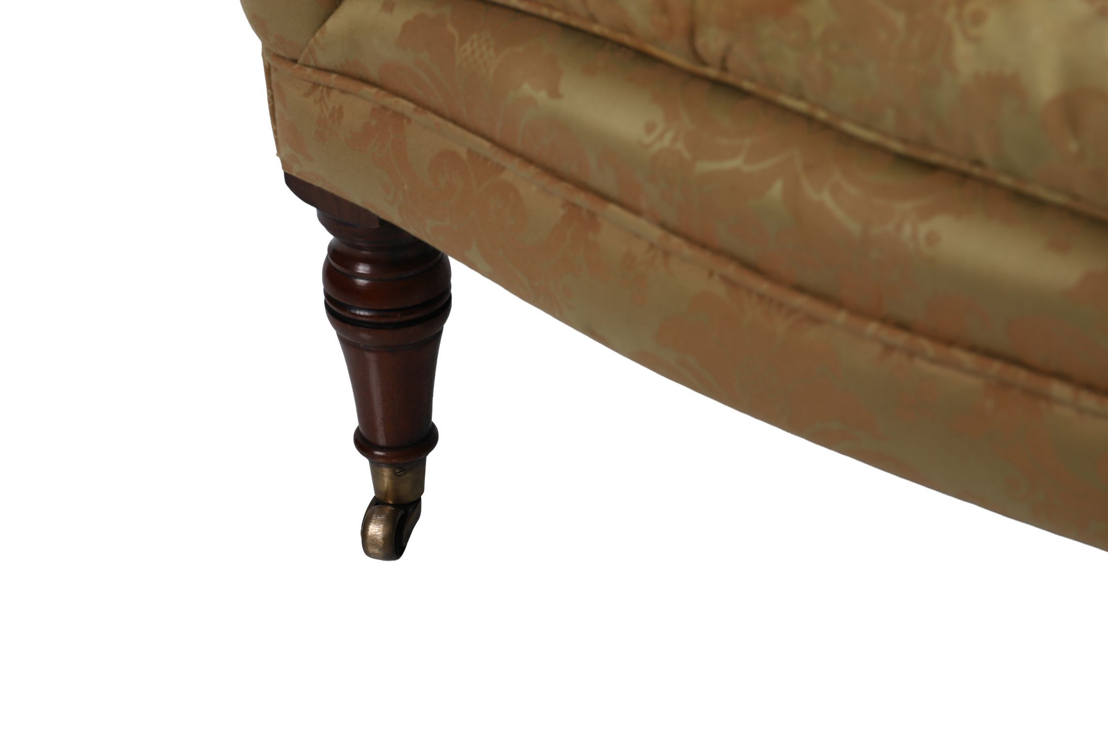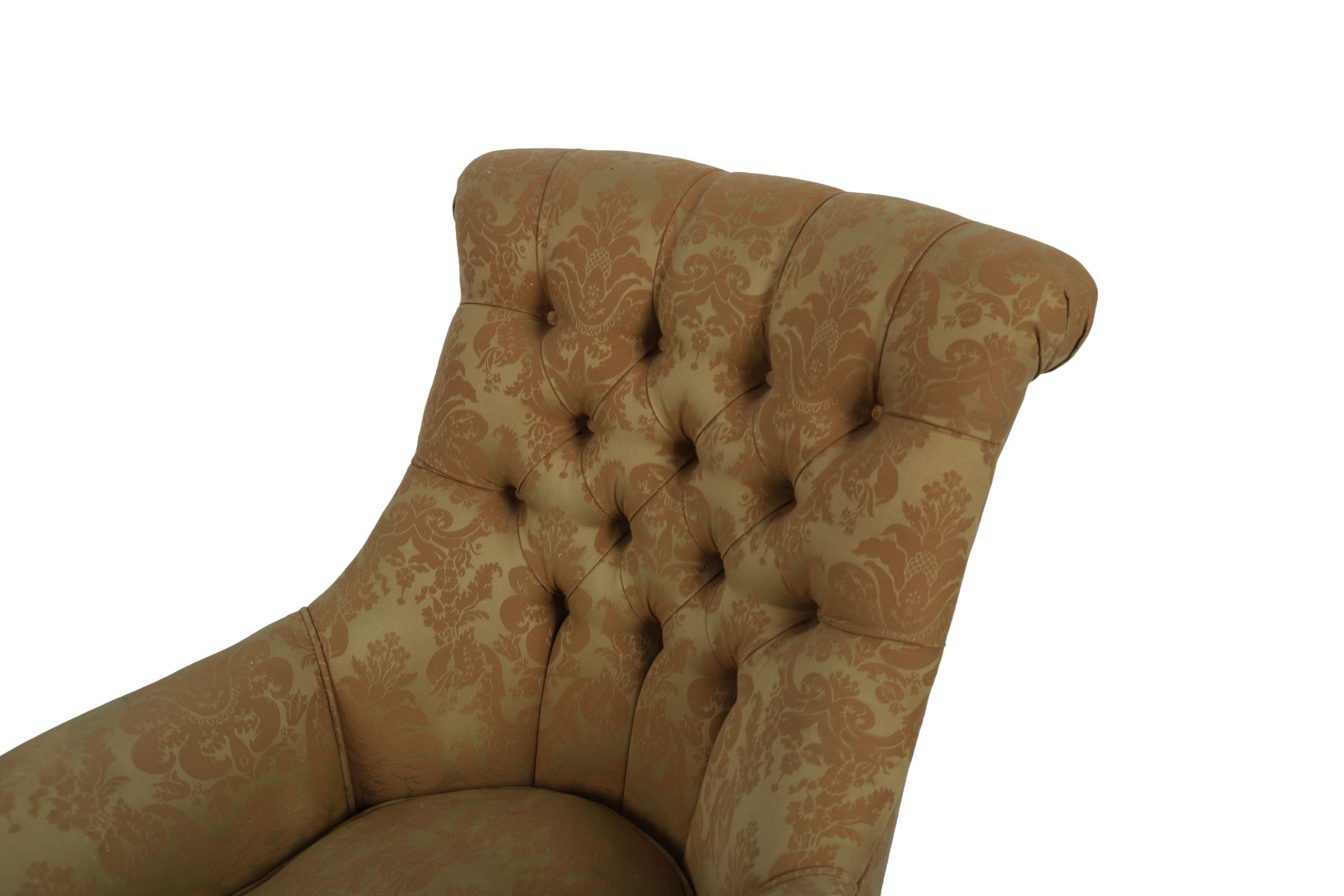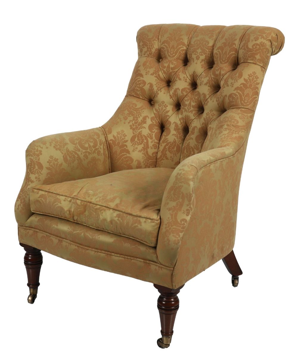 A Victorian style upholstered armchair, with button-back and scroll-over cresting, covered in gold damask fabric. Raised on turned mahogany forelegs and outswept back legs, all terminating in brass castors.