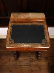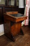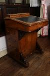 Victorian walnut davenport with hinged leather writing slope, fitted interior drawers and side drawers, raised on carved supports and decorated with inlaid detail.