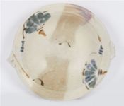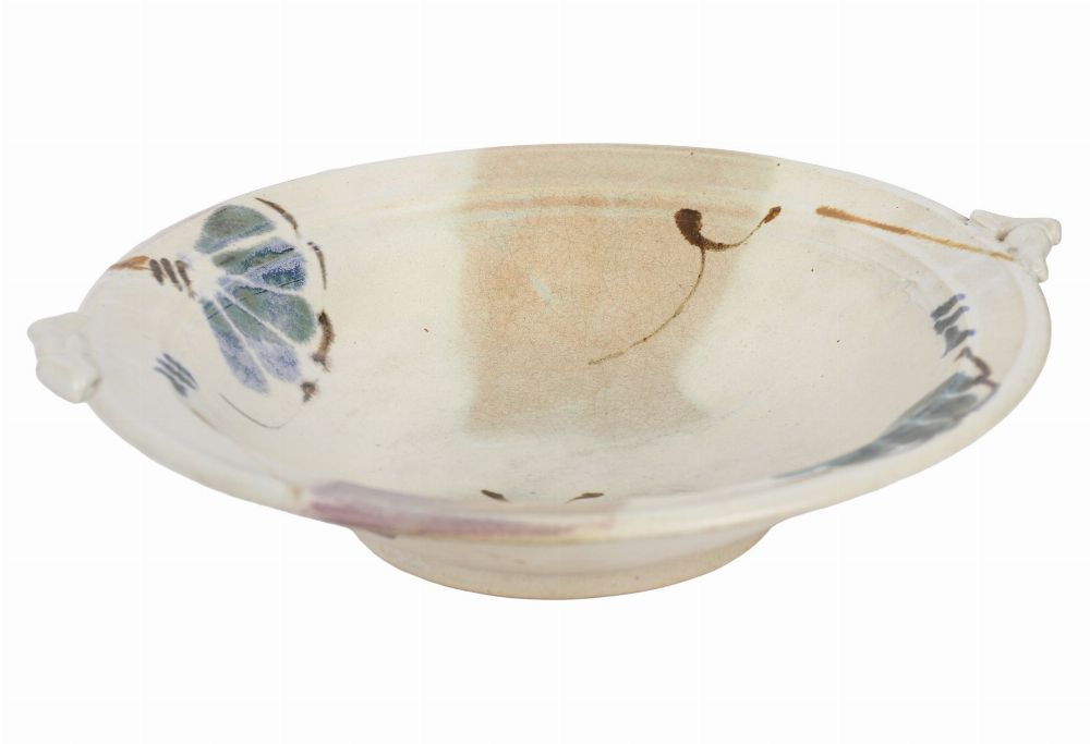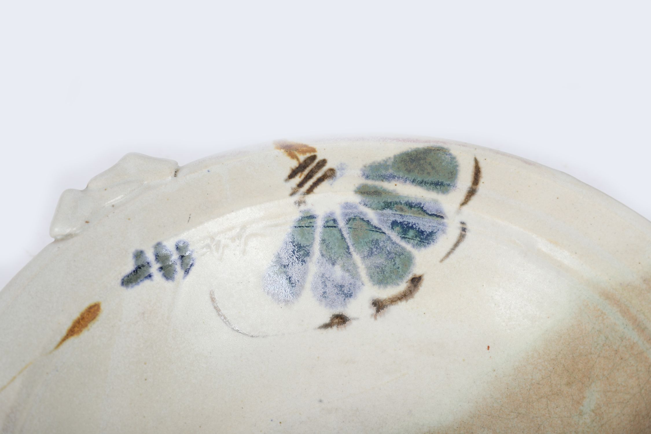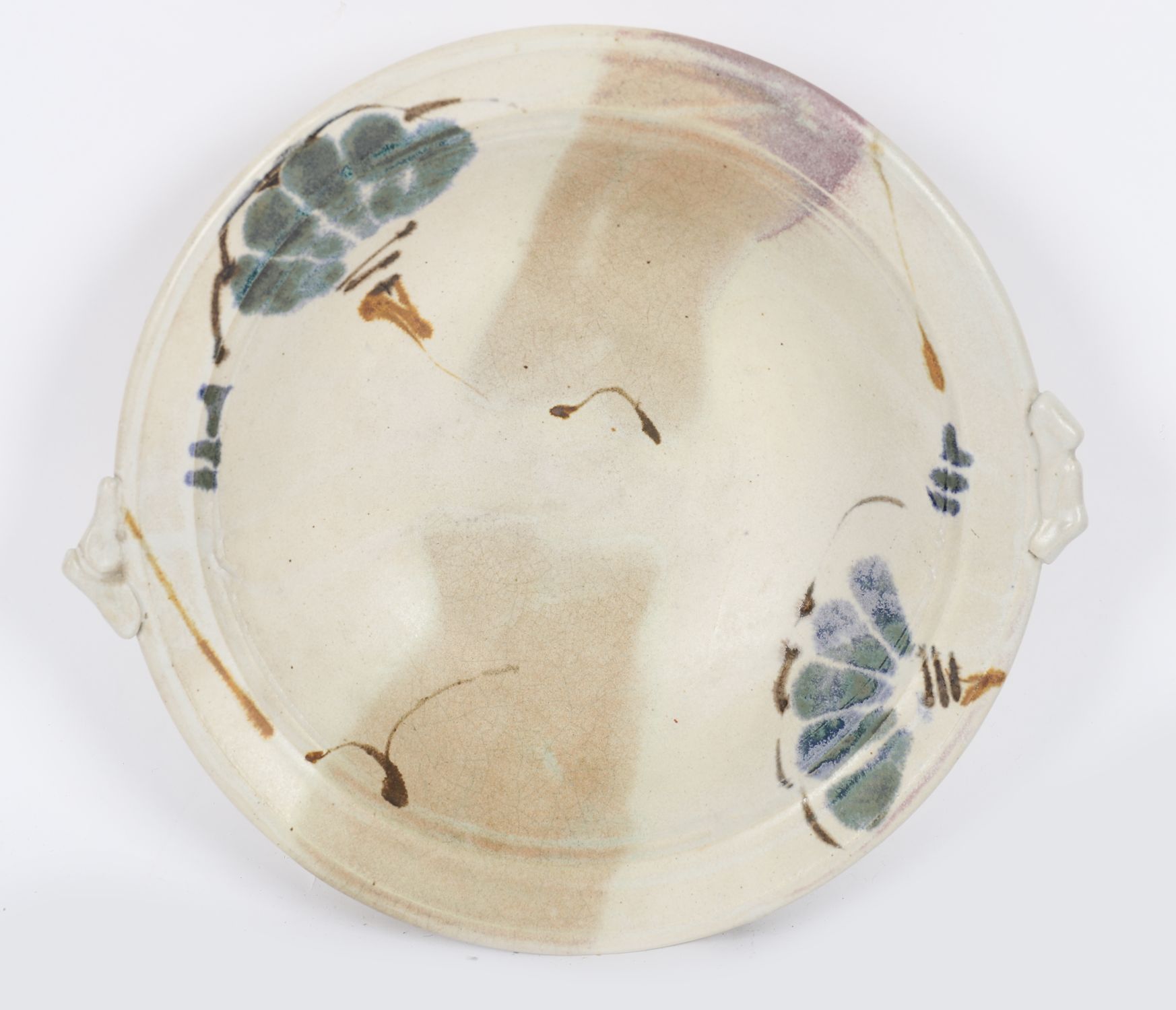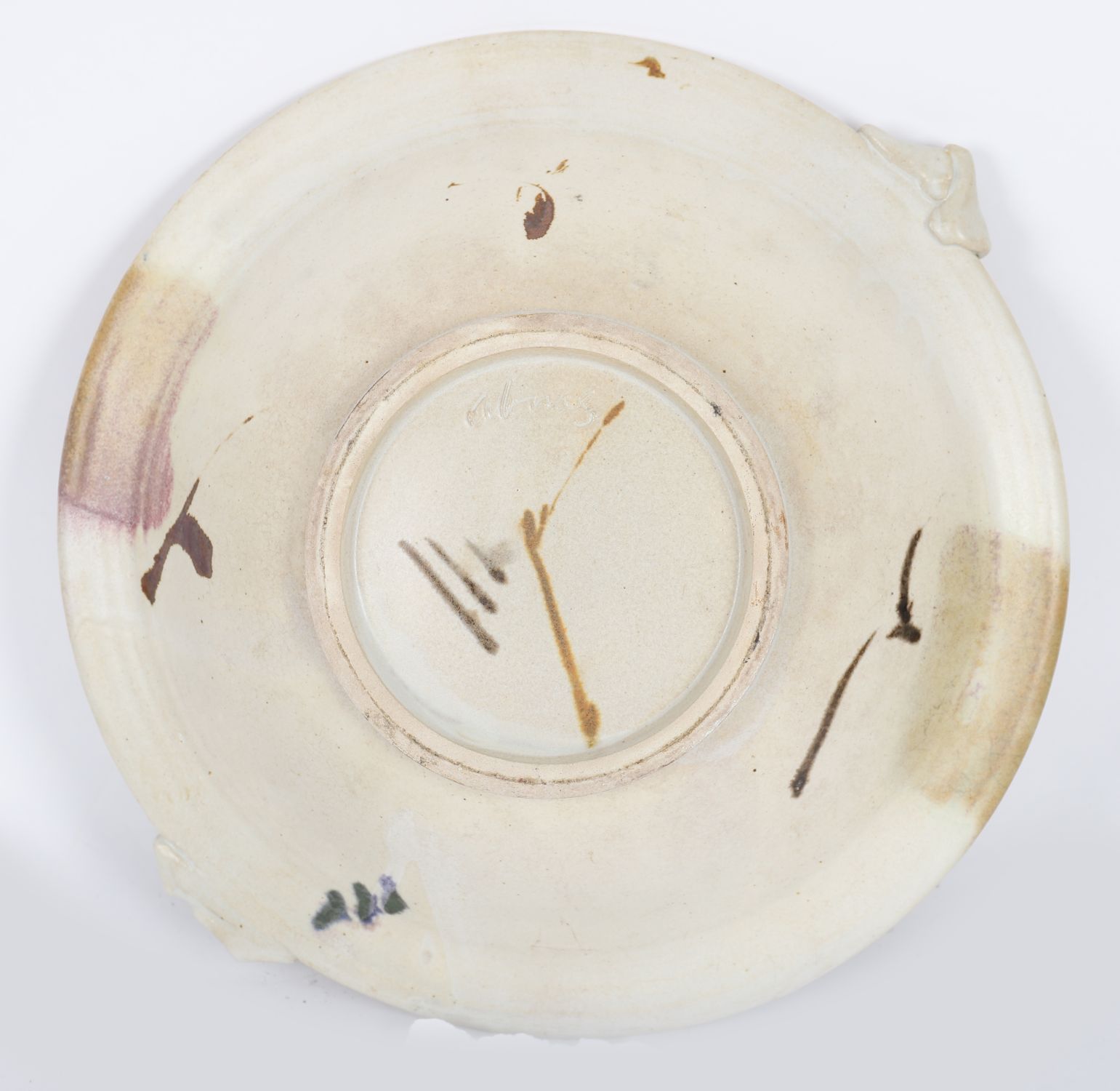 A studio pottery charger with painterly floral motifs in muted glazes, the surface with naturalistic brushstrokes and a soft crackle to the glaze.