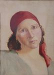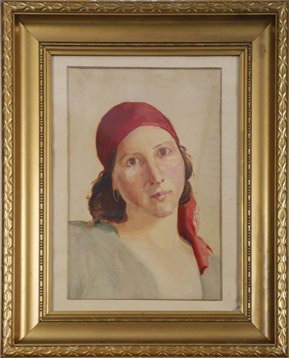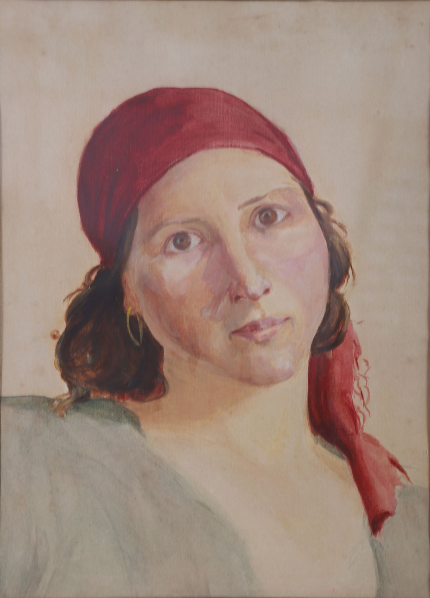 Tempera on paper, depicting a head-and-shoulders portrait of a woman wearing a red headscarf and gold hoop earring. Presented in a gilt frame. Tempera on paper.