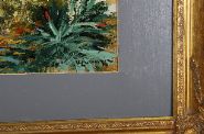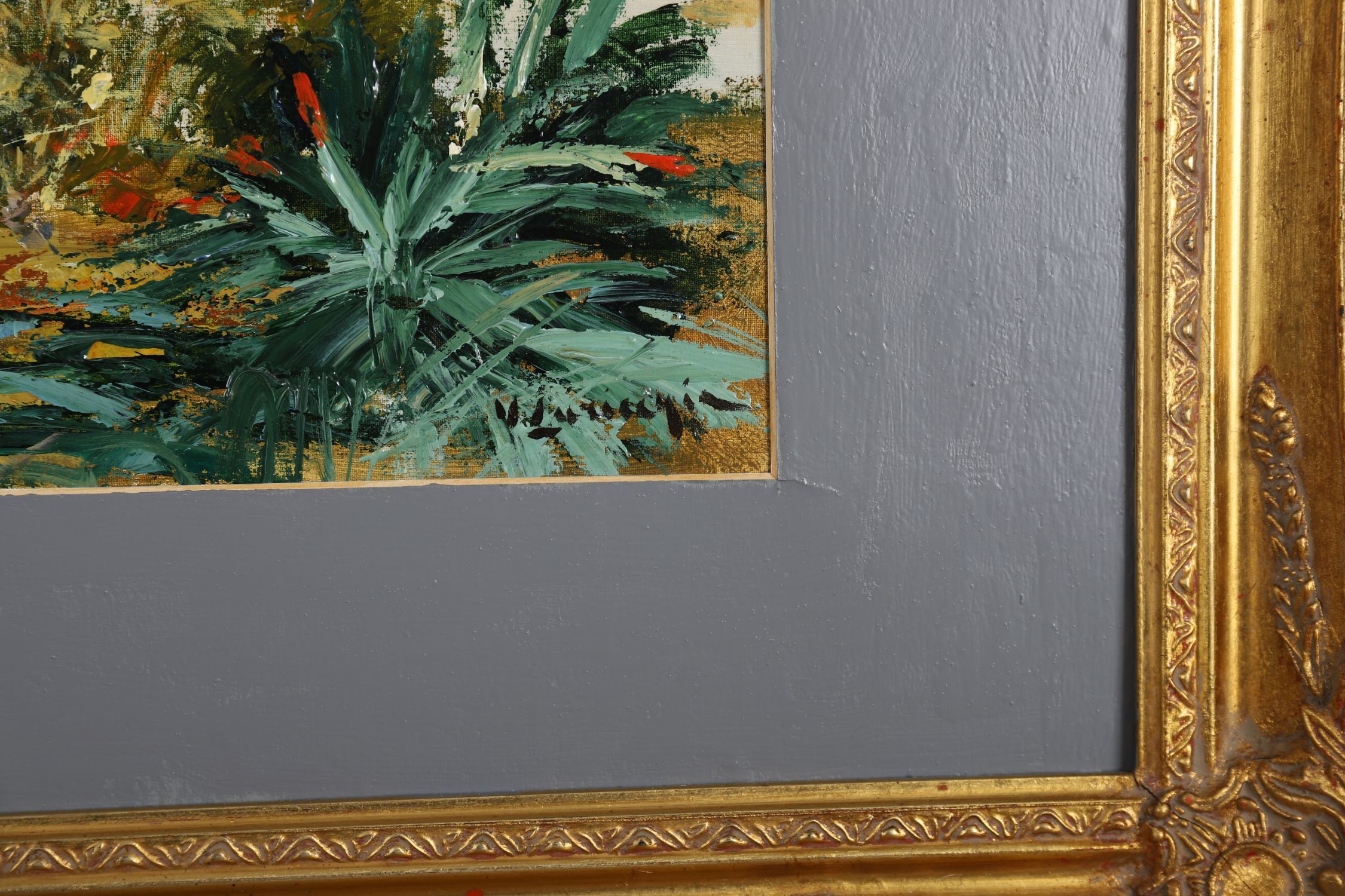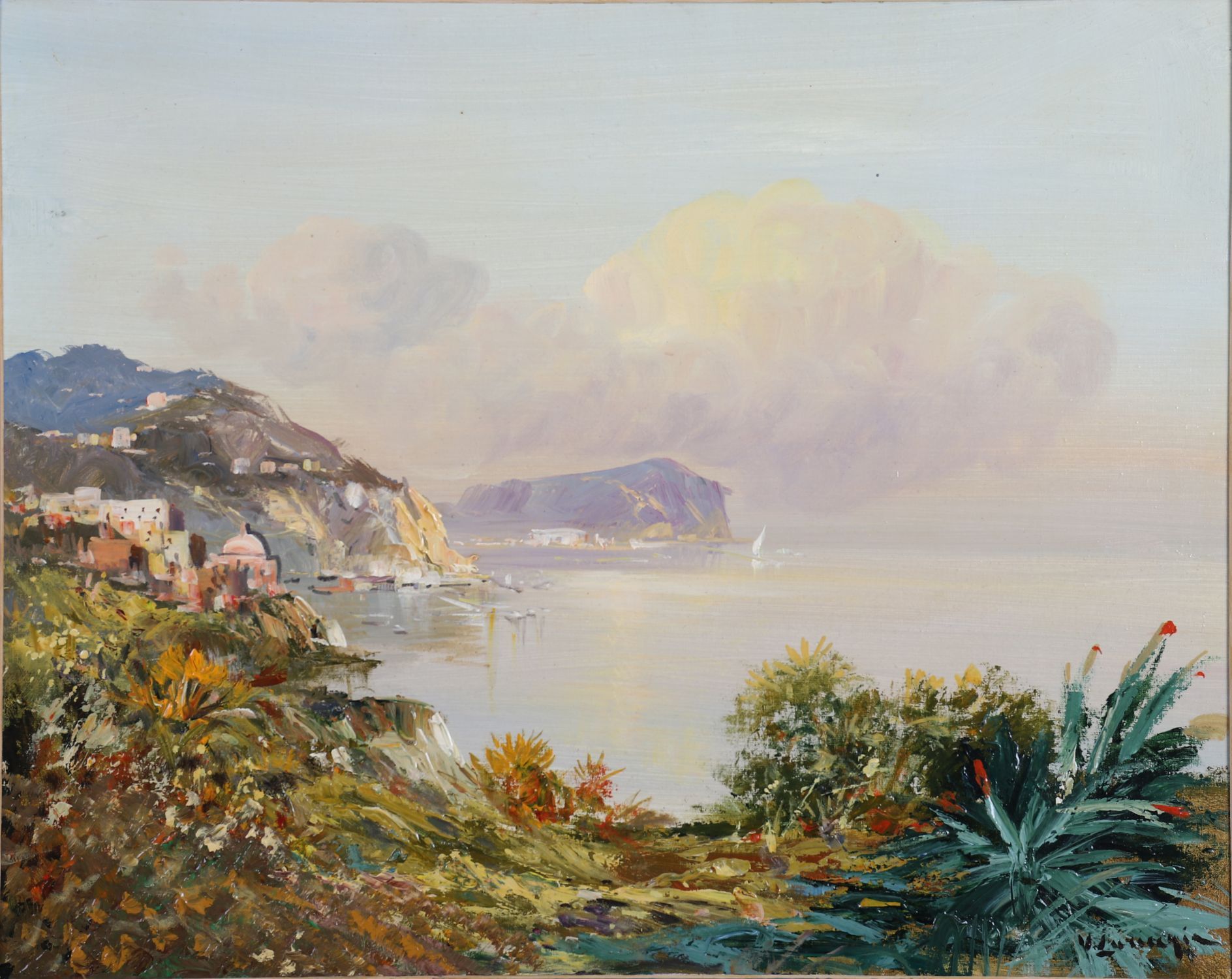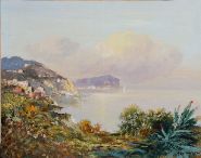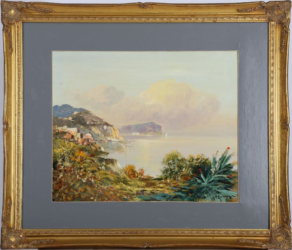 Le Isole di Napol. A vibrant oil painting of a Mediterranean coastal town with colourful vegetation and distant cliffs under a golden sky. Presented in a gilt frame with grey mount. Oil on canvas.