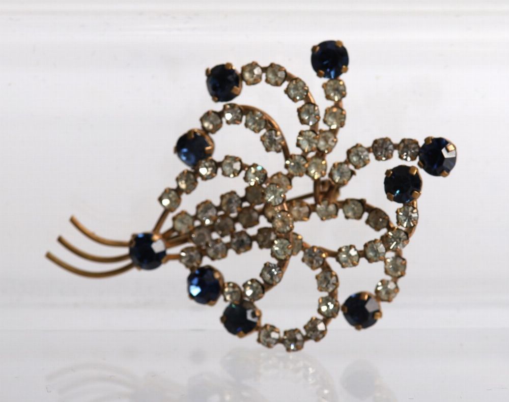 with blue and clear stones. A mid-20th century gilt metal spray-form brooch set with clear and deep blue faceted rhinestones, arranged in scrolling openwork clusters with radiating stems. Fitted with a pin and clasp to reverse.