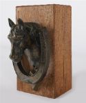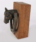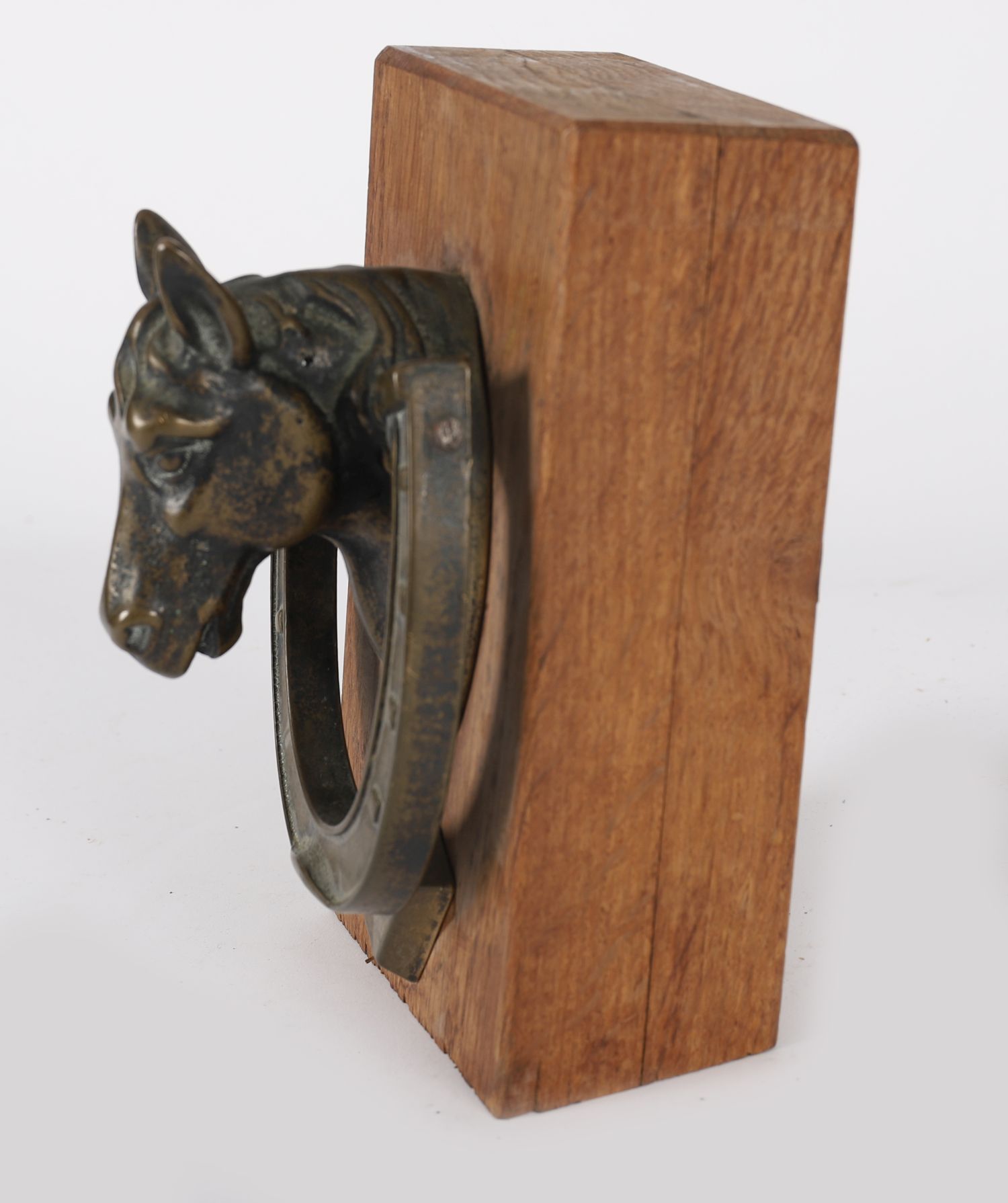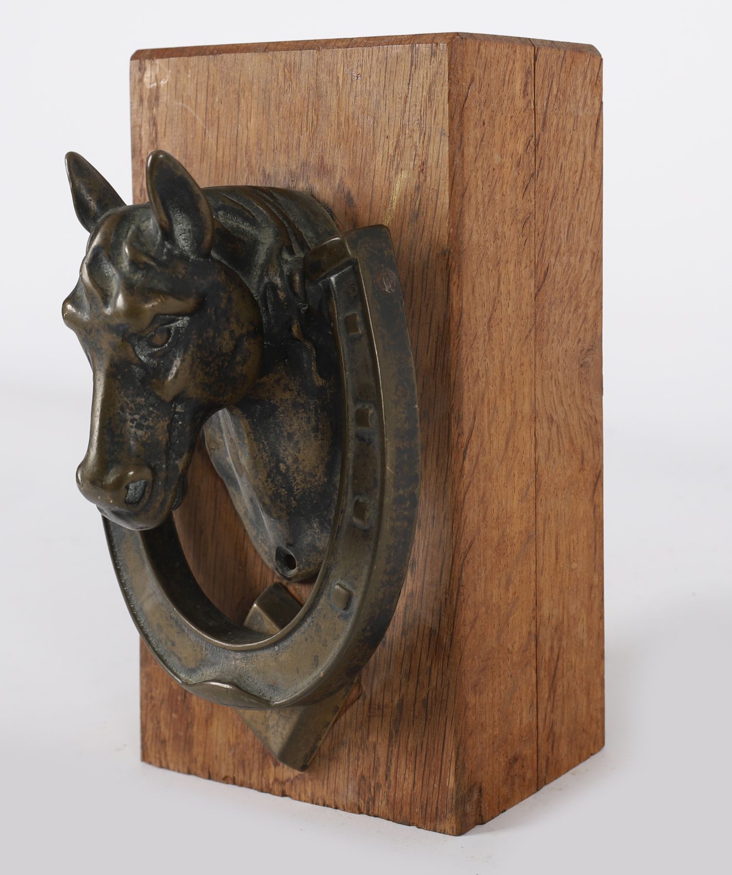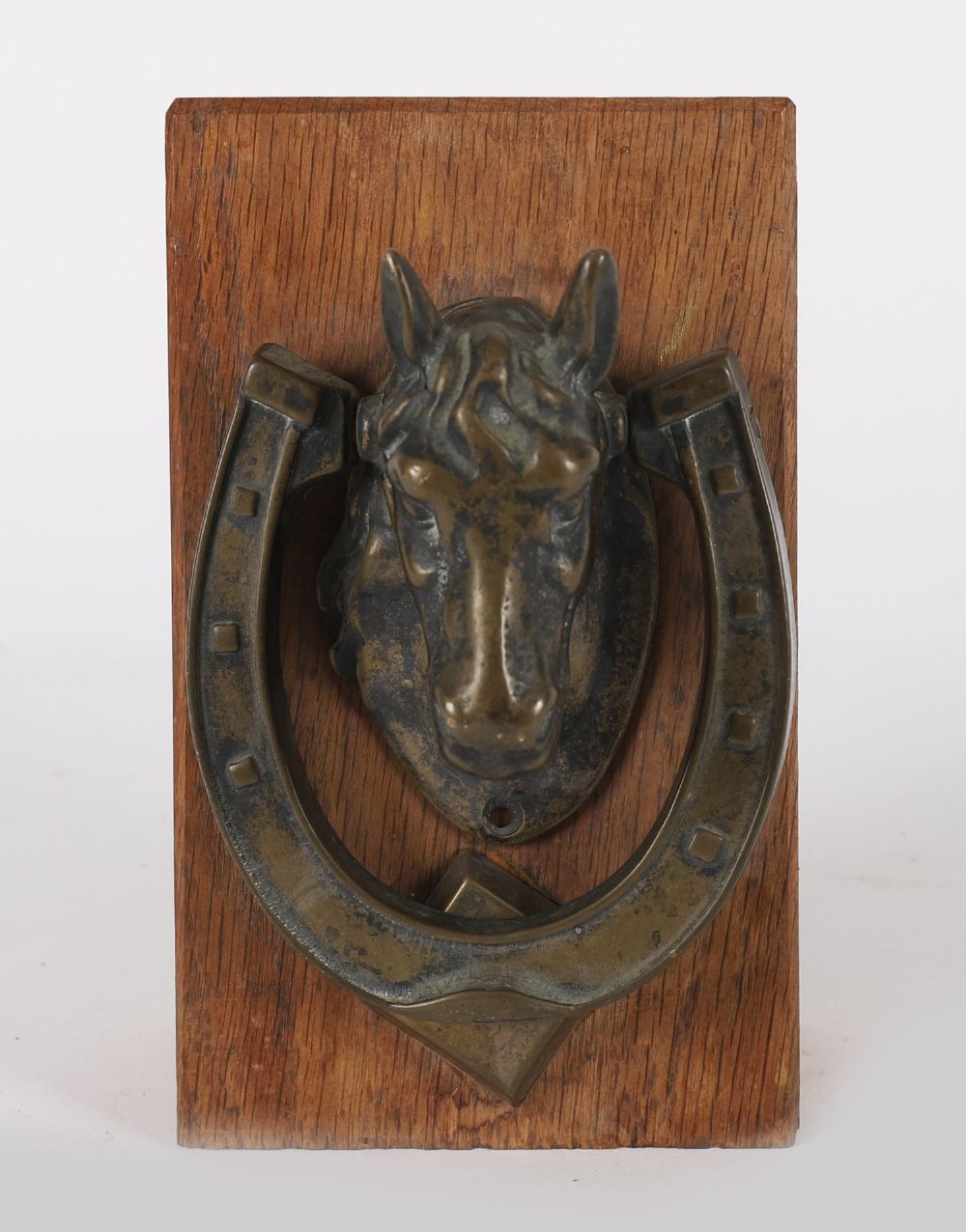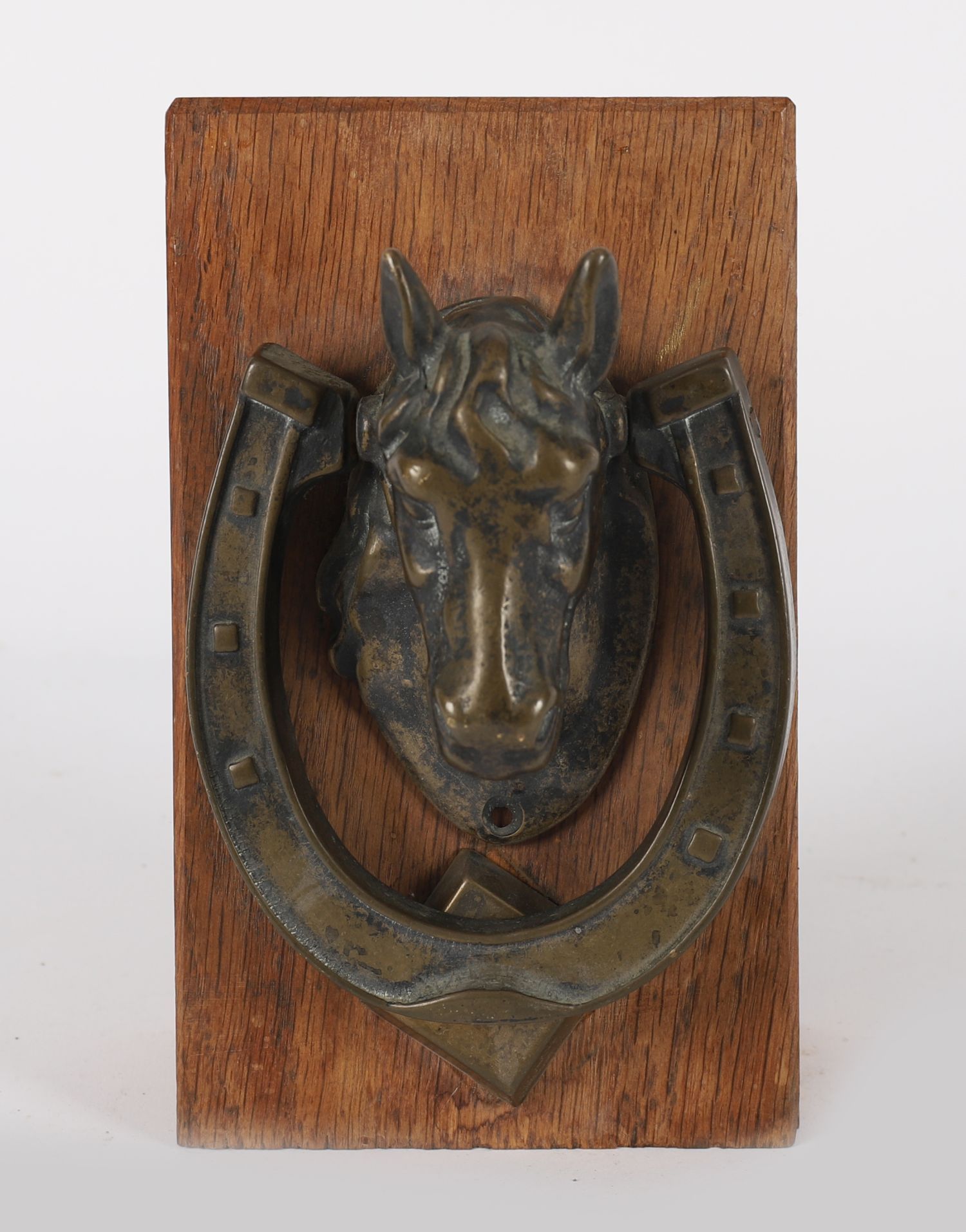 A vintage brass door knocker modelled as a horse's head within a horseshoe, mounted on an oak backplate.