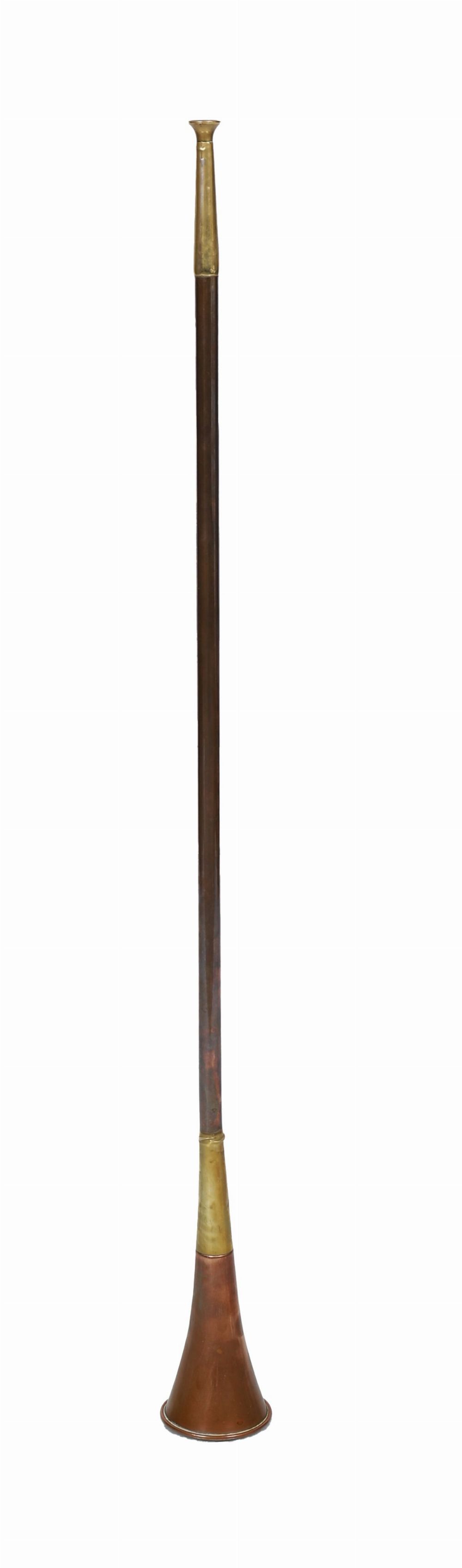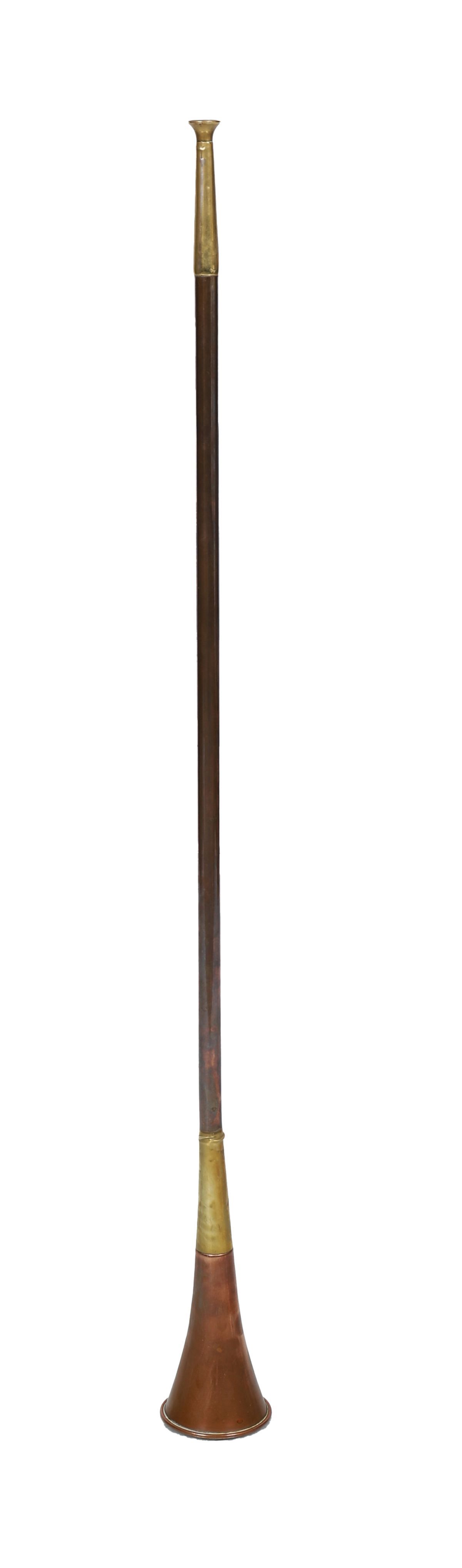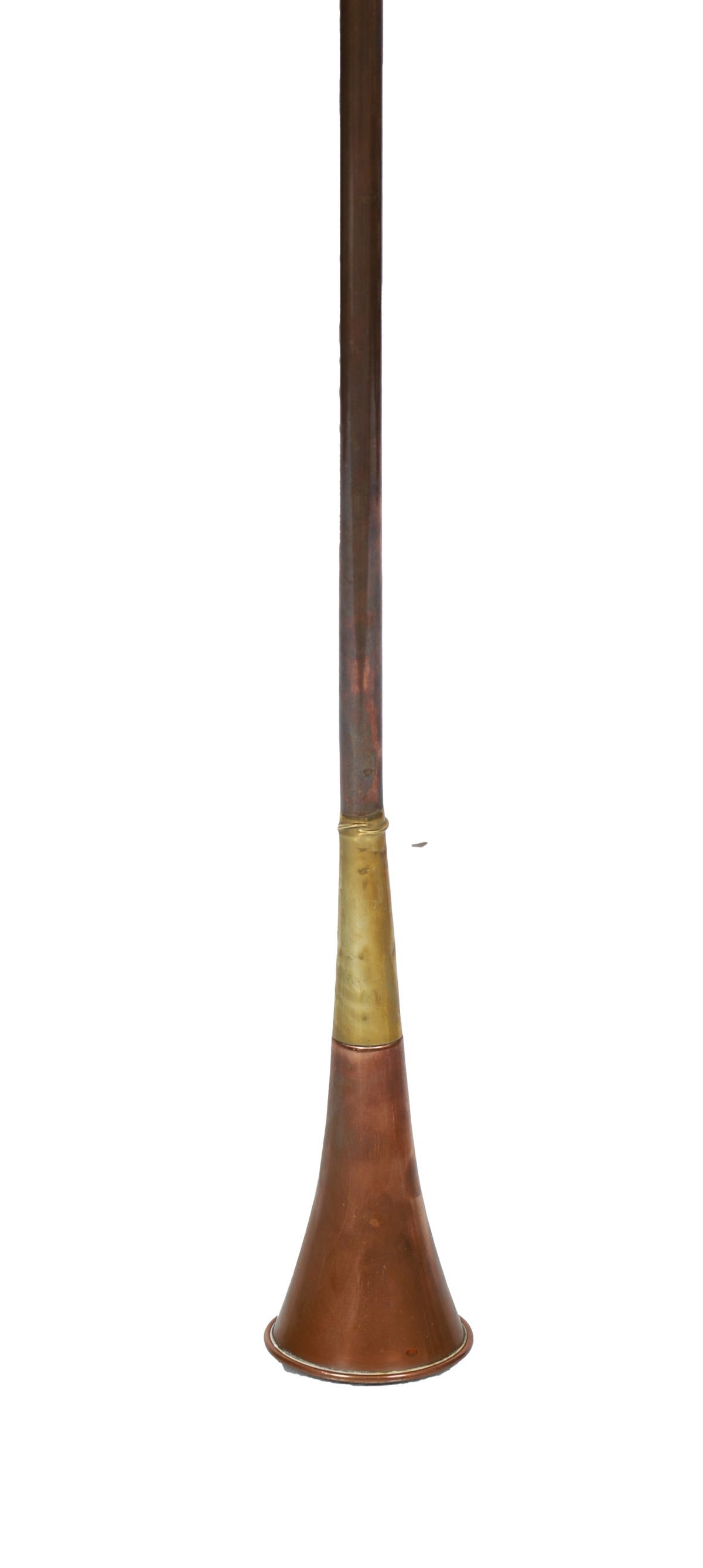 A long copper hunting horn with flared bell and brass mounts to mouthpiece and joint.